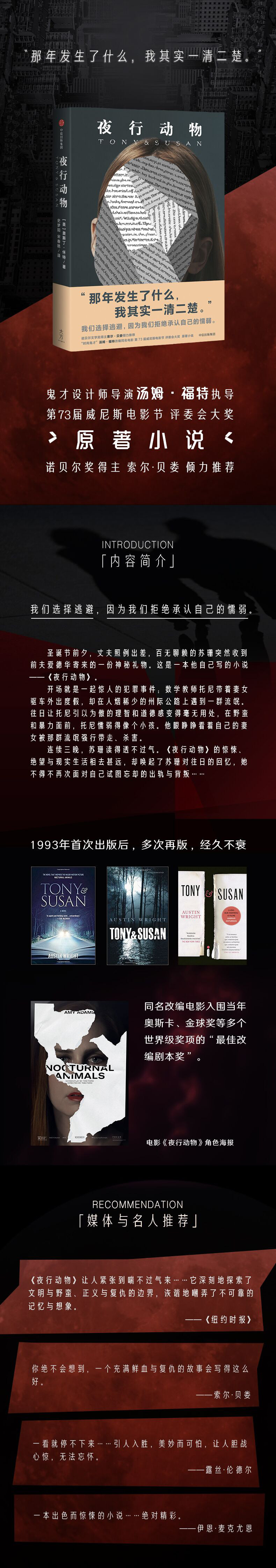 圣诞节前夕,丈夫照例出差,百无聊赖的苏珊突然收到前夫爱德华寄来的一份神秘礼物。这是一本他自己写的小说——《夜行动物》。