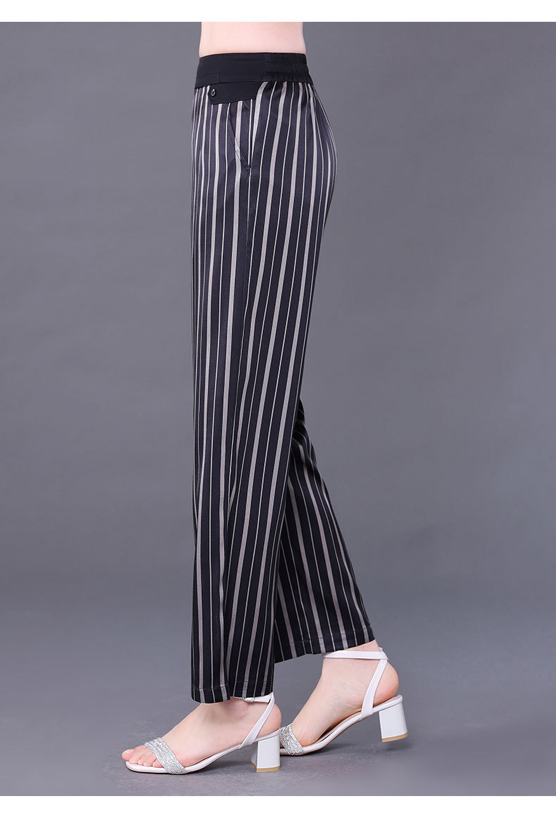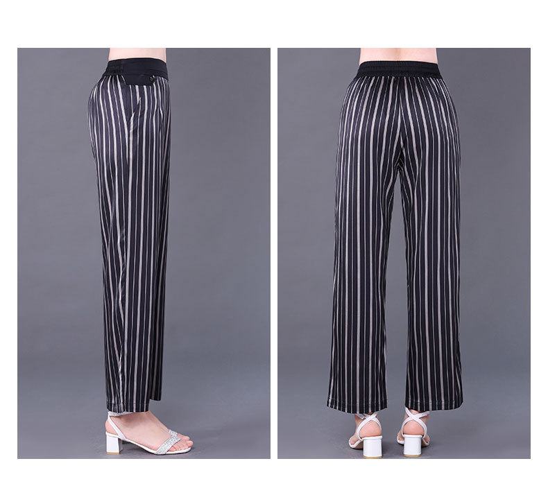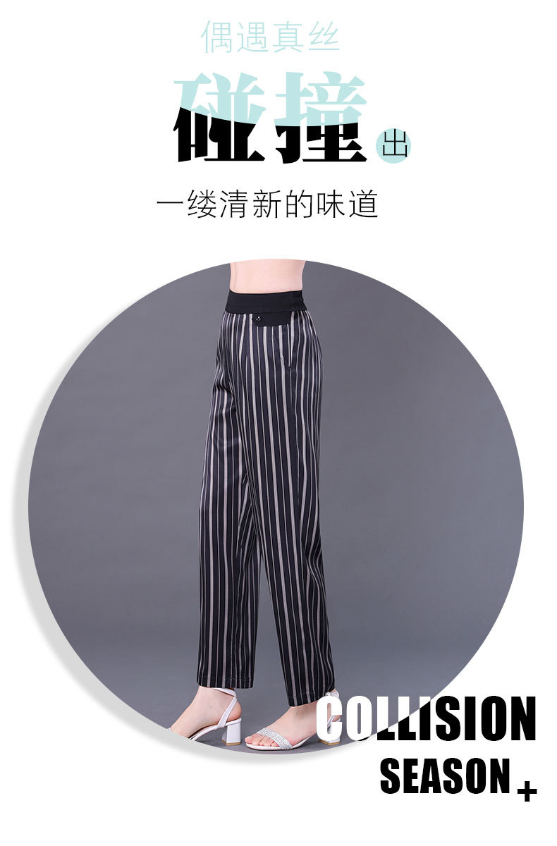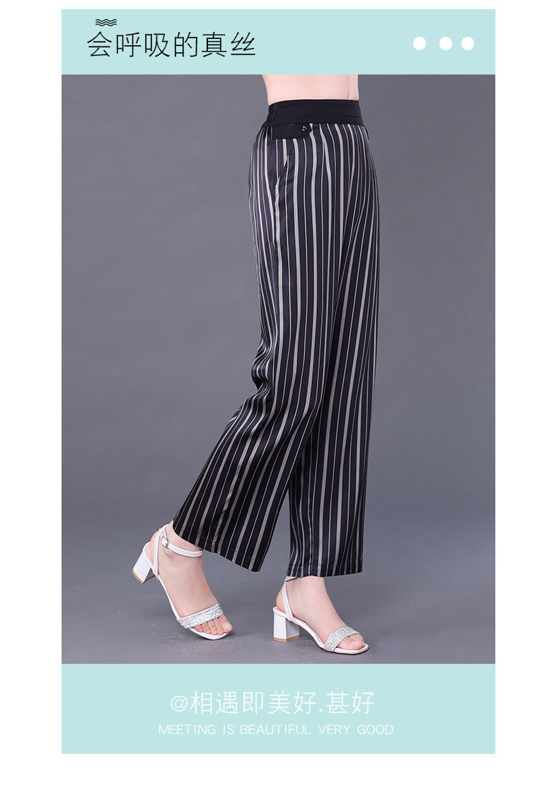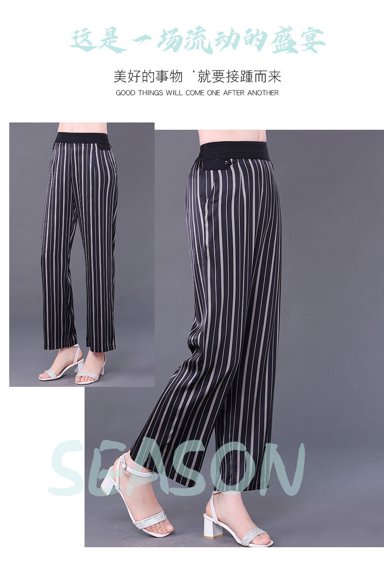 桑蚕丝竖条纹阔腿裤,新款薄款高腰直筒真丝垂感宽松裤子KQN-75623