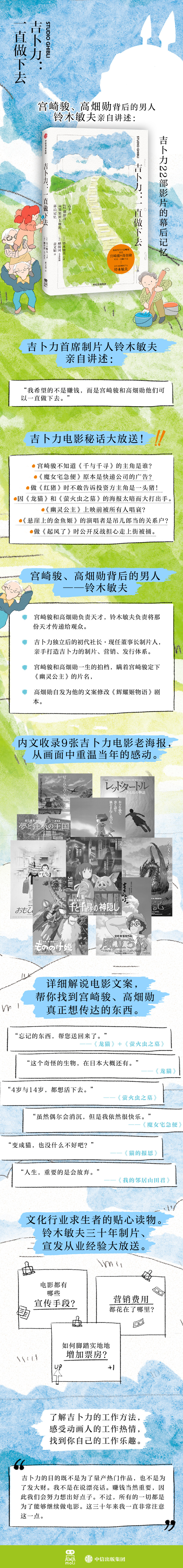 作为吉卜力独立后的首任社长及现任董事长制片人,铃木敏夫担任了《千与千寻》《岁月的童话》《红猪》《哈尔的移动城堡》《起风了》等绝大部分吉卜力作品的制片工作,并自撰写文案、引领宣发,承载了无数吉卜力的幕后回忆。