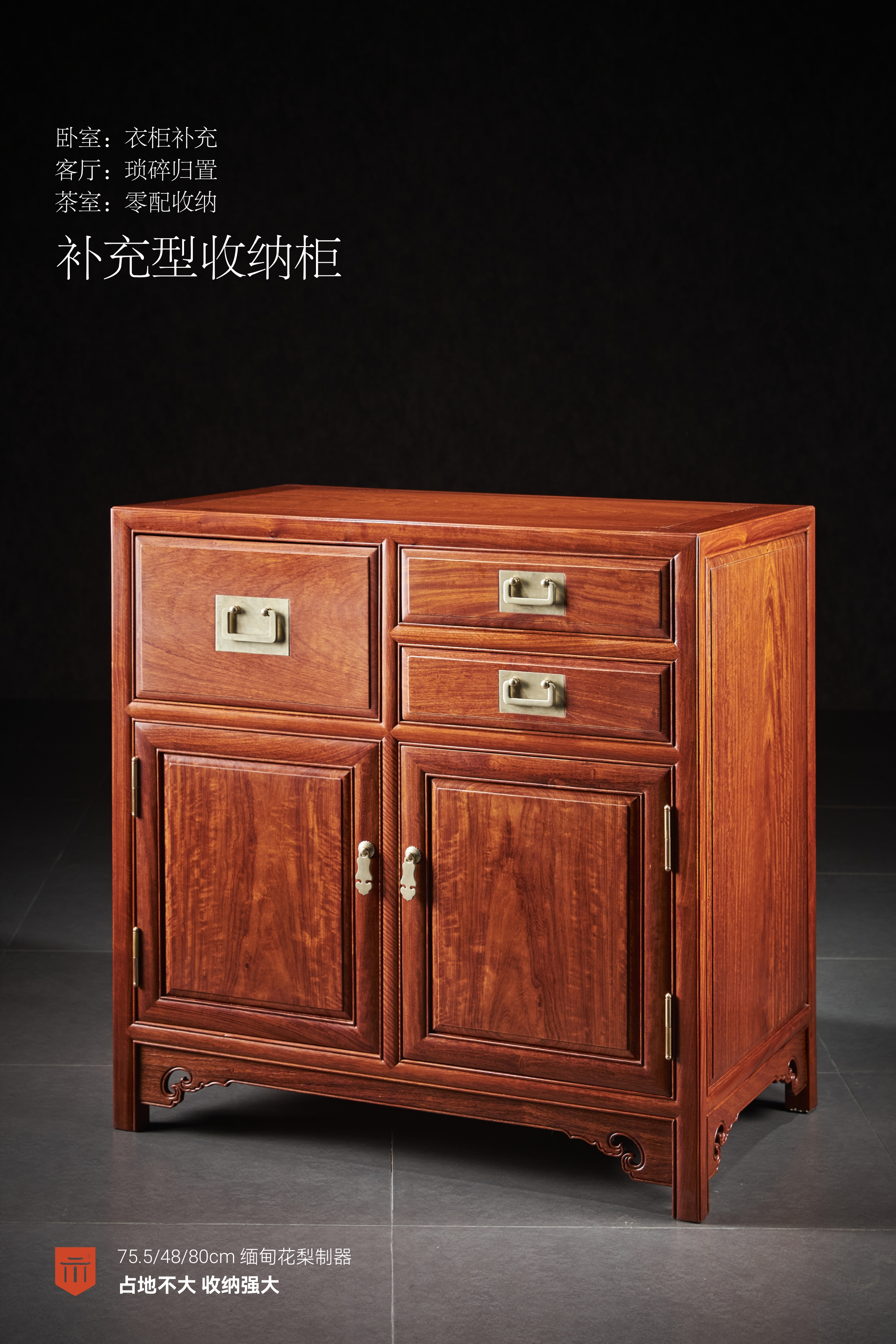 此款收纳柜,可作为补充型收纳柜,用于卧室衣柜补充,客厅琐碎归置,茶室零配收纳等。收纳柜高度适中,器型周正规整,采用全榫卯结构,设三具抽屉,左一右二布局,用于分类存放一些小杂物,配铜拉手,下安双柜门,空间较大,可存放较大物件,柜门下安牙条,通体线脚素雅,器形古雅清逸,占地不大,收纳强大。