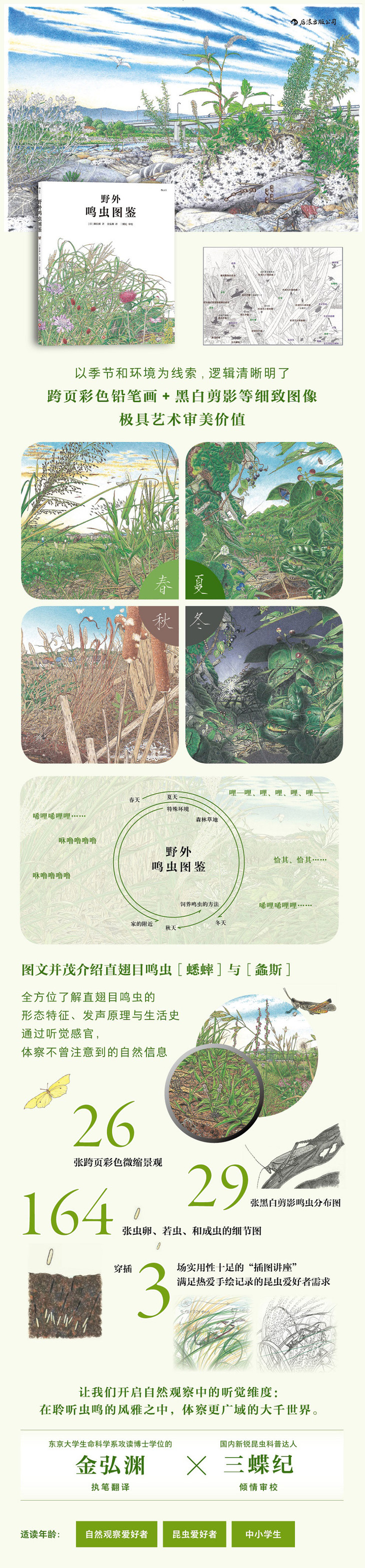 本书由在东京大学生命科学系攻读博士学位的金弘渊执笔翻译,由新锐昆虫科普达人三蝶纪倾情审校。书中另附有作者总结的鸣虫、生境绘画教学指南,可以帮助各位自然爱好者精进观察技能。让我们一起阅读本书,从“聆听”再“见到”更丰富的大自然!