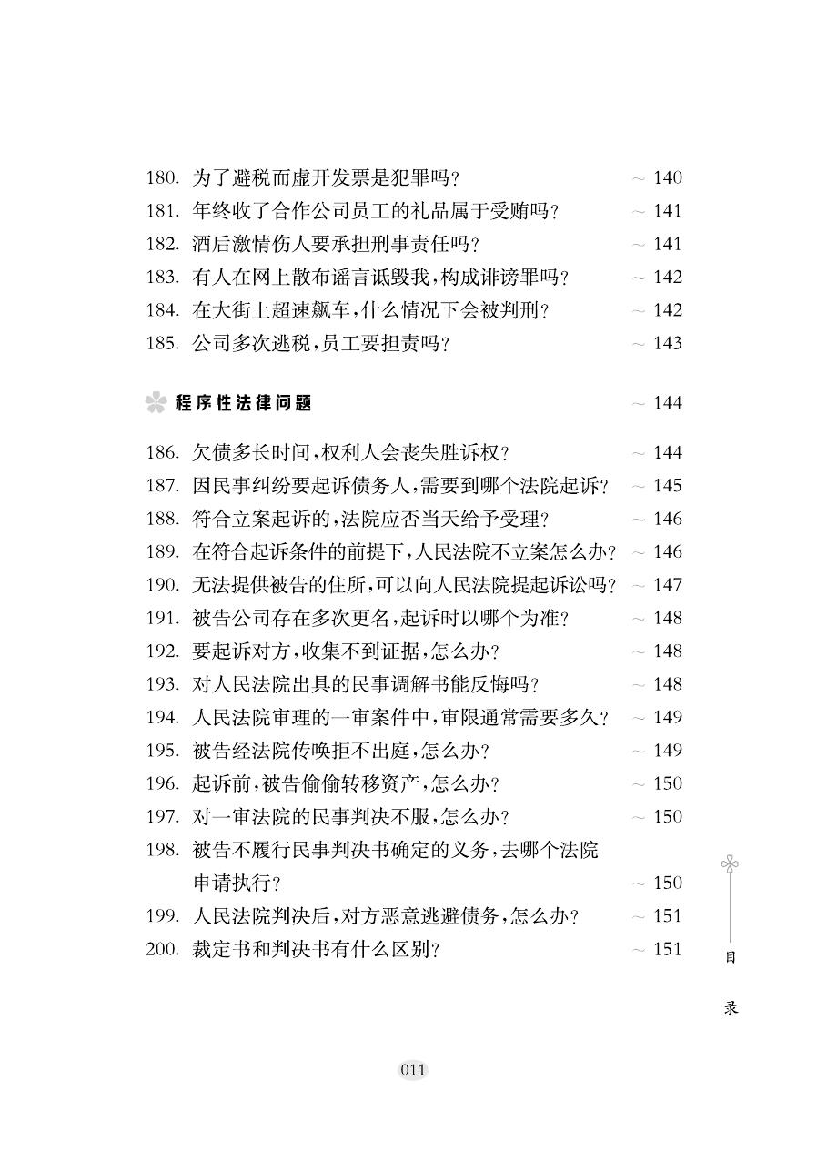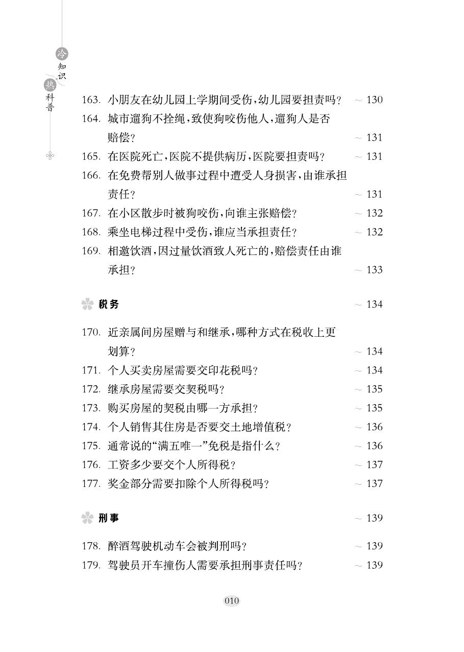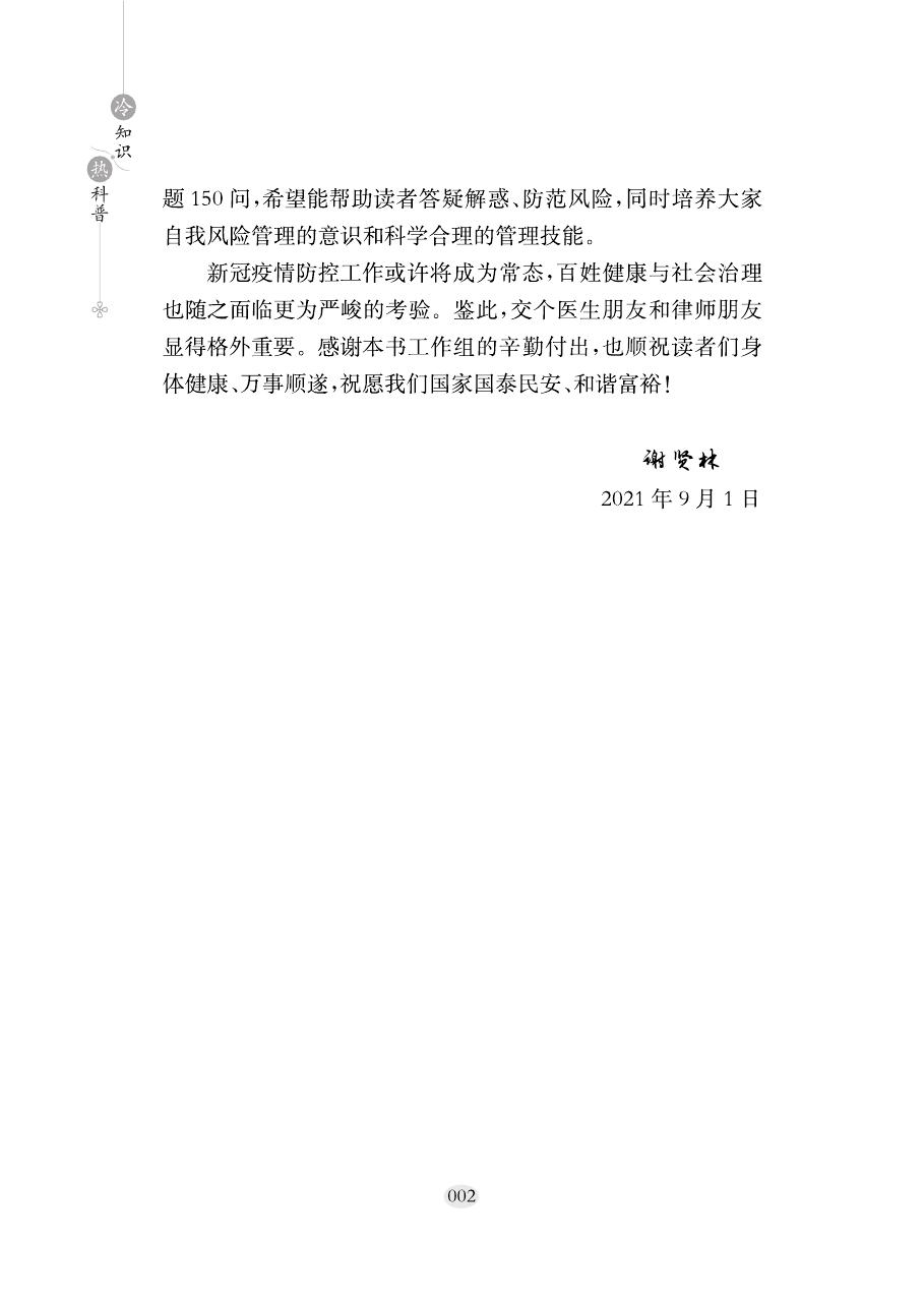 当下人们生活压力大,工作繁忙,长期不健康的生活方式可能造成肌体的亚健康状态,甚至疾病的发生,本书“家庭健康篇”(50问)分别从生活小常识、肥胖类、心血管卒中类、天赋类四个方面对人们关心的生活健康话题进行了阐释。同时,社会的多元化发展和《民法典》的颁布实施也让人们更多开始关注法律问题,本书“家庭法律篇”(150问)以“让大家相信法律、使用法律”为宗旨,节选了老百姓关心的保险财富、婚姻继承、债务债权、劳动用工、房产物业、消费者保护权益等法律科普小文章,用简单通俗的语言将大家关心的问题进行了细致解读。