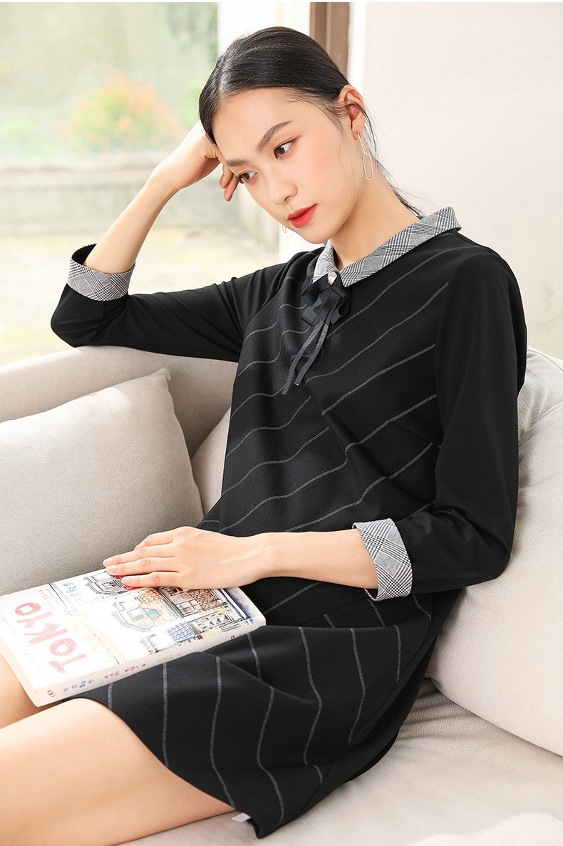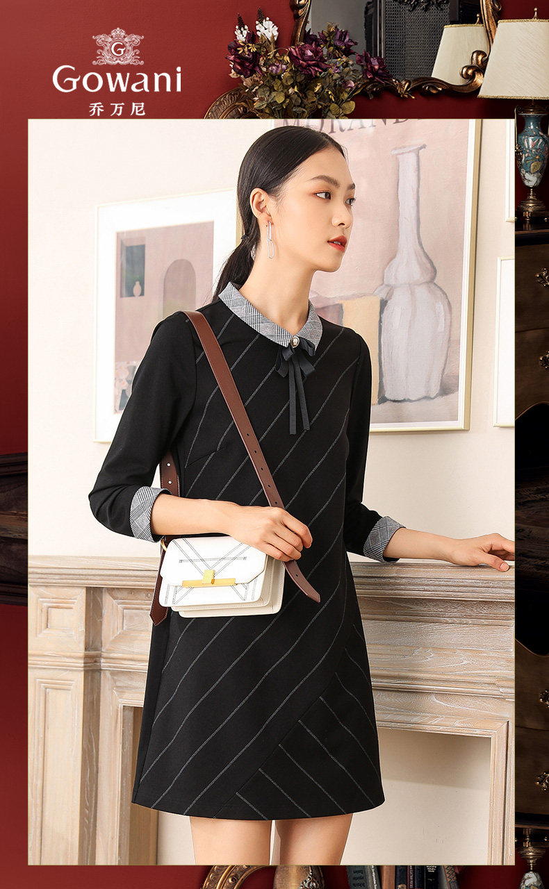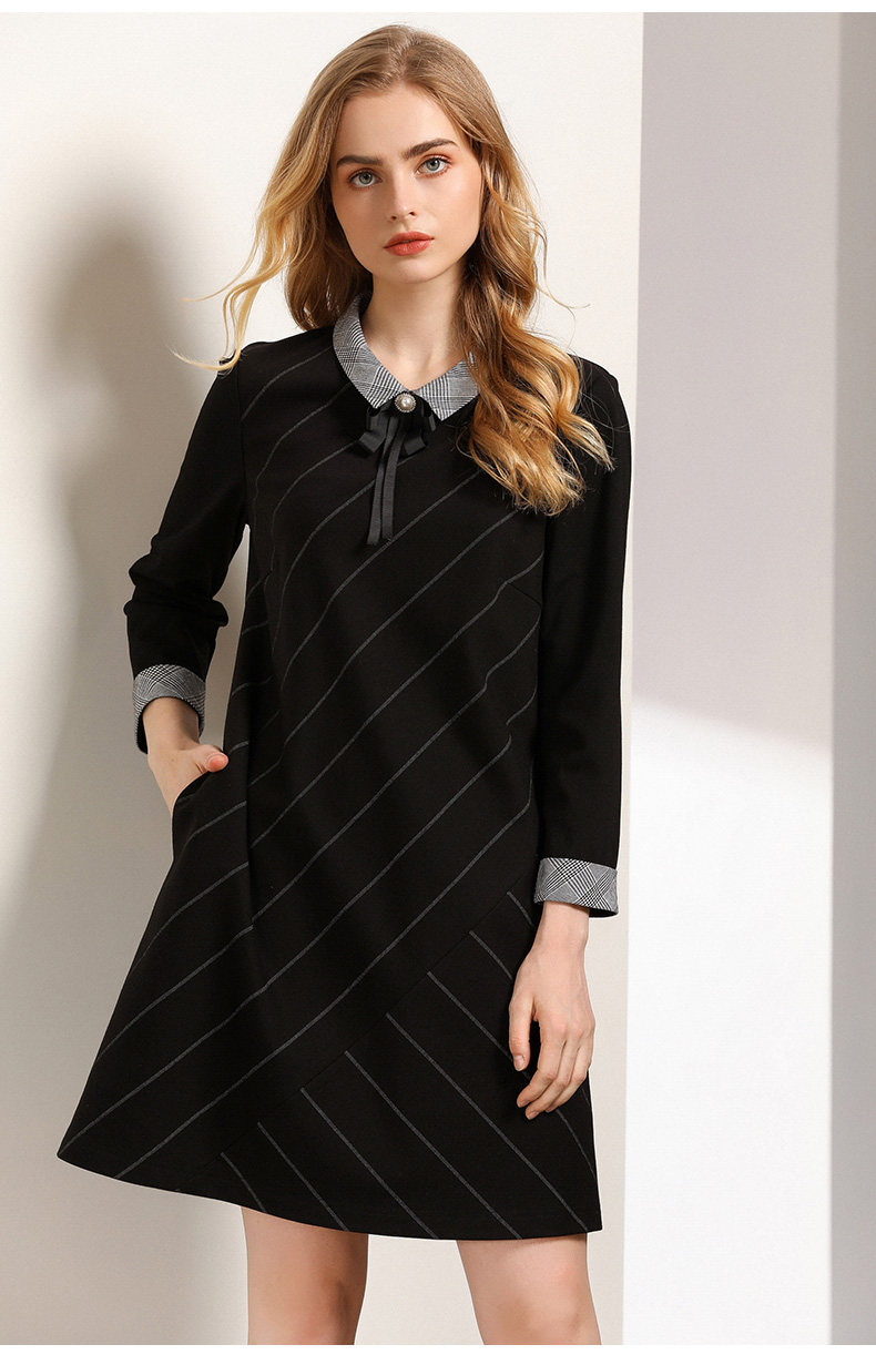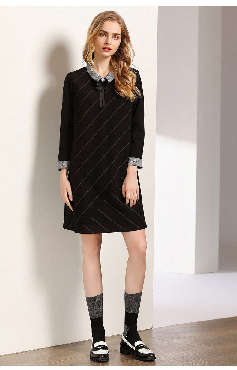 乔万尼秋装女春装宽松直筒显瘦气质黑色条纹长袖连衣裙EN3E380