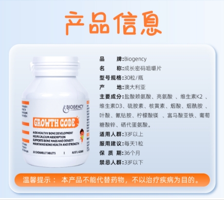 【12瓶1449】Biogency澳洲儿童成长密码D3K2赖氨酸复合咀嚼片30粒/瓶