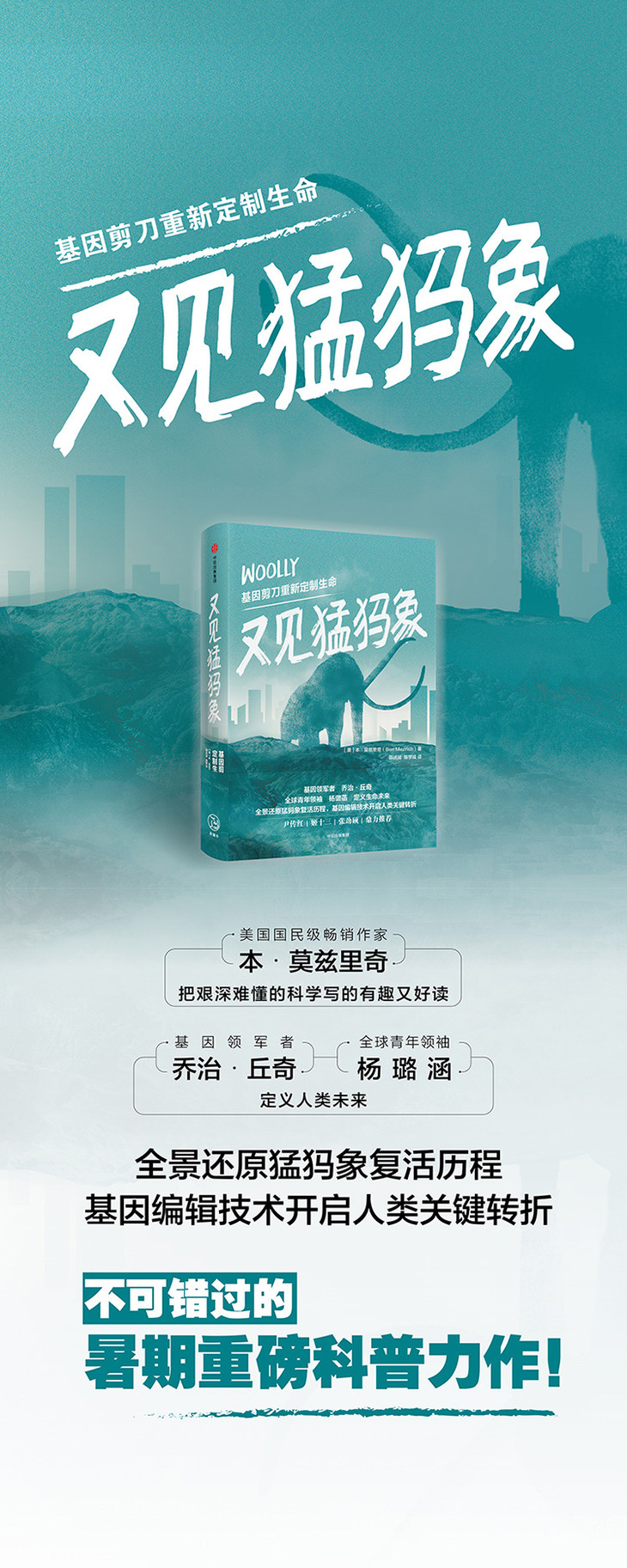 基因革命有两波浪潮,波浪潮是是基因测序,第二波便是基因组编辑技术(CRISPR),我们形象地称它为“基因剪刀”。美国哈佛大学乔治.丘奇教授及他的科学家团队正尝试使用该技术进行逆转衰老、异种器官移植,甚至是复活猛犸象的实验。在《又见猛犸象》这本书中,作家本.莫兹里奇将复活猛犸象的严肃科学和科学幻相结合,把一本前沿科技的科普书写得如此灵动又充满趣味。阅读体验令人难忘。希望手捧这本书的读者也和我一样,享受这段阅读旅程。