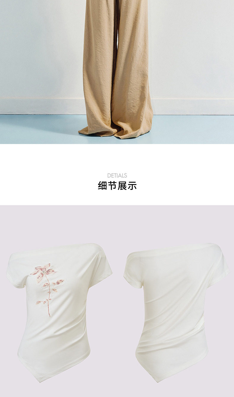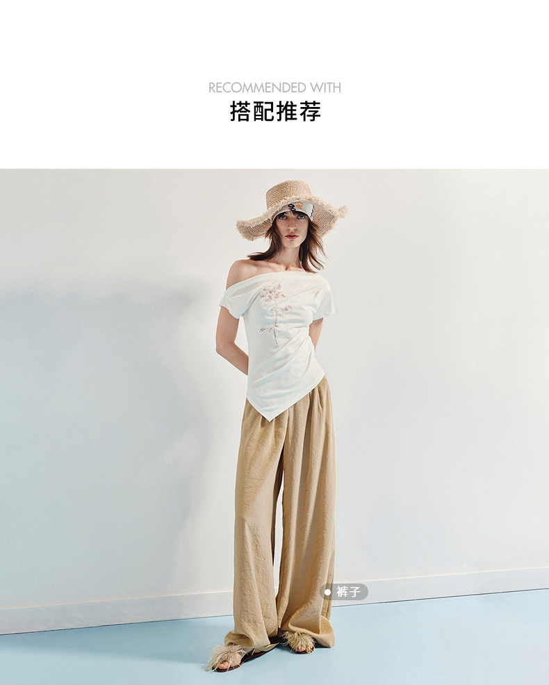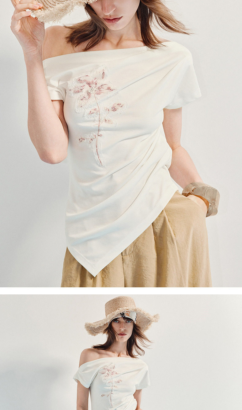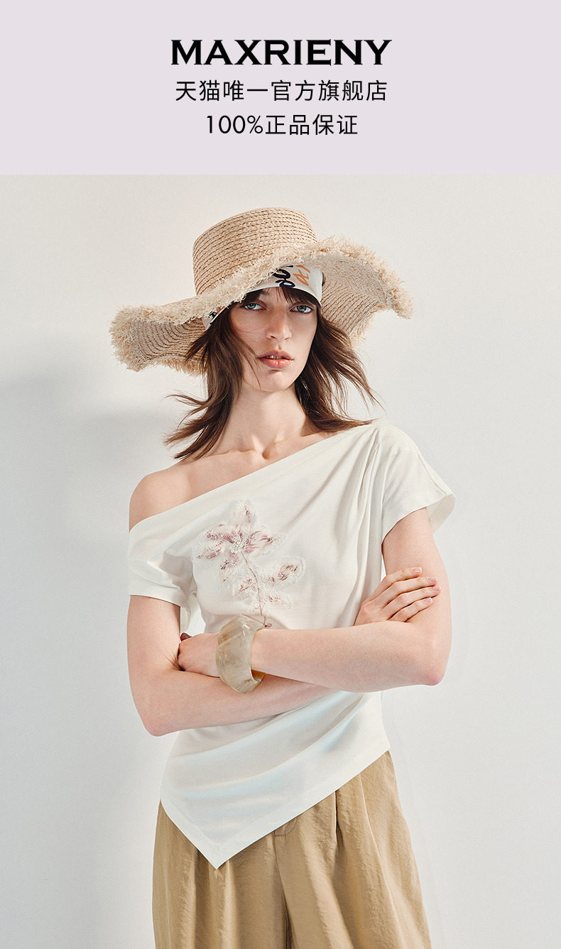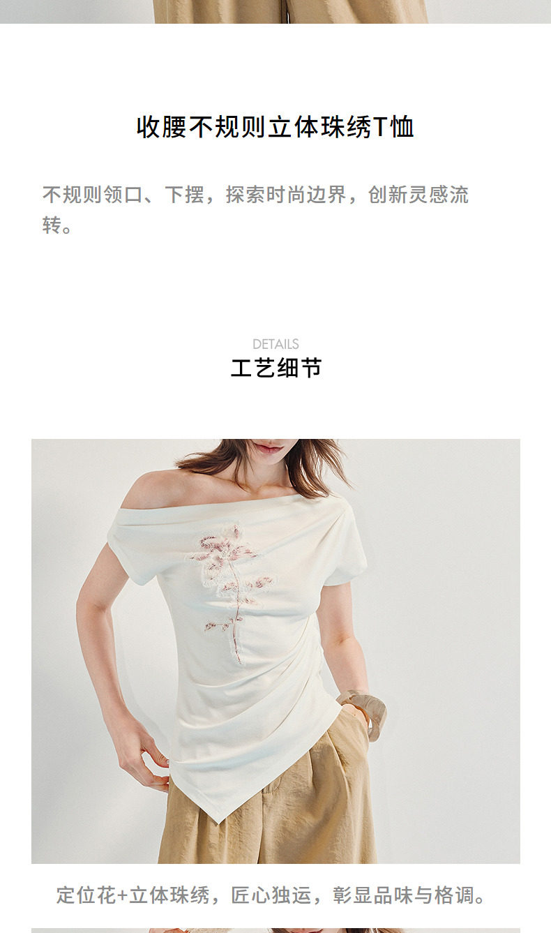 【商场同款】MAXRIENY小众设计感收腰不规则领口下摆立体珠绣T恤(货号:MC86TS256)
