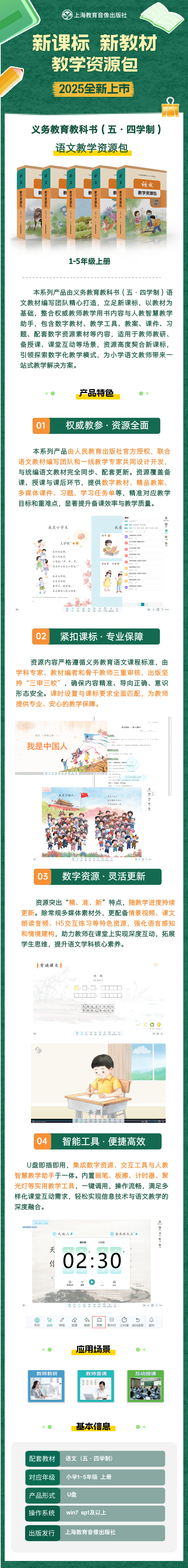 本系列产品由义务教育教科书(五·四学制)语文教材编写团队精心打造,立足新课标,以教材为基础,整合权威教师教学用书内容与人教智慧教学助手,包含数字教材、教学工具、教案、课件、习题、配套数字资源素材等内容,适用于教师教研、备授课、课堂互动等场景,资源高度契合新课标,引领探索数字化教学模式,为小学语文教师带来一站式教学解决方案。