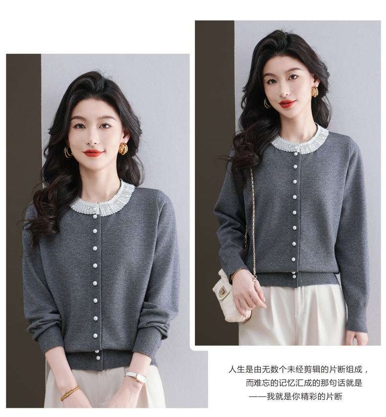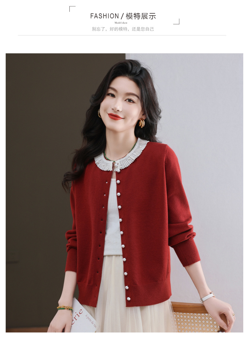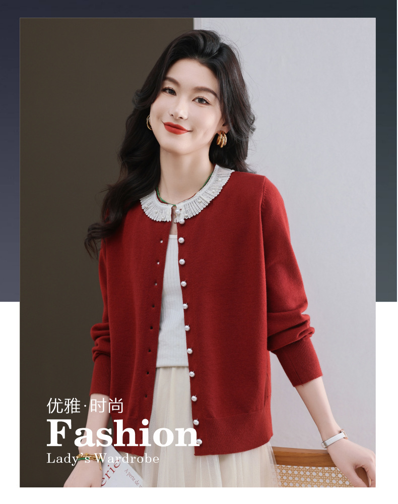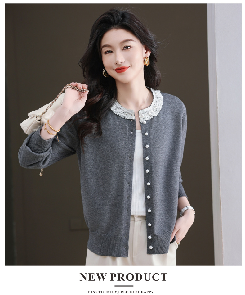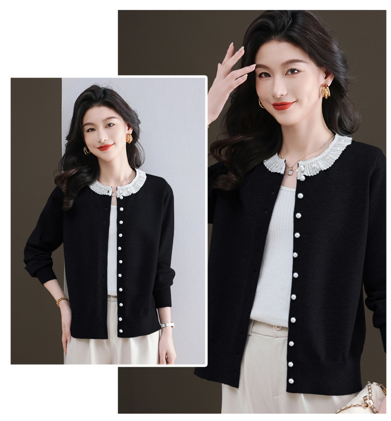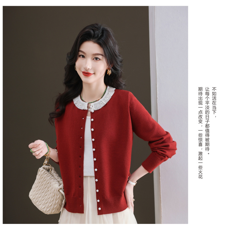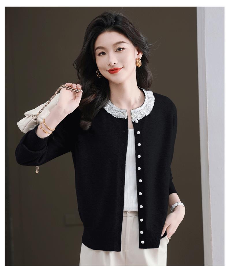 CC-11-9117小个子外套女士蕾丝花边针织开衫2025春秋装新款钉珠洋气短款上衣
