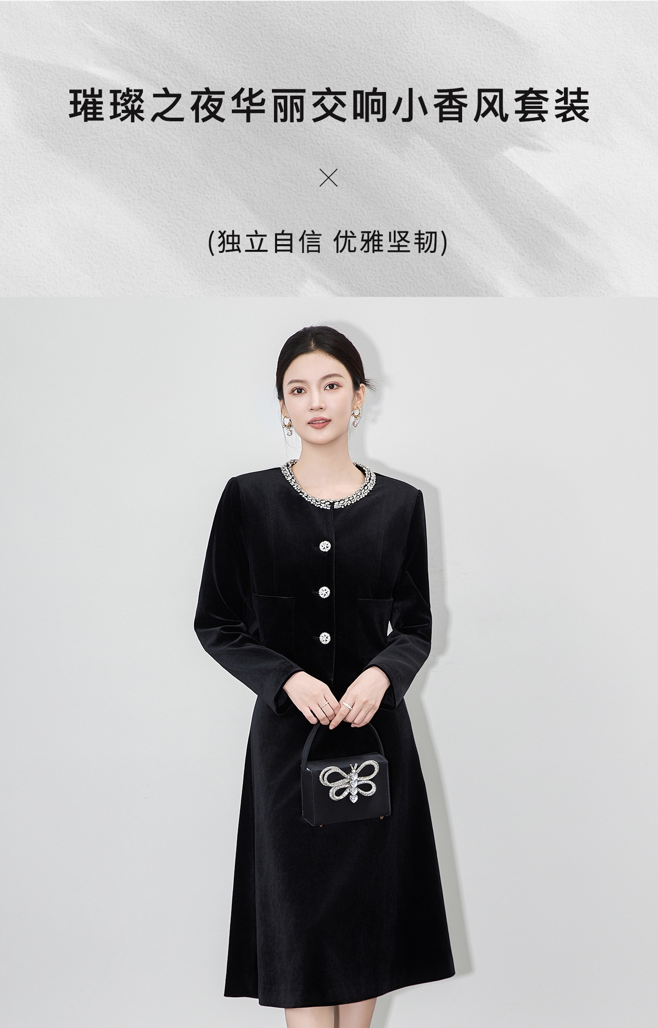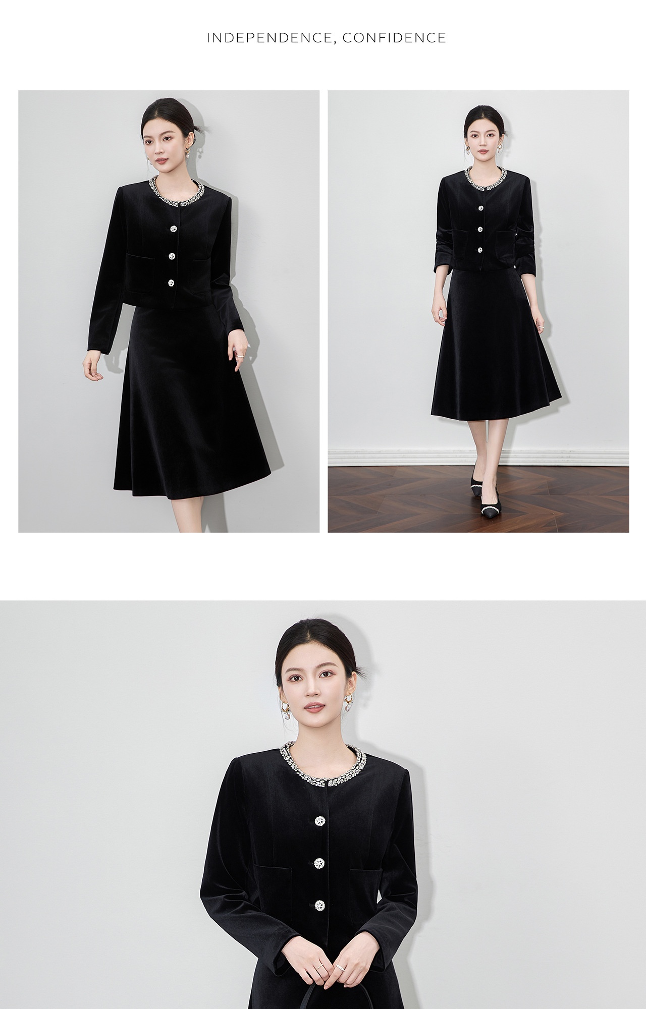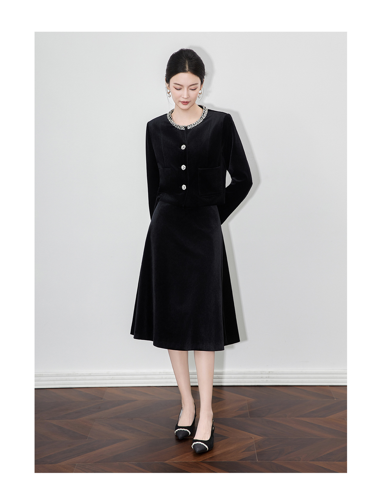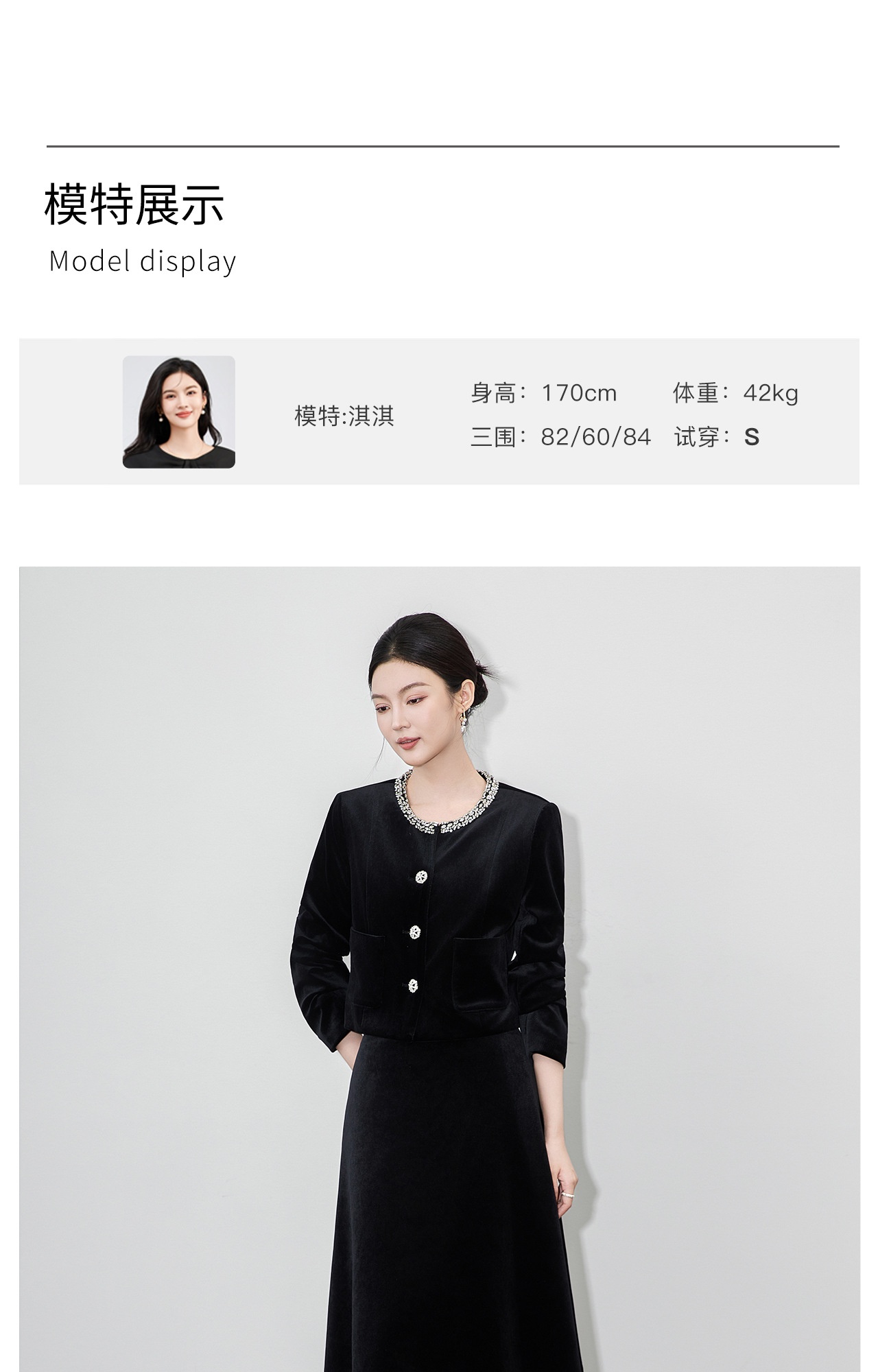 「高货wl」全新升级【铂金会员468/天猫629/差价161】(99047)洛诗琳法式重工钉钻丝绒上衣短外套大摆A字半身裙两件套