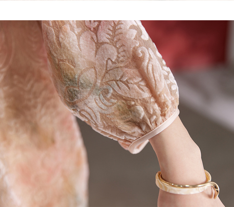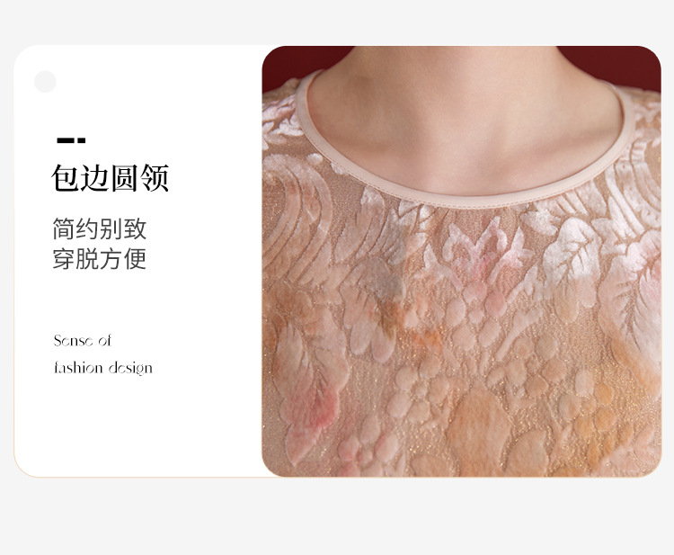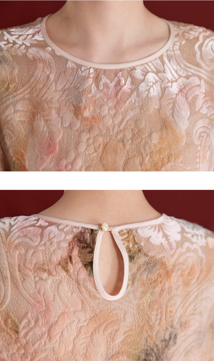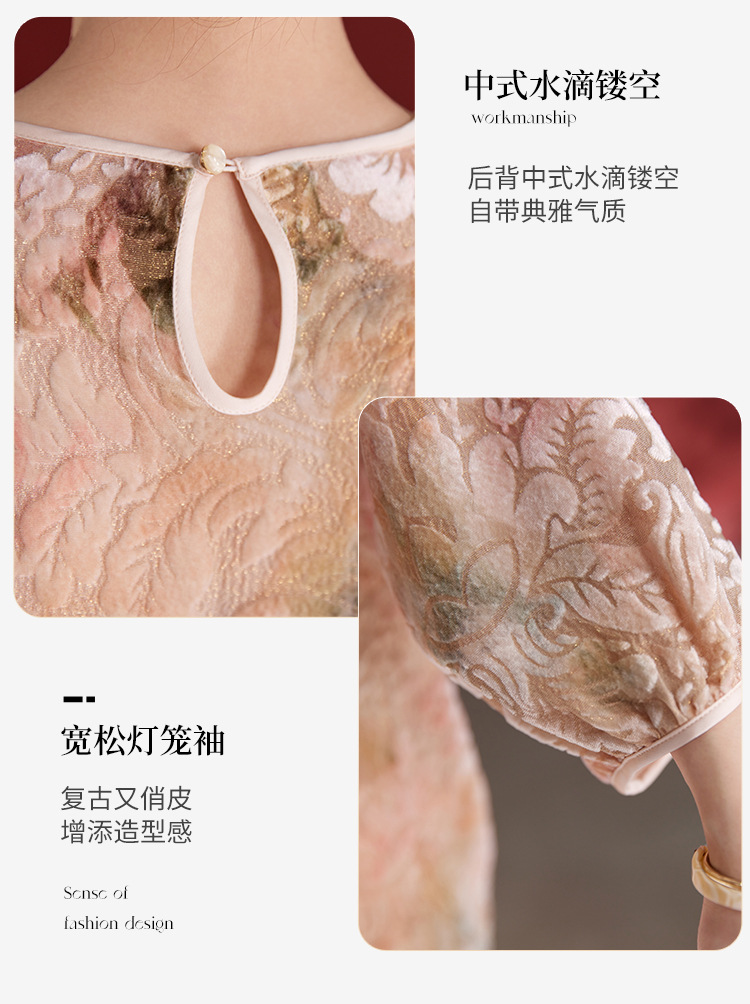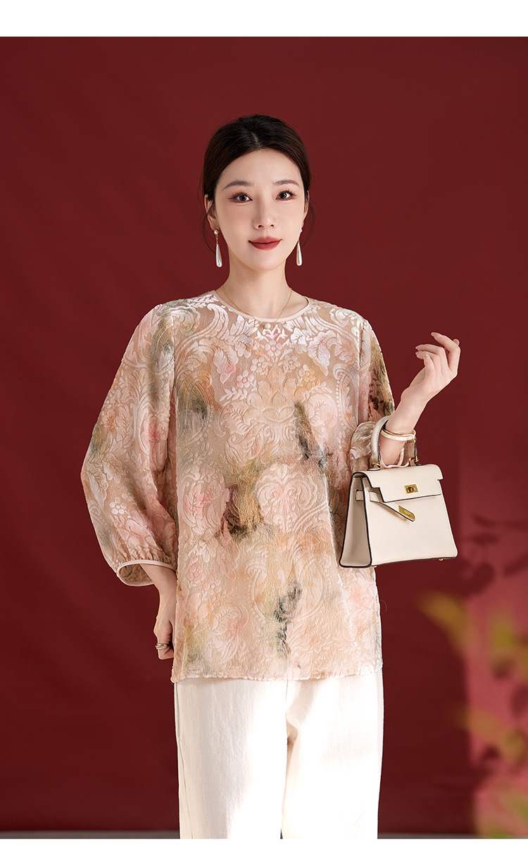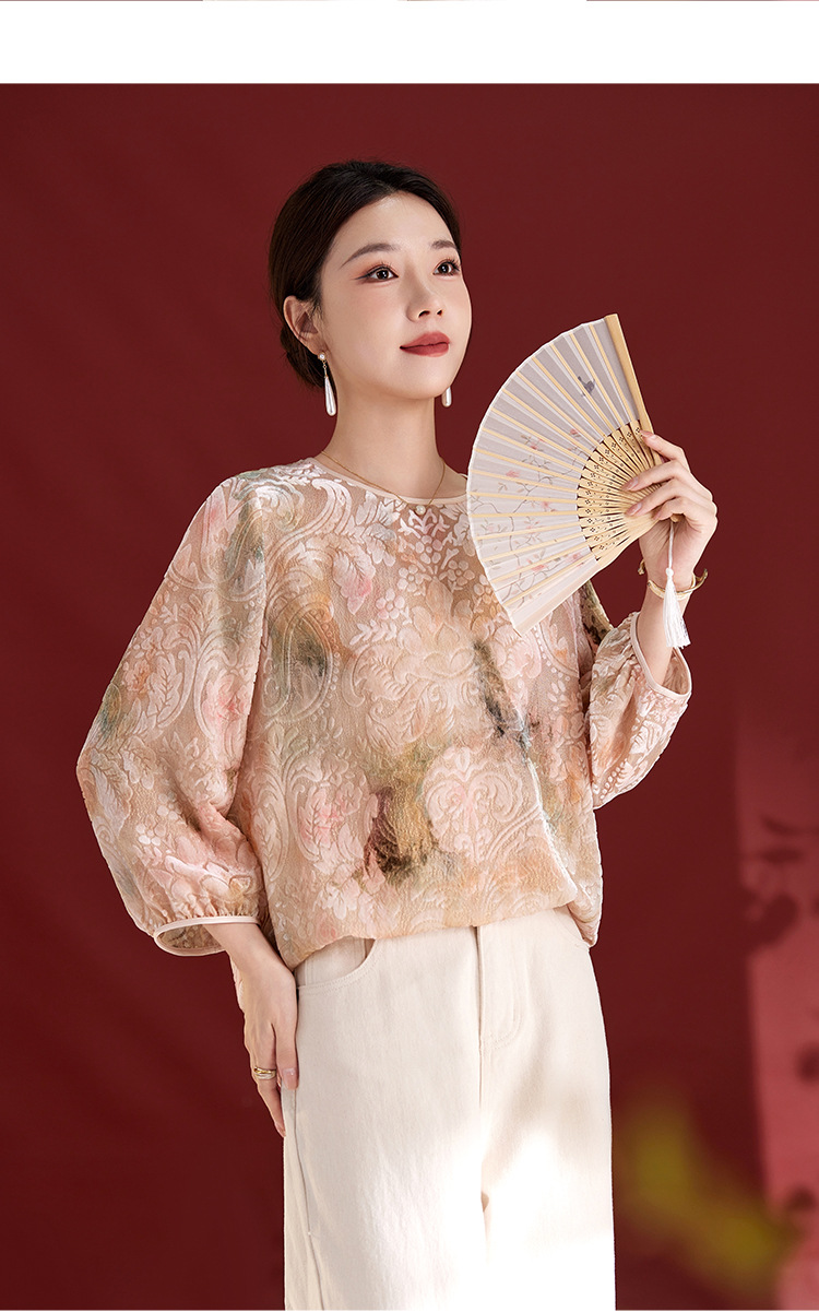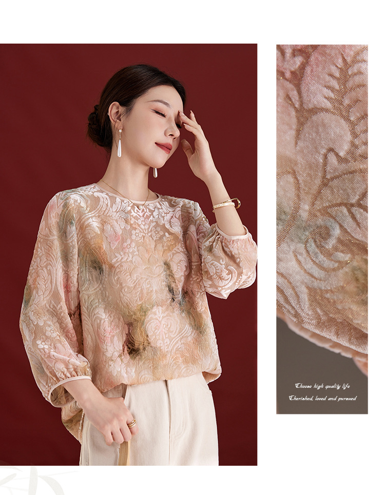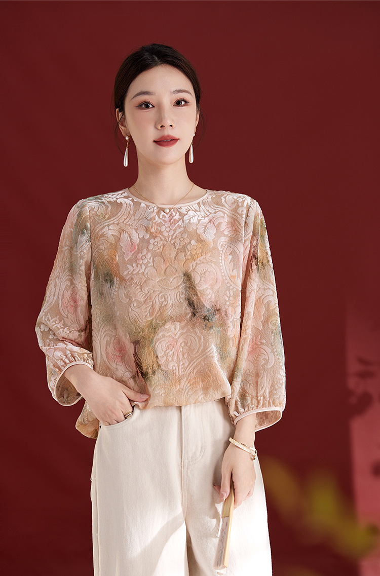 QS新中式女款圆领真丝丝绒薄款长袖拼接慵懒风提花秋季新款上衣1287