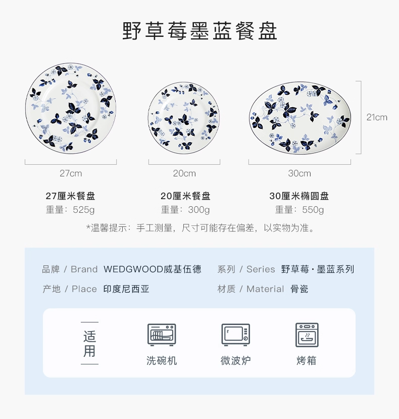 【WEDGWOOD】威基伍德野草莓墨蓝20cm餐盘骨瓷米饭碗盘子家用送礼