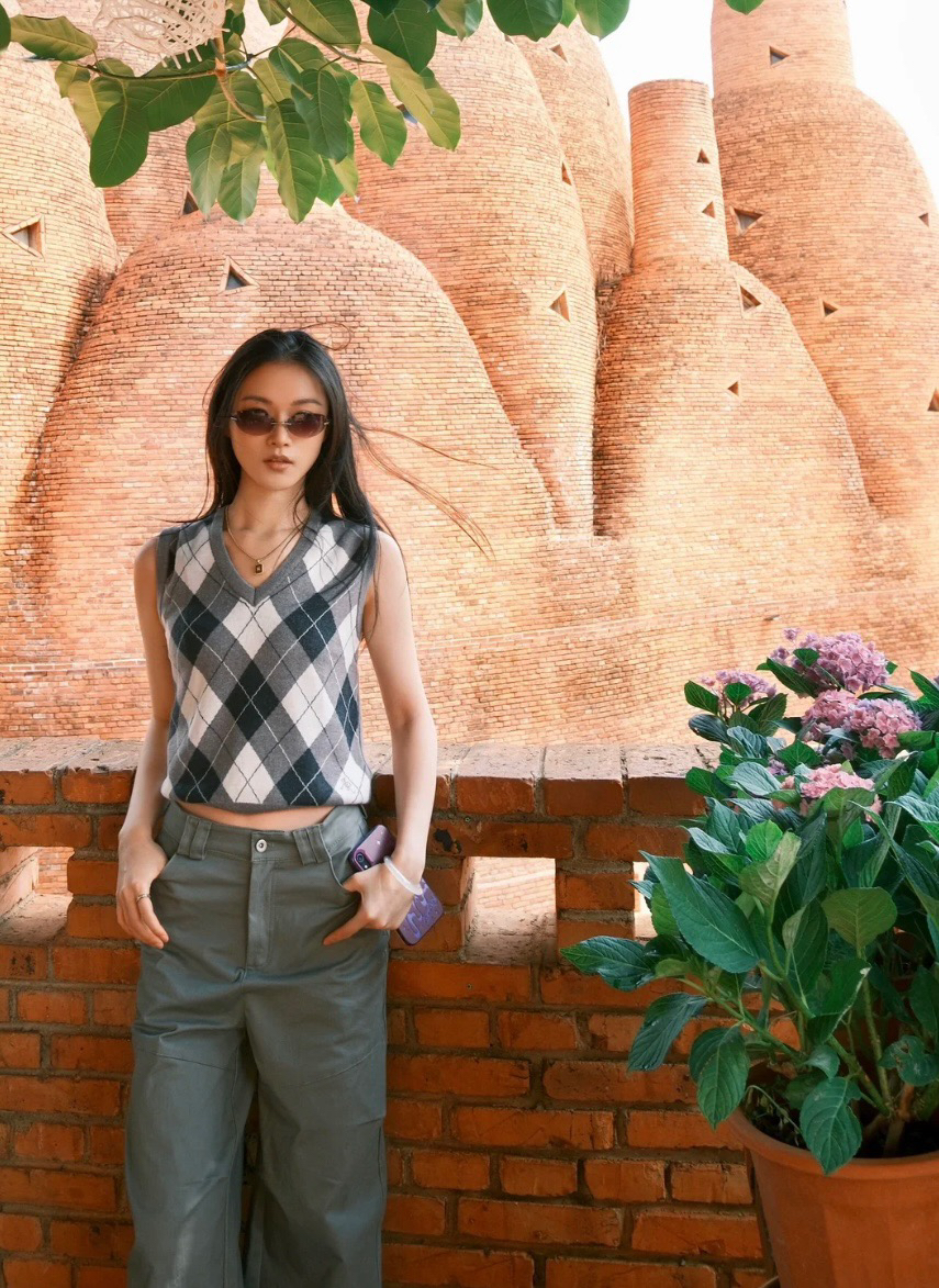 100%羊毛面料,搭配菱格撞色设计上身满满学院风格,单穿或是内搭打底衫都将复古品质感瞬间拉满,是早春搭配必备