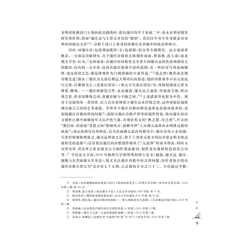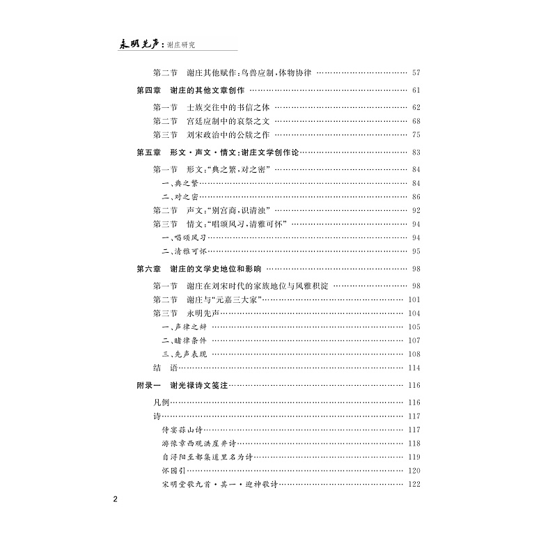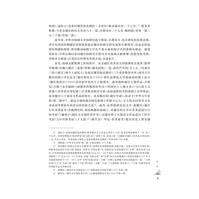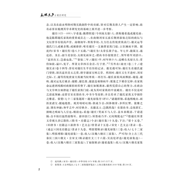 上编“谢庄研究”六章内容,重点围绕现存谢庄的诗、赋、文,辨析相关问题,力求深入分析谢庄文学创作的主要特色,即“形文”“声文”与“情文”;探讨谢庄作为永明先声的创作实践,论析其“别宫商,识清浊”的背景、条件及表现;揭示以谢庄为代表的南朝士族文人的生存状况及文学心态,特别突出谢庄文学创作在元嘉文学向永明文学过渡中的作用,重点揭示其在永明体实践创作中的地位及对唐人的重要影响,进一步深化学界对南朝文学的研究。