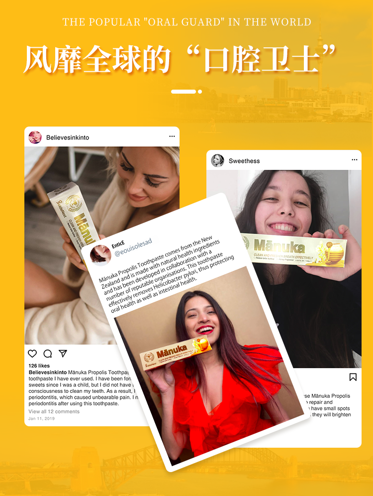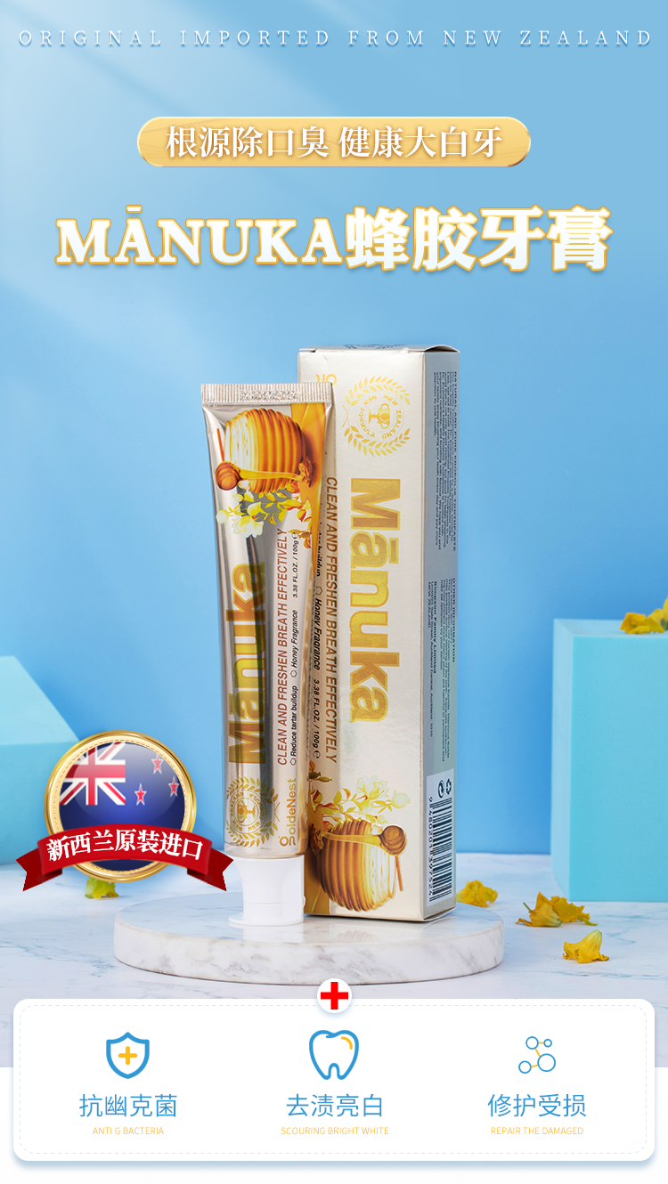 【抗击HP!买2送1】新西兰原装进囗牙膏,麦卢卡蜂胶99.9%溶菌除臭迷人花蜜香去渍亮白修护受损舒缓收敛,告别牙龈/溃炀不适,100g/支