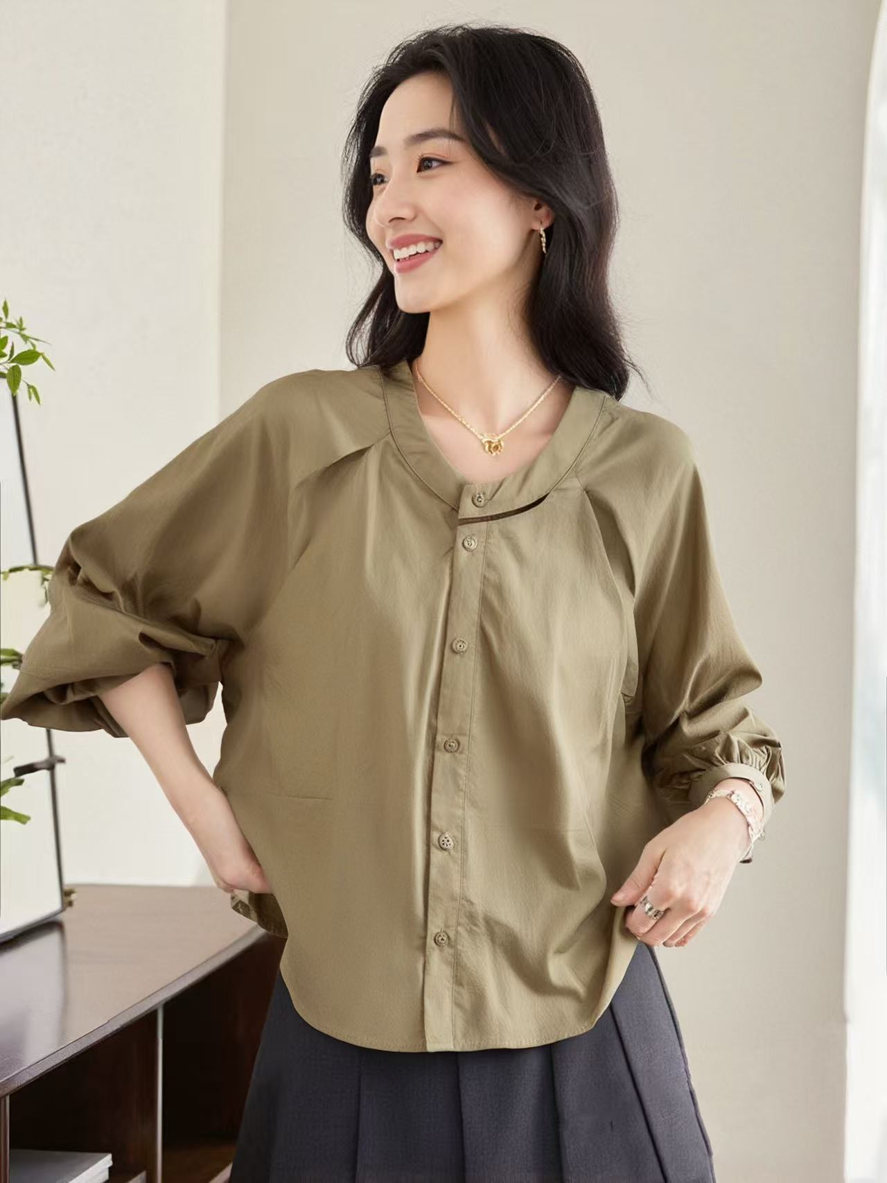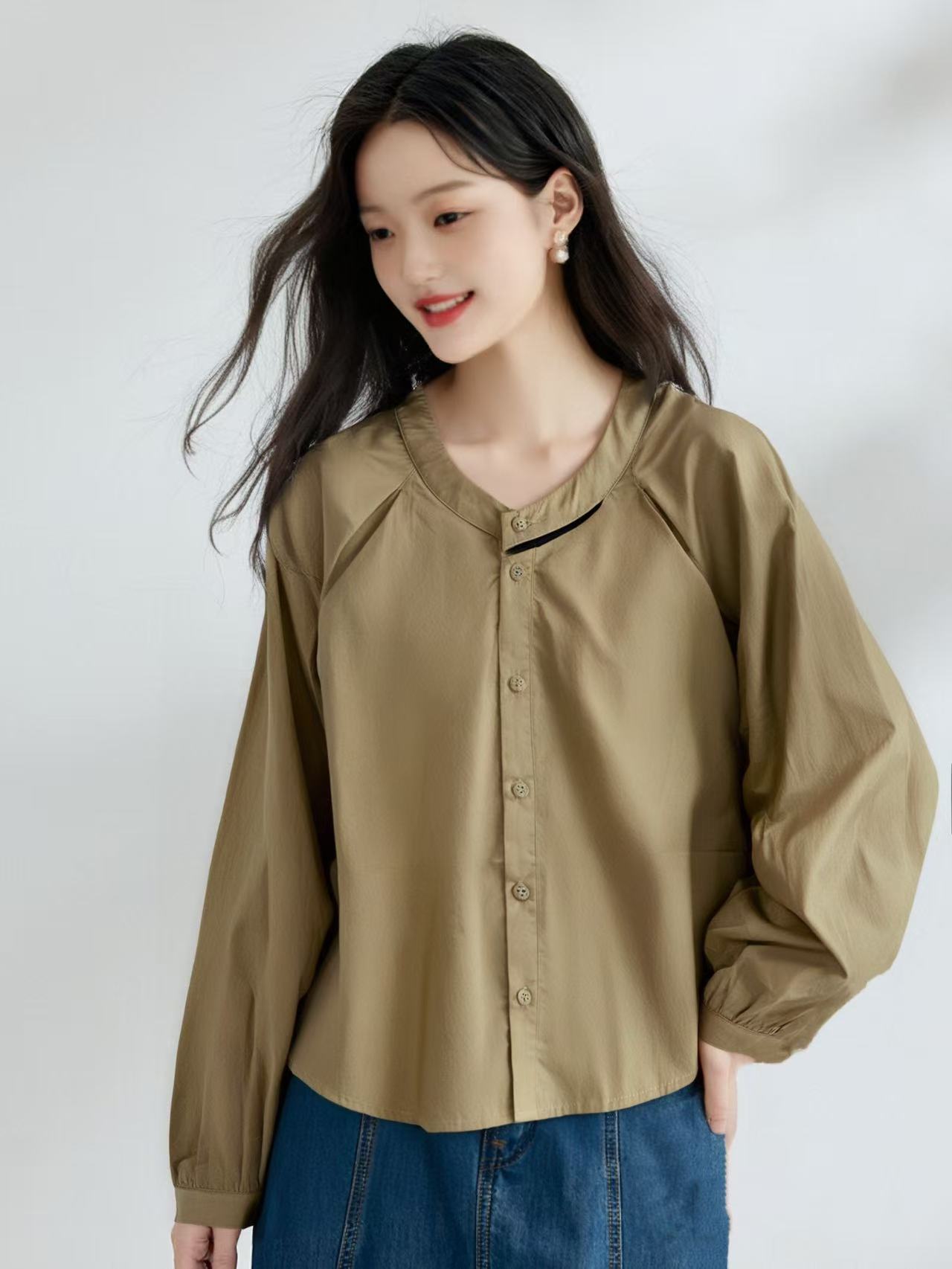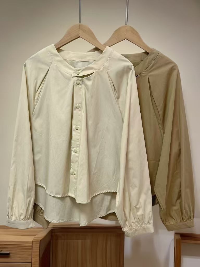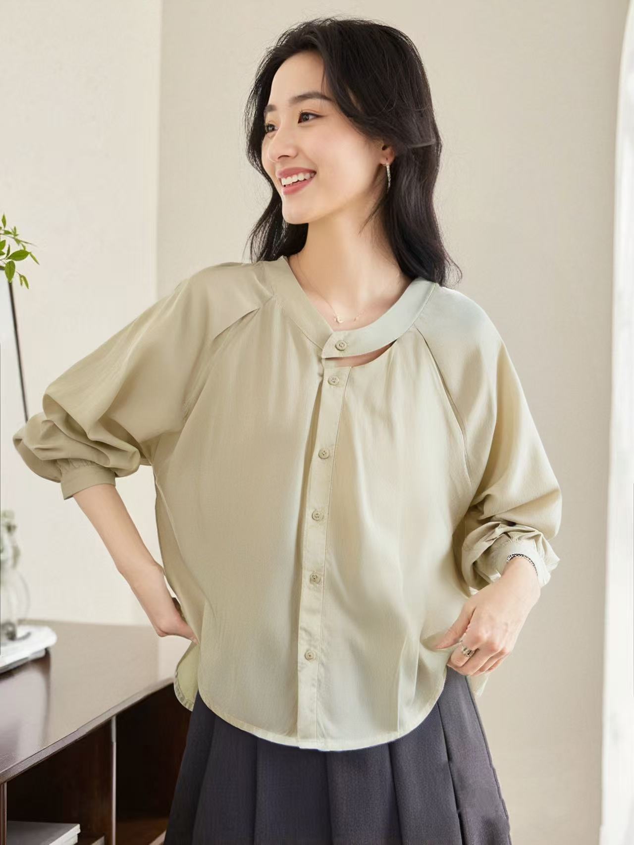 【时装系列】天丝➕棉 6035韩系镂空领宽松薄款短款长袖小衫M1-3-喜出