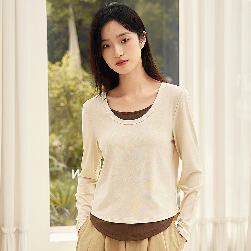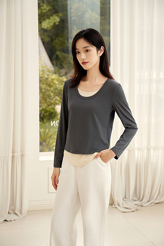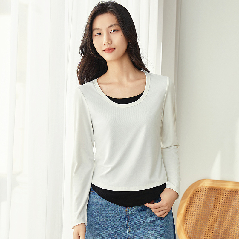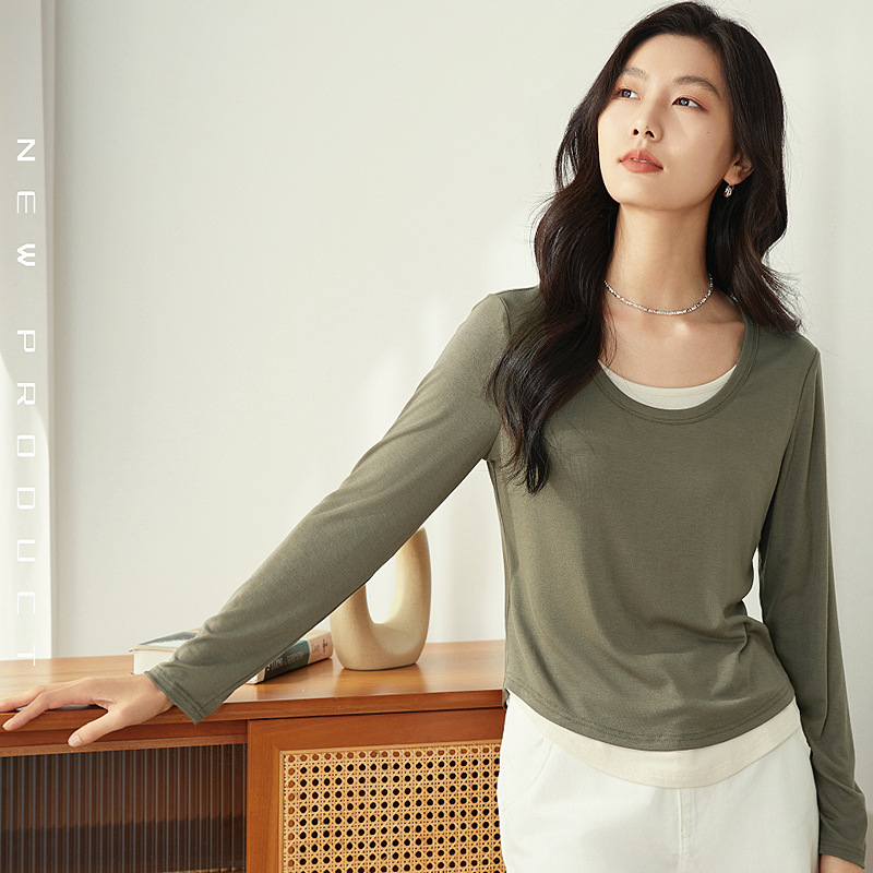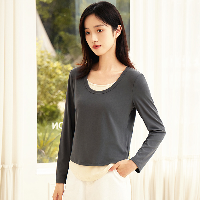 丁摩 女士长袖T恤打底衫春秋新款圆领薄款假两件高弹力内搭上衣5ZF-508