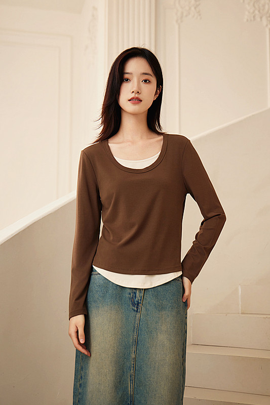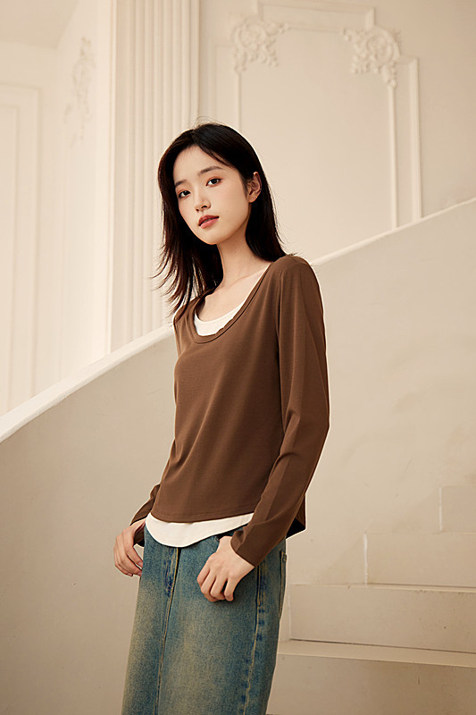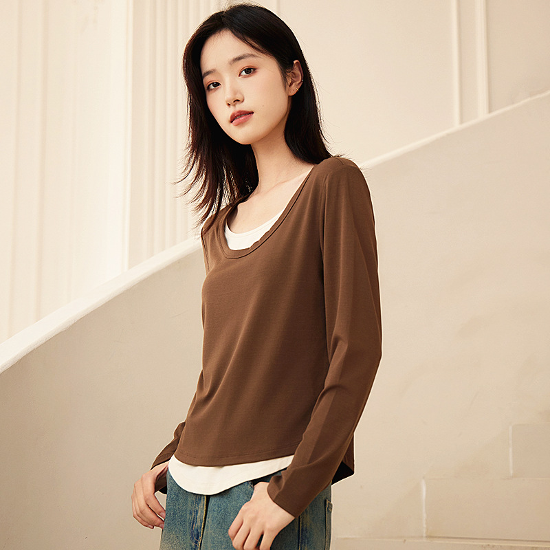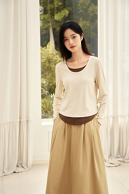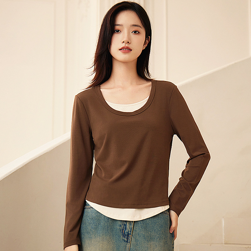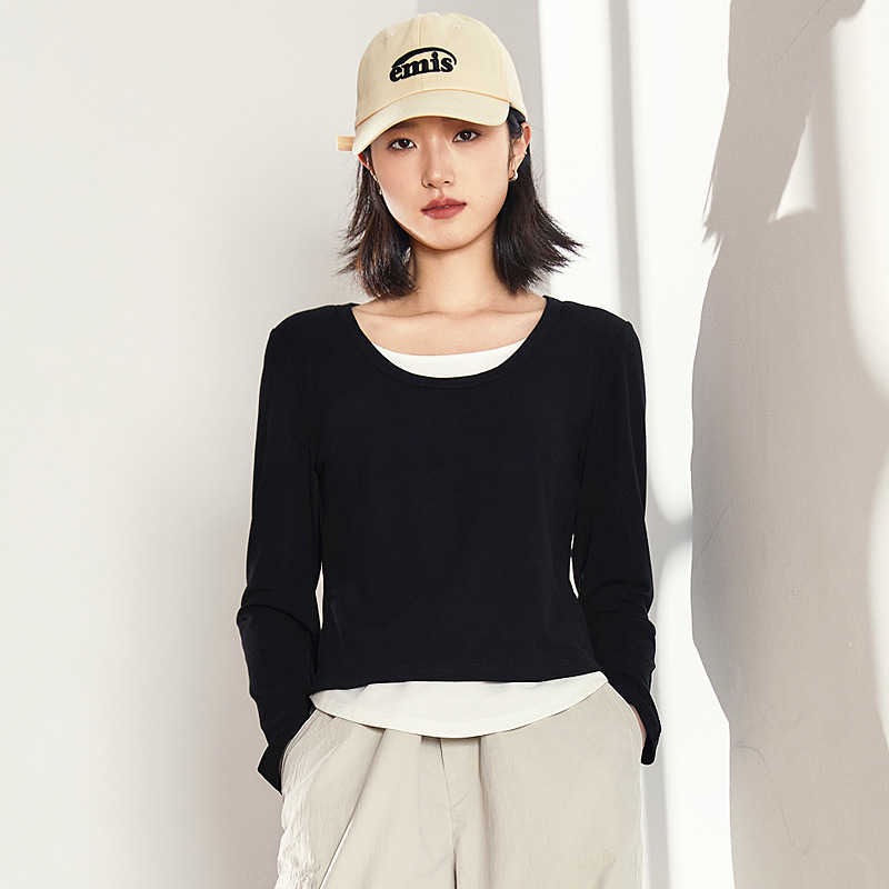 丁摩 女士长袖T恤打底衫春秋新款圆领薄款假两件高弹力内搭上衣5ZF-508