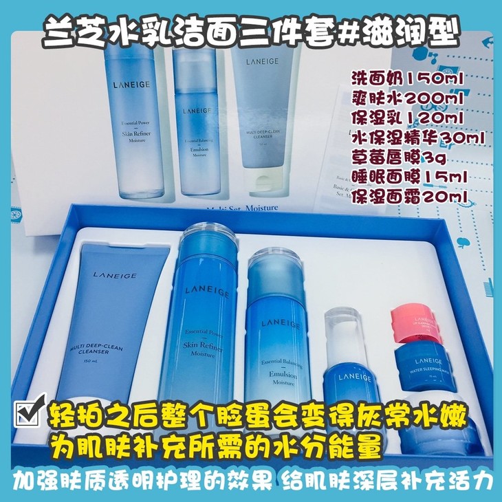 兰芝水乳洁面三件套#滋润型 👍兰芝家的产品在保湿补水💦领域享有很高的知名度啦🔥~滋润型是干皮妹子的真爱啦😍,上脸质地轻薄易吸收🌬,轻拍之后整个脸蛋会变得灰常水嫩💫,为肌肤补充所需的水分能量💧,加强肤质透明护理的效果👏,给肌肤深层补充活力⚡,透明的肌肤,调理角质,令肌肤光滑细致✨~套装包括:洗面奶150ml➕爽肤水200ml➕保湿乳120ml➕水保湿精华30ml➕草莓唇膜3g➕睡眠面膜15ml➕保湿面霜20ml