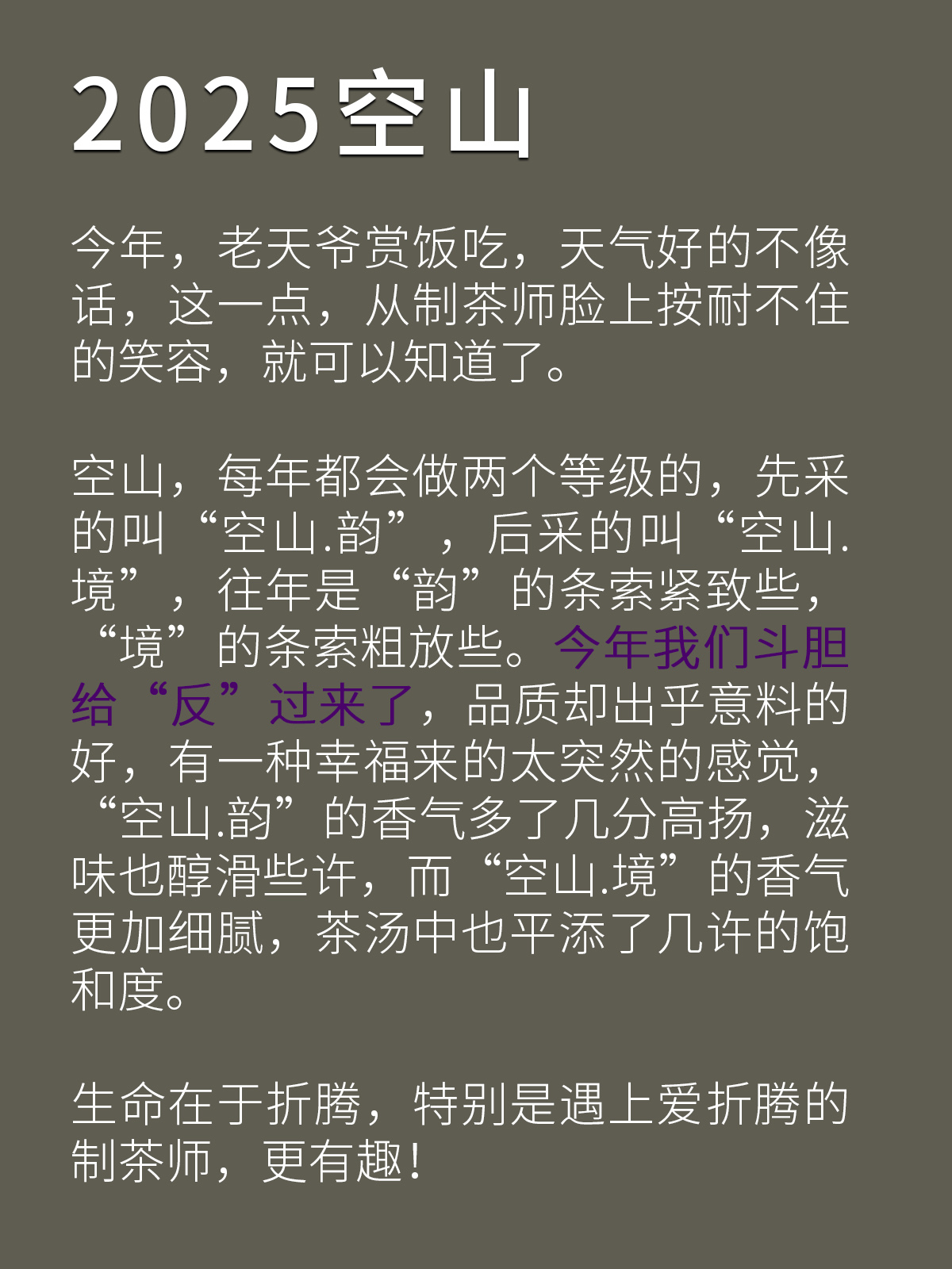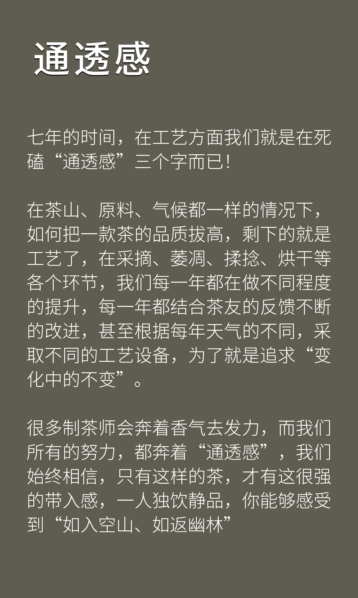 - 2021年,嘉木会创办了“藏茶密室”,开启了全新的藏茶模式,秉持“不将就,不迎合”的理念,通过“选、藏、养、醒”的方式,再度诠释藏茶的深意,沉醉杯汤,苦乐自知,茗透于心,迷之不悔!