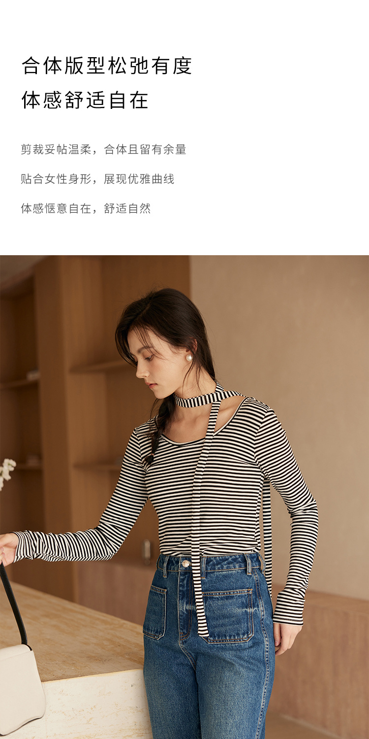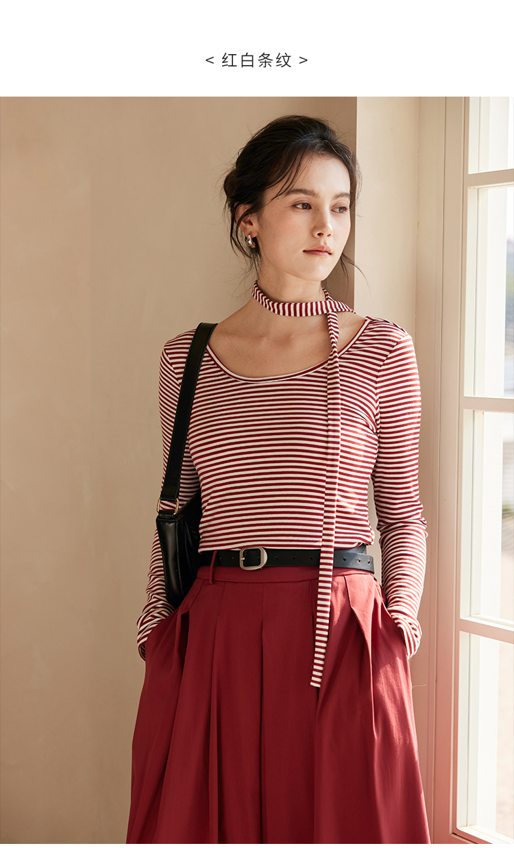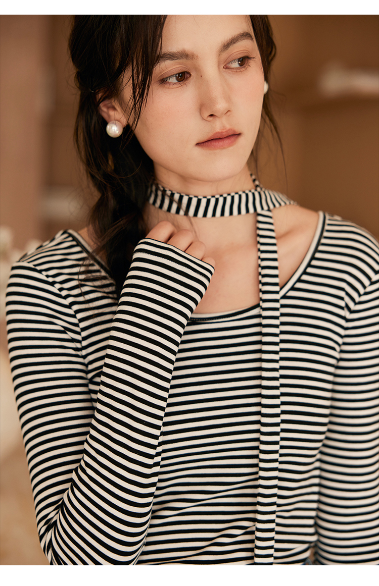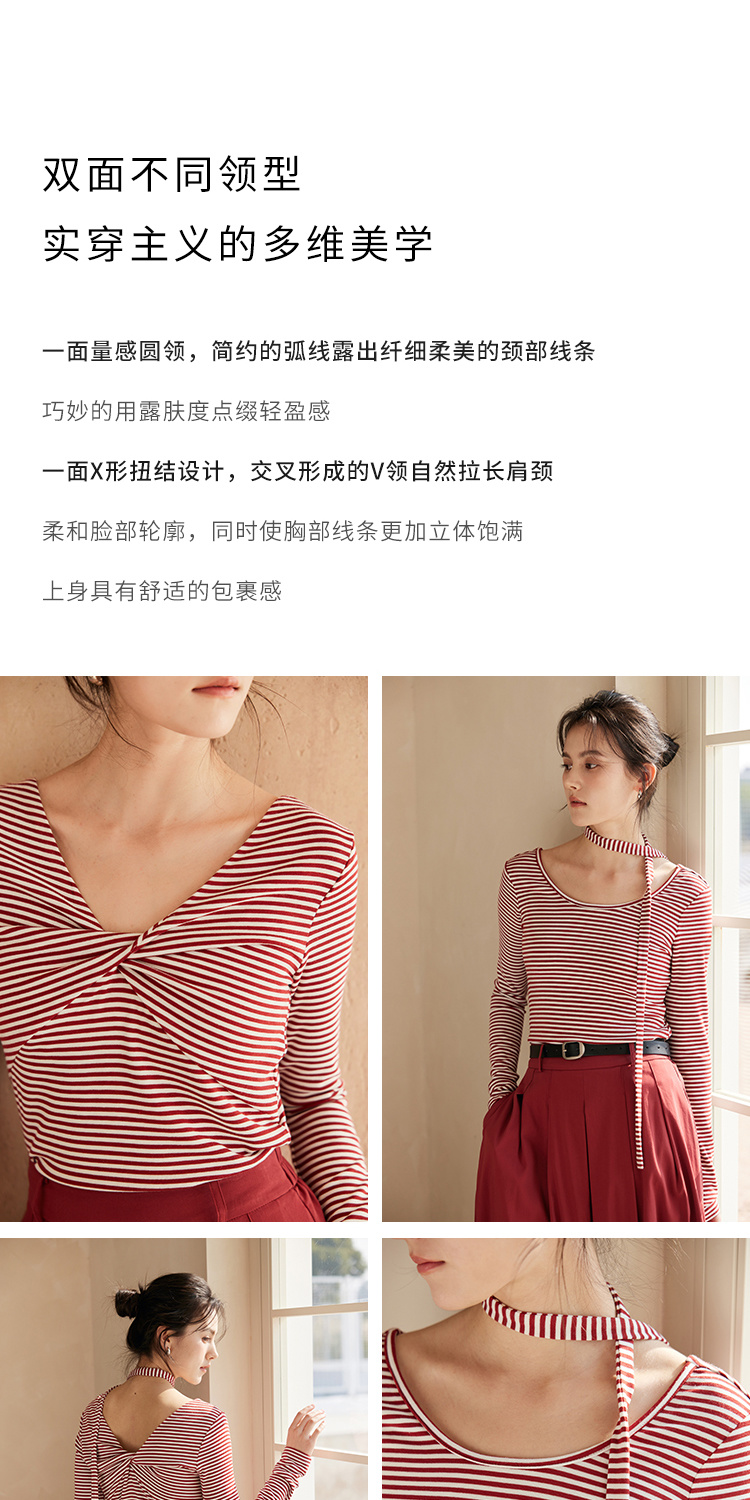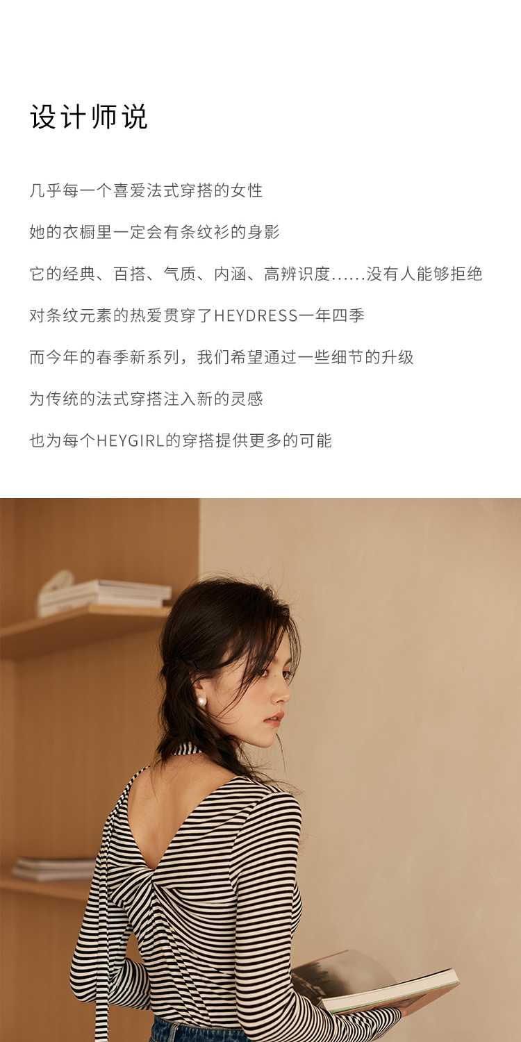 HeyDress飘带条纹T恤女春季复古V领内搭打底衫正反两穿长袖上衣