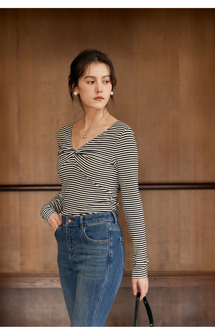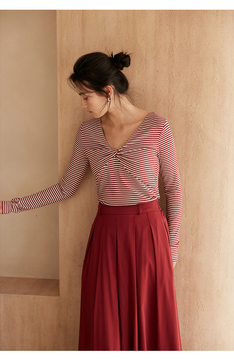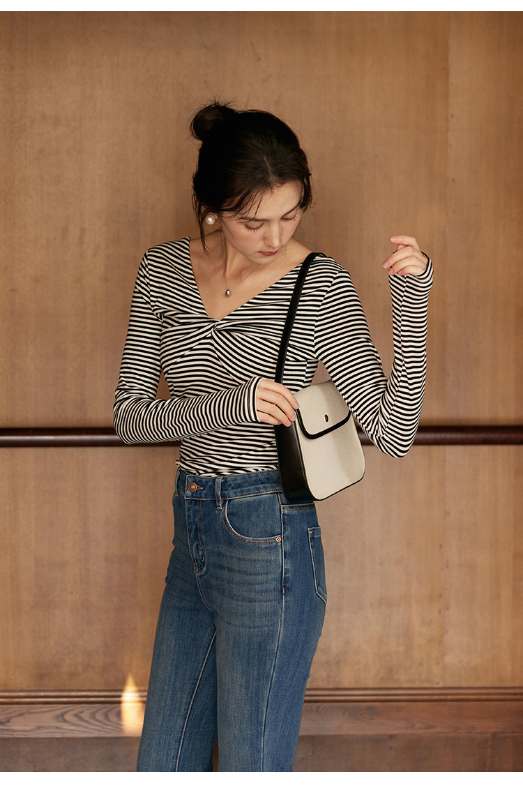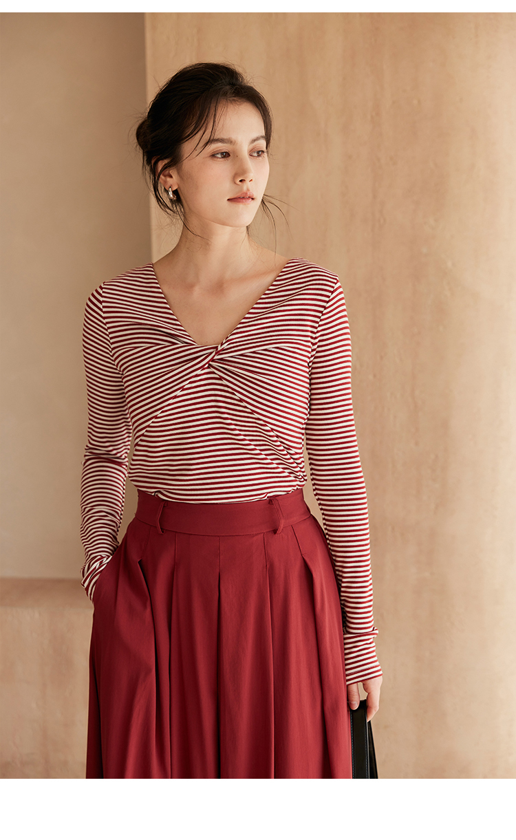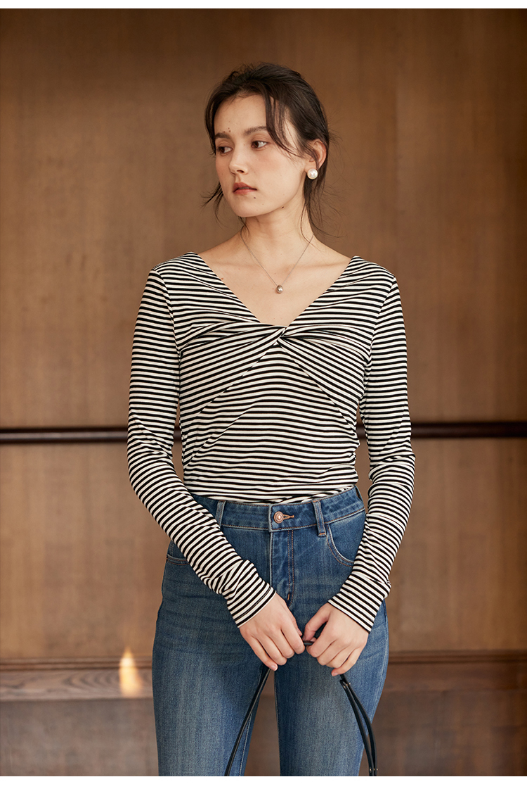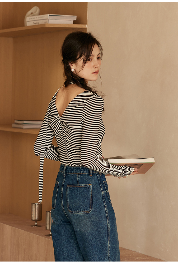 HeyDress飘带条纹T恤女春季复古V领内搭打底衫正反两穿长袖上衣