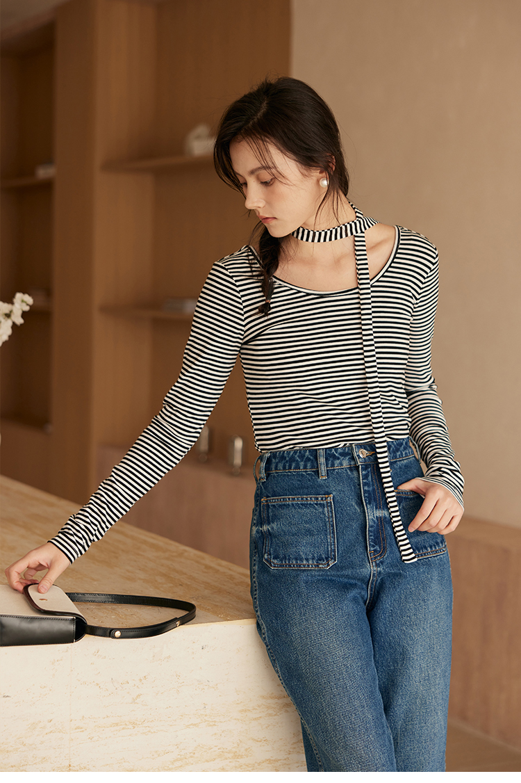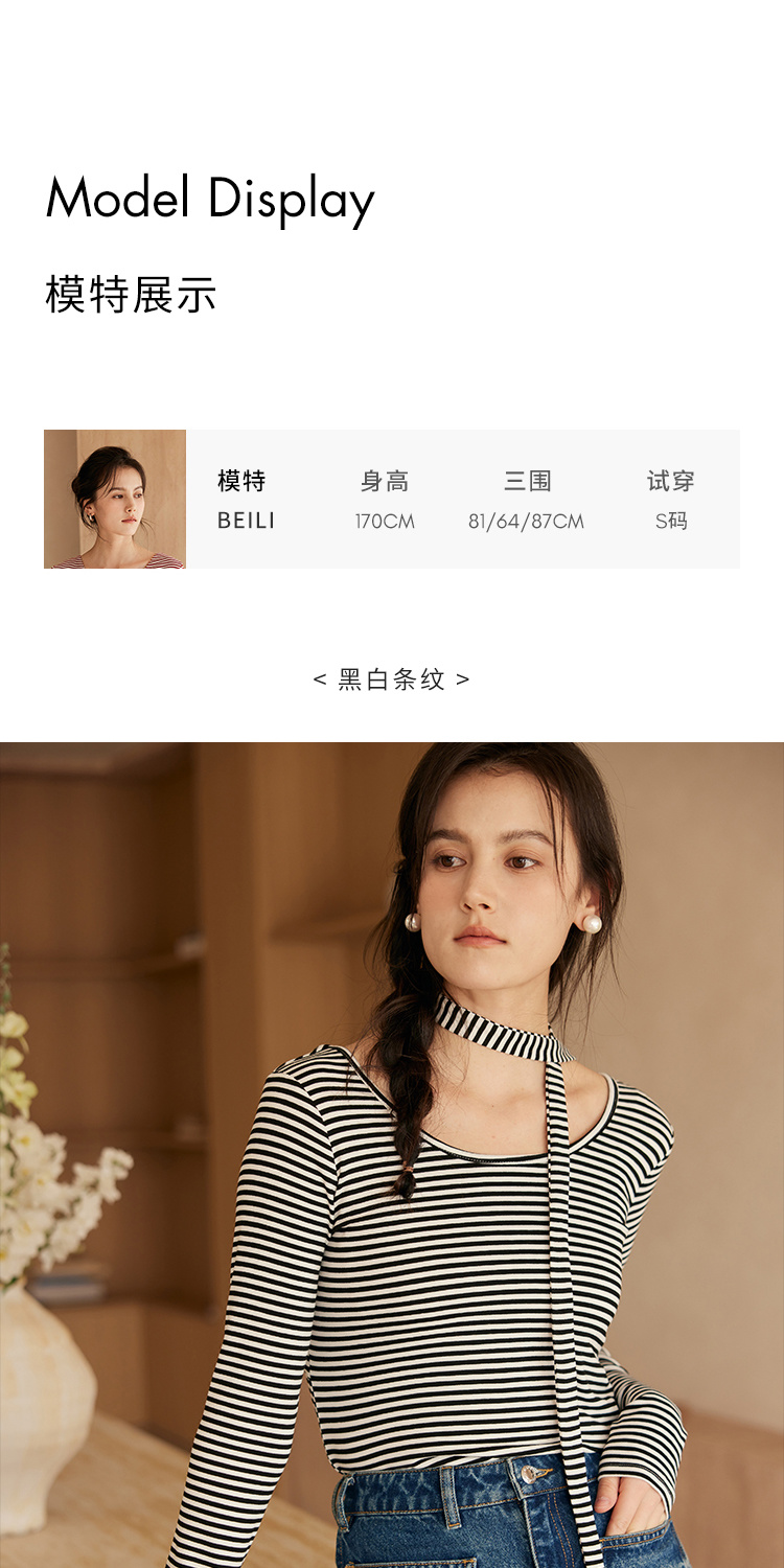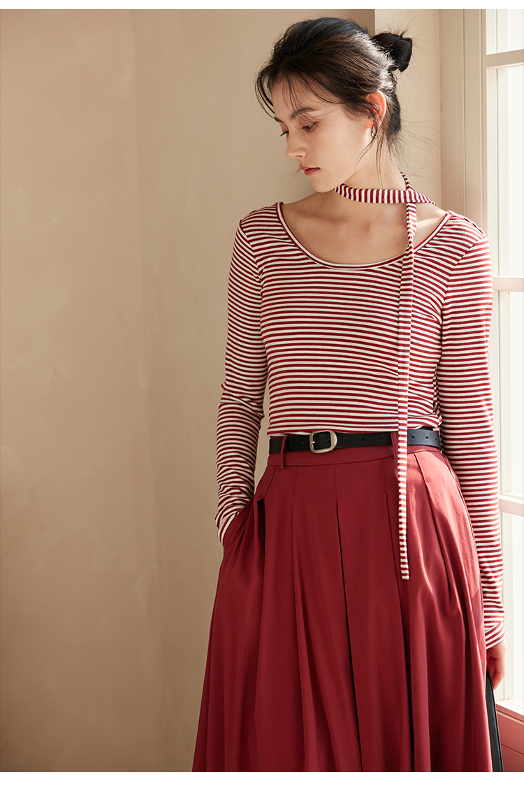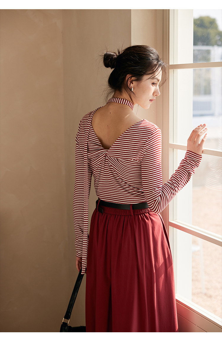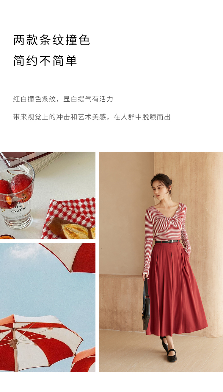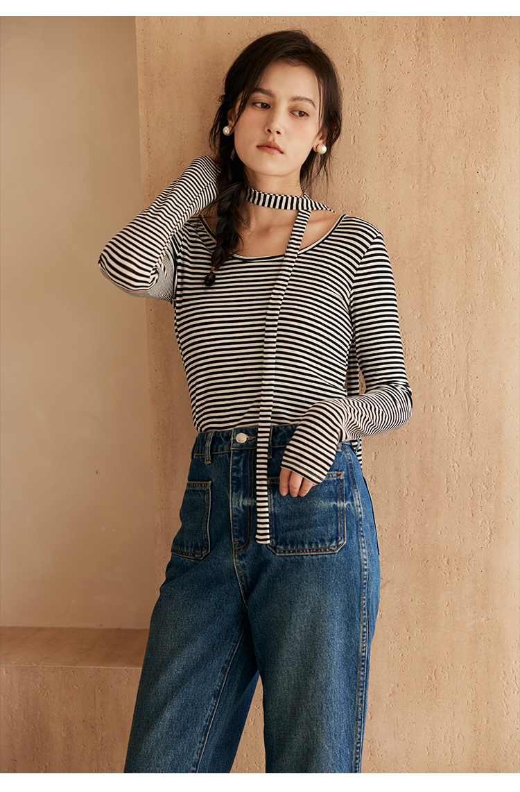 HeyDress飘带条纹T恤女春季复古V领内搭打底衫正反两穿长袖上衣