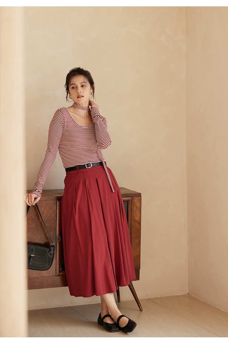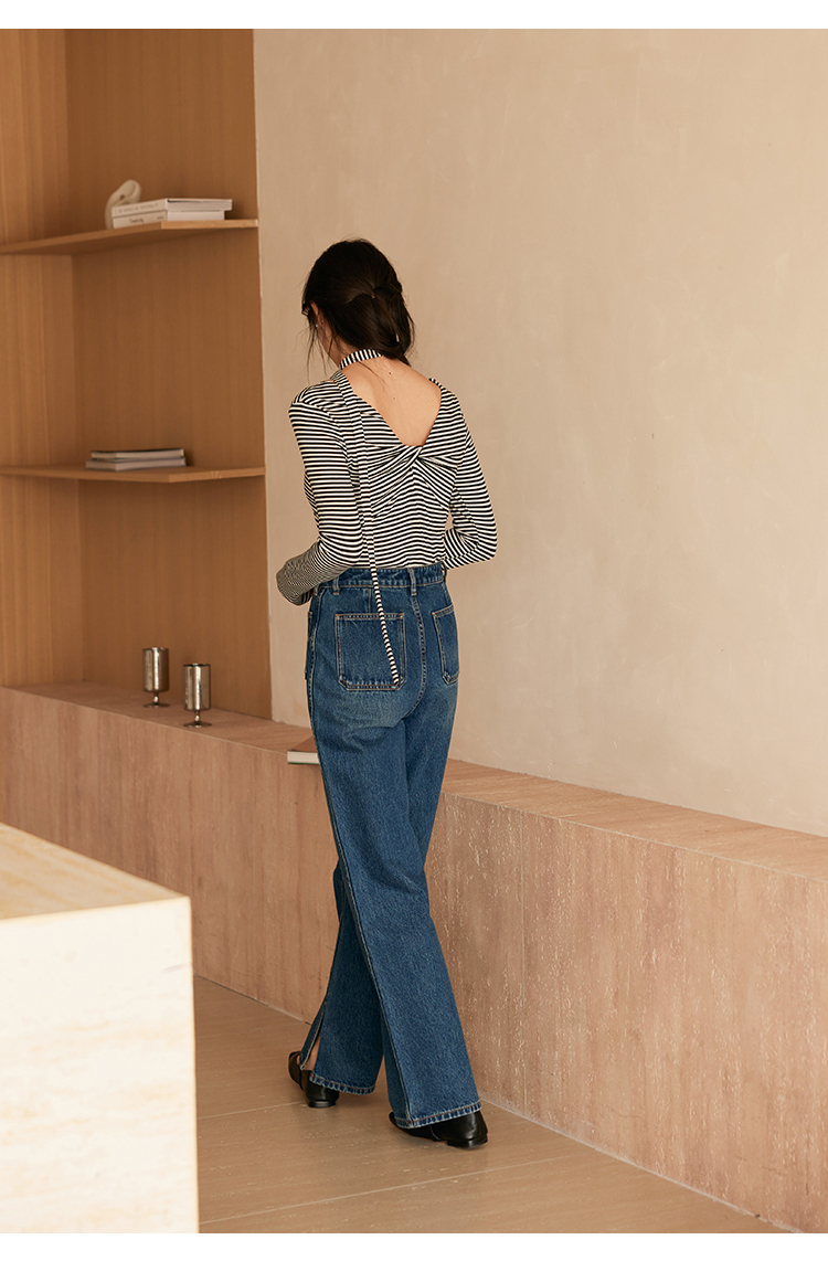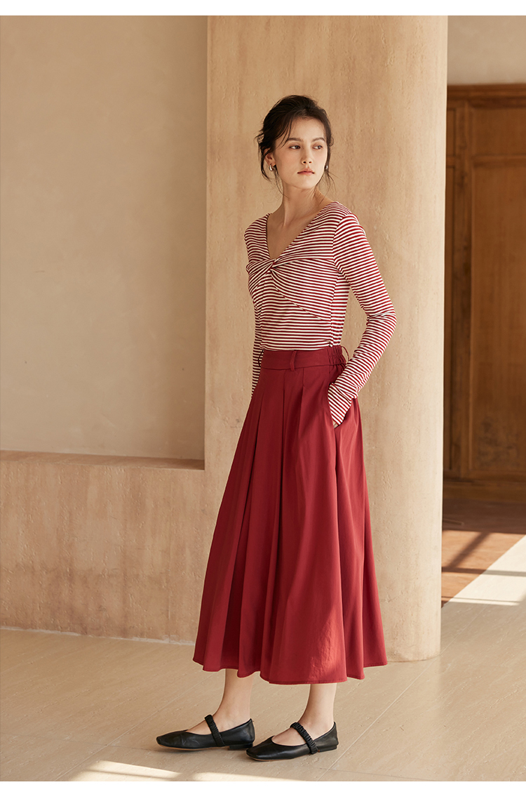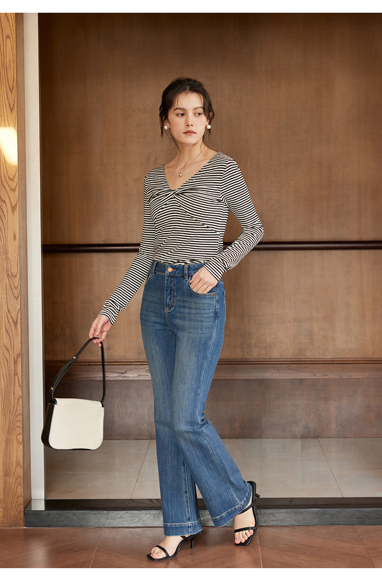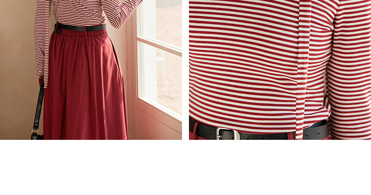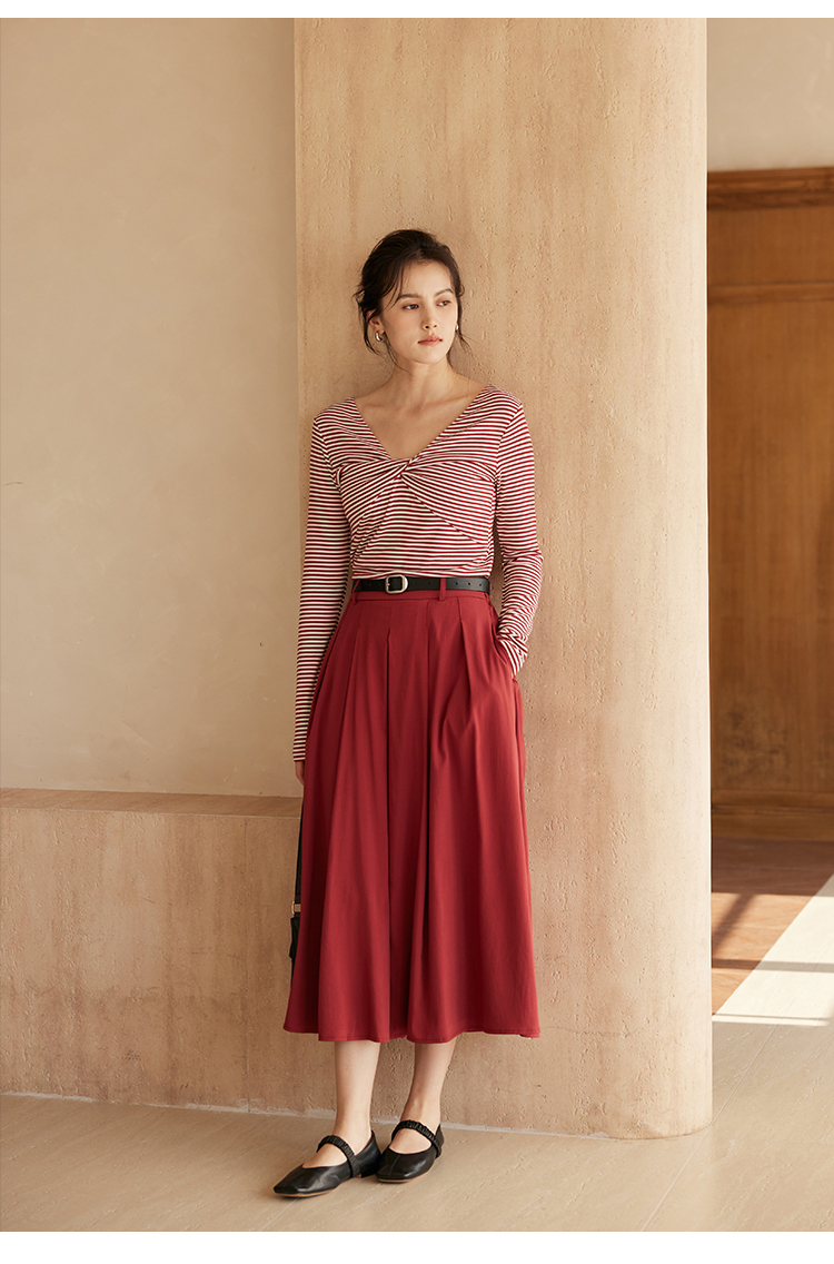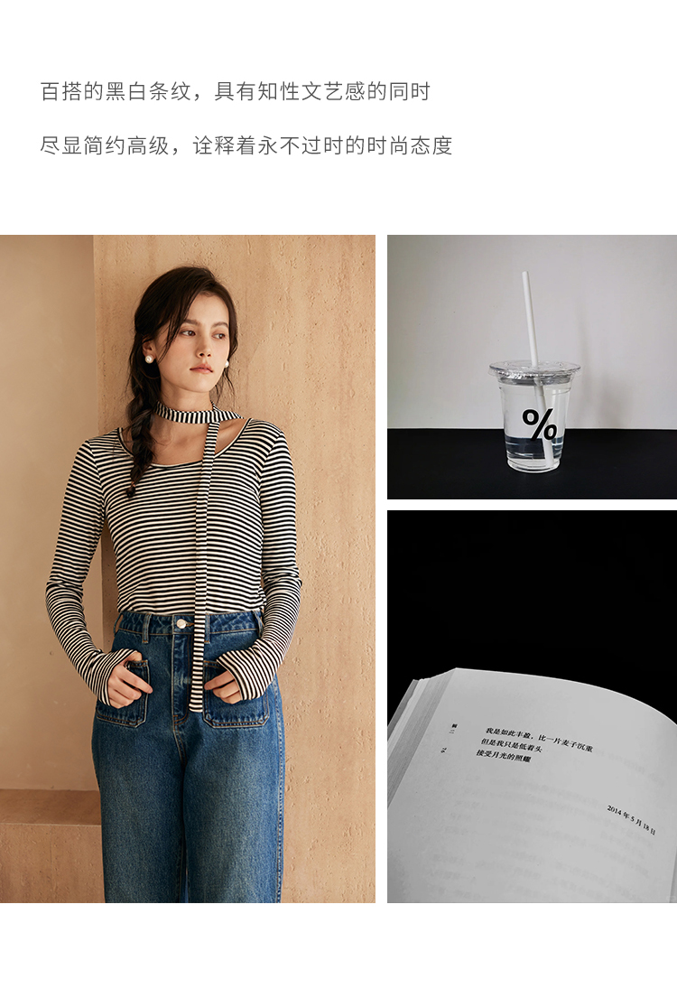 HeyDress飘带条纹T恤女春季复古V领内搭打底衫正反两穿长袖上衣