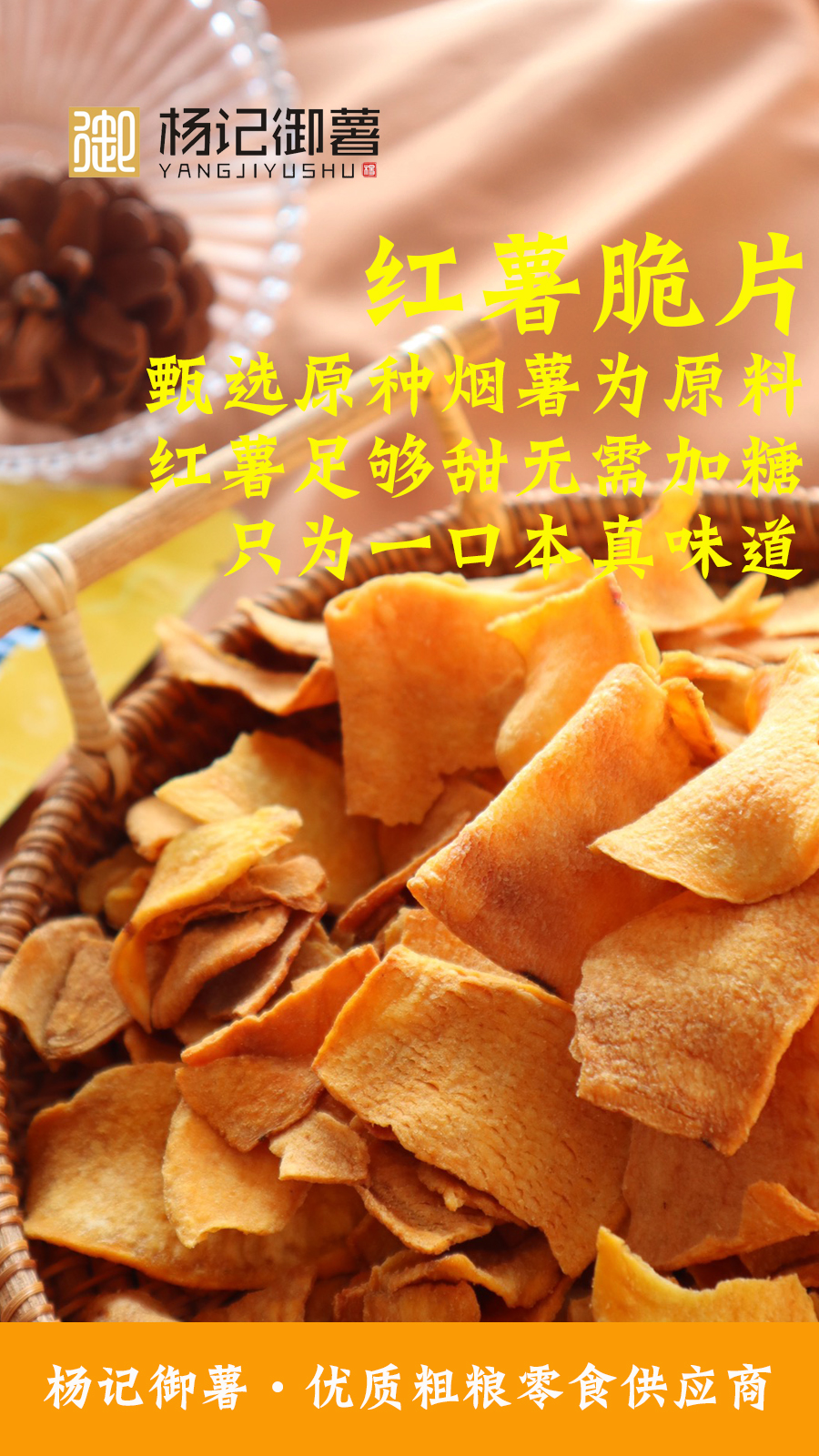 我们的红薯脆片原料甄选优质种植基地,沙土地、280度环山、早晚温差大、光照时长,都是这款薯片好吃的原因,因为种出来的红薯足够甜,无需任何添加,也能让薯片酥脆香甜,入口吃出红薯本真味道。