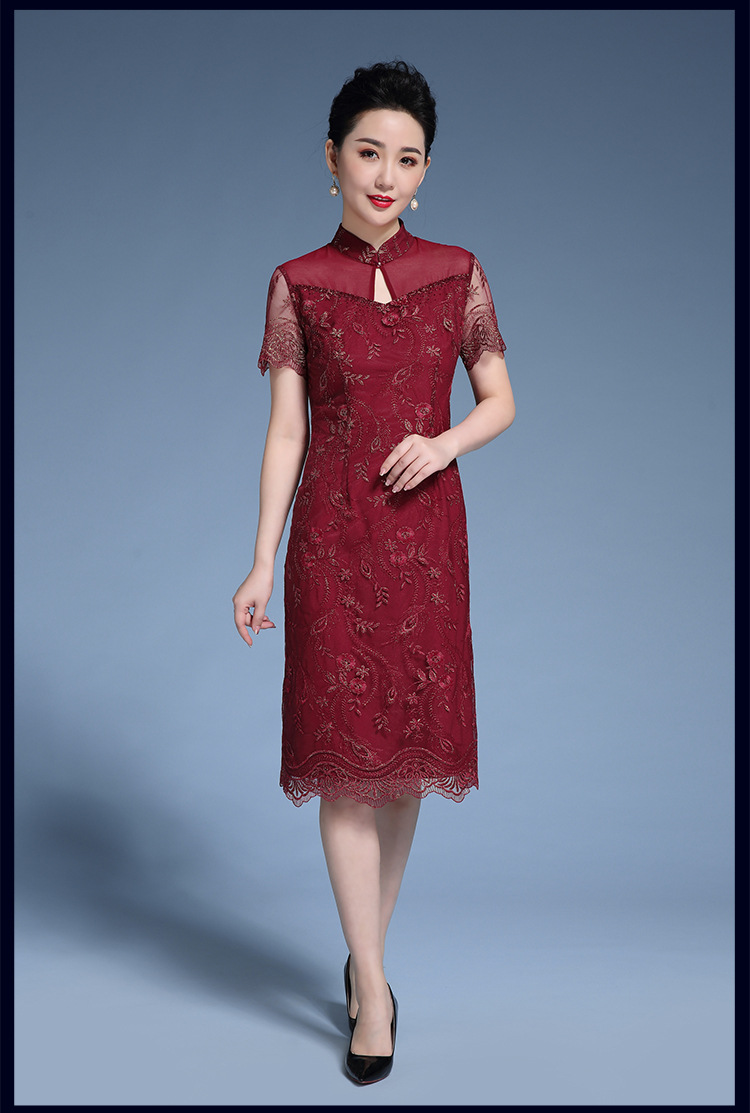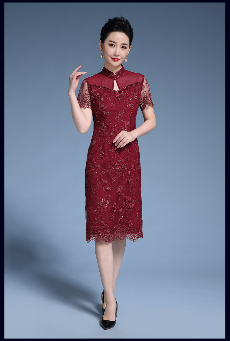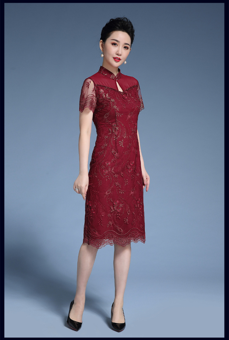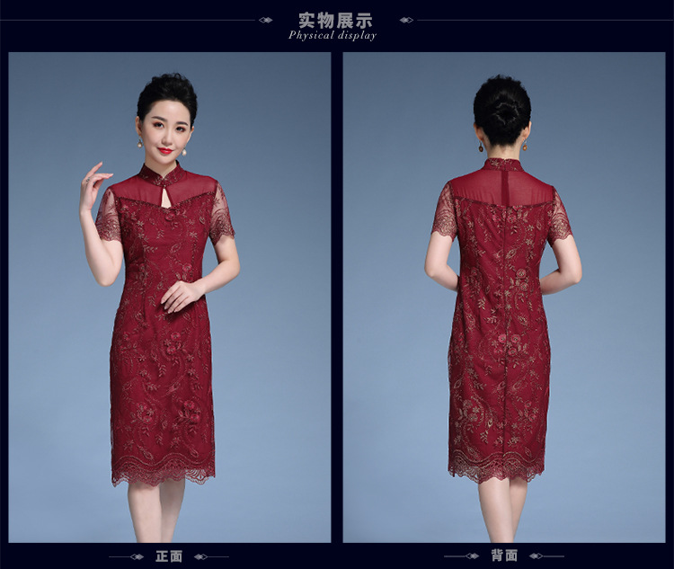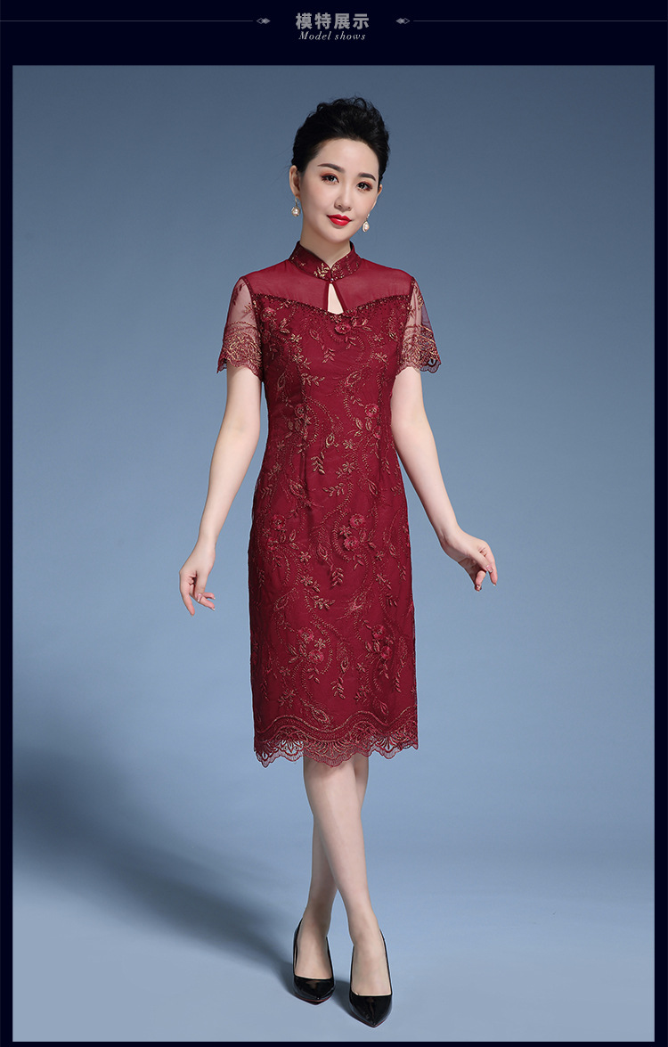 MY-92419新款时尚蕾丝短袖中长款宴会礼服改良旗袍连衣裙TZW