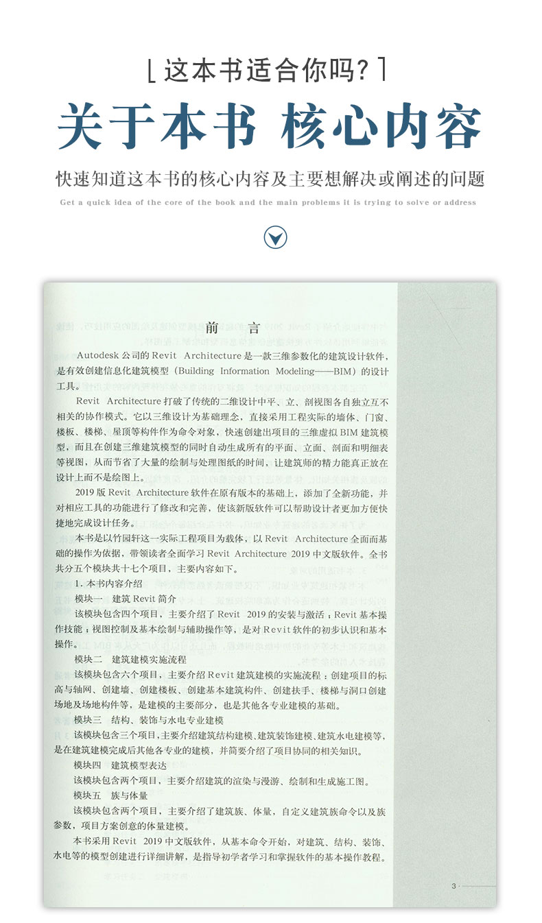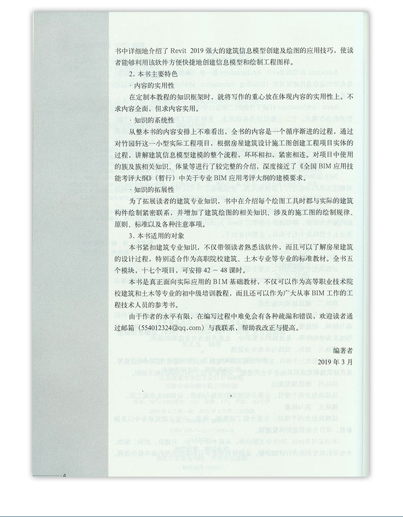 本书分为五个模块共十七个项目。模块一,建筑Revit简介,主要介绍了Revit2019的安装与激活;Revit基本操作技能;视图控制及基本绘制与辅助操作等。模块二,建筑建模实施流程,主要介绍Revit建筑建模的实施流程:创建项目的标高与轴网、创建墙、创建楼板、创建基本建筑构件、创建扶手、楼梯与洞口、创建场地及场地构件等。模块三,结构、装饰与水电专业建模,主要介绍建筑结构建模、建筑装饰建模、建筑水电建模等。模块四,建筑模型表达,主要介绍建筑的渲染与漫游、绘制和生成施工图。模块五,族与体量,主要介绍了建筑族、体量,自定义建筑族和项目方案创意。