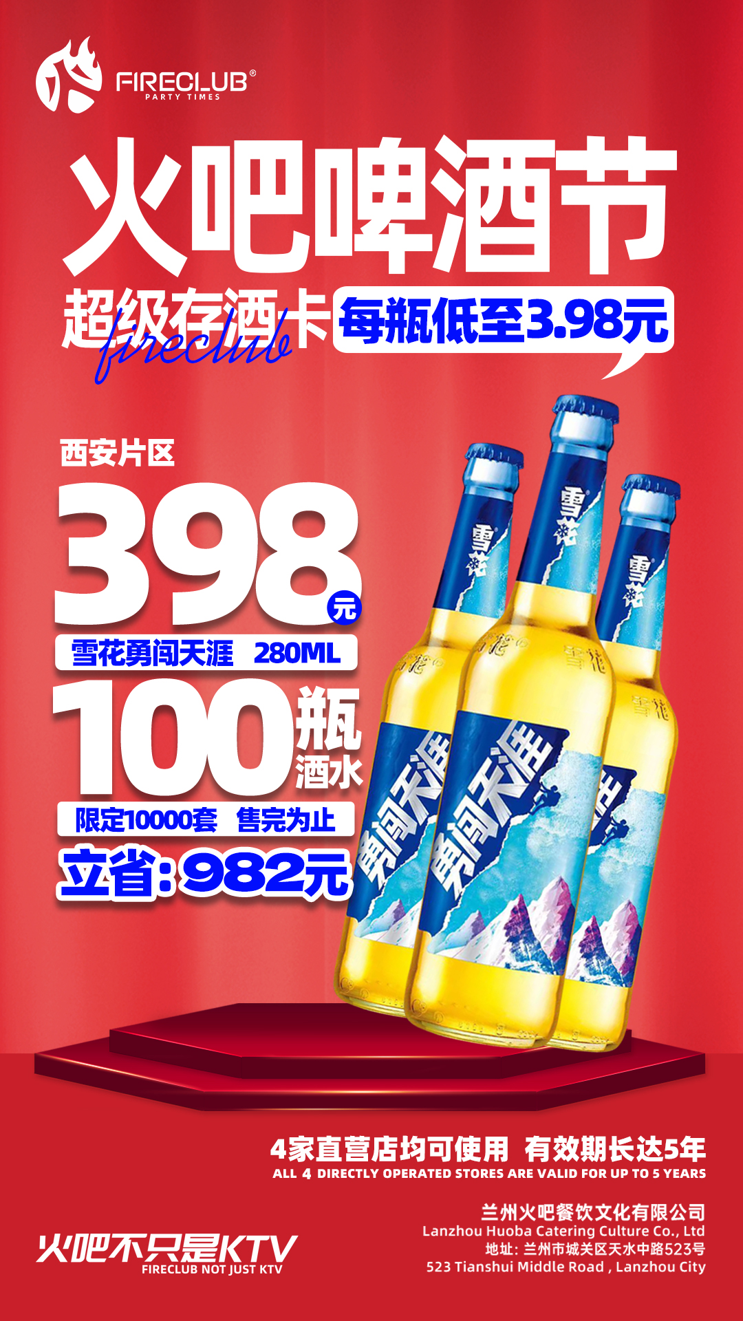 【西安通用】118火吧啤酒节—超值存酒卡—398元100瓶雪花勇闯280ml