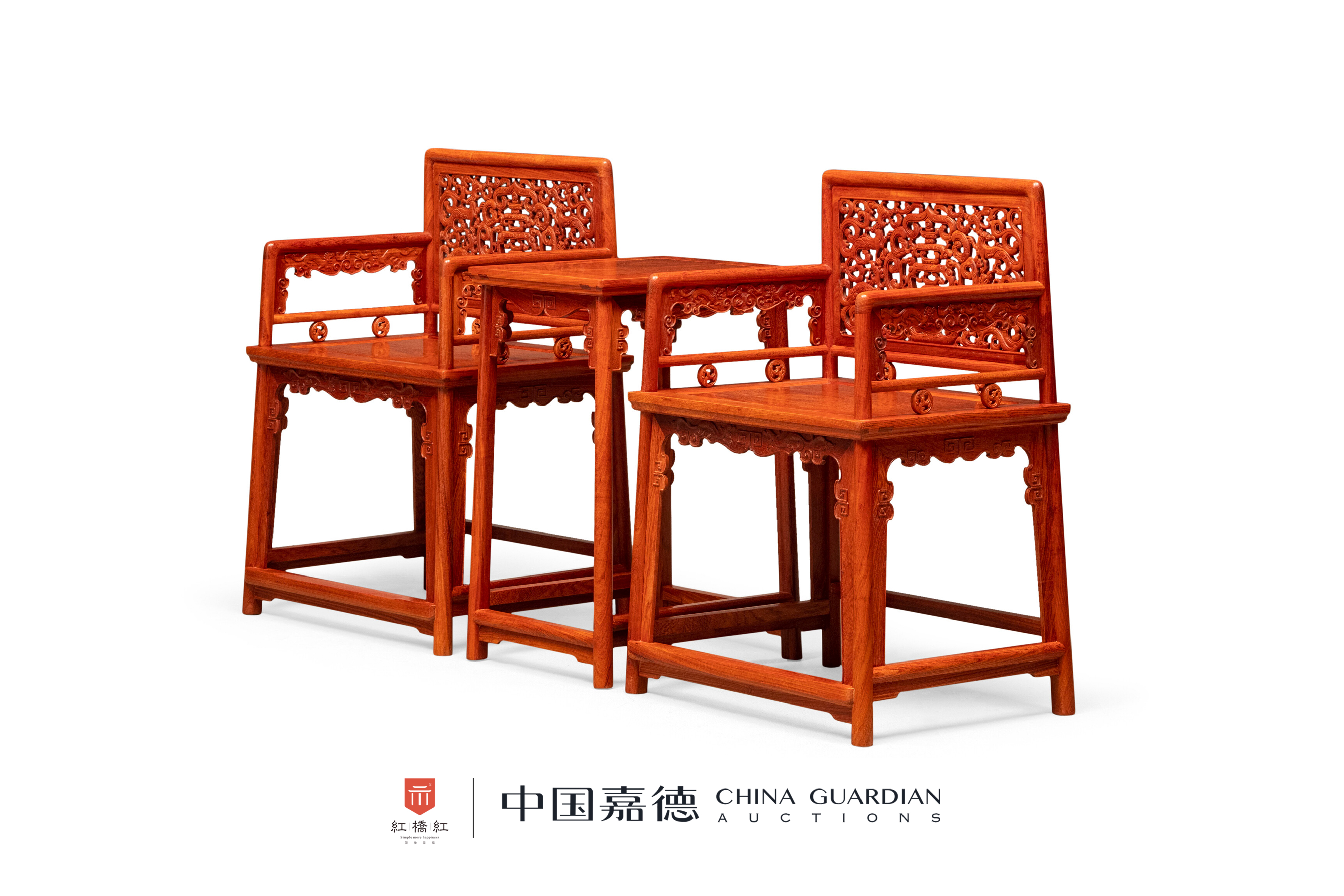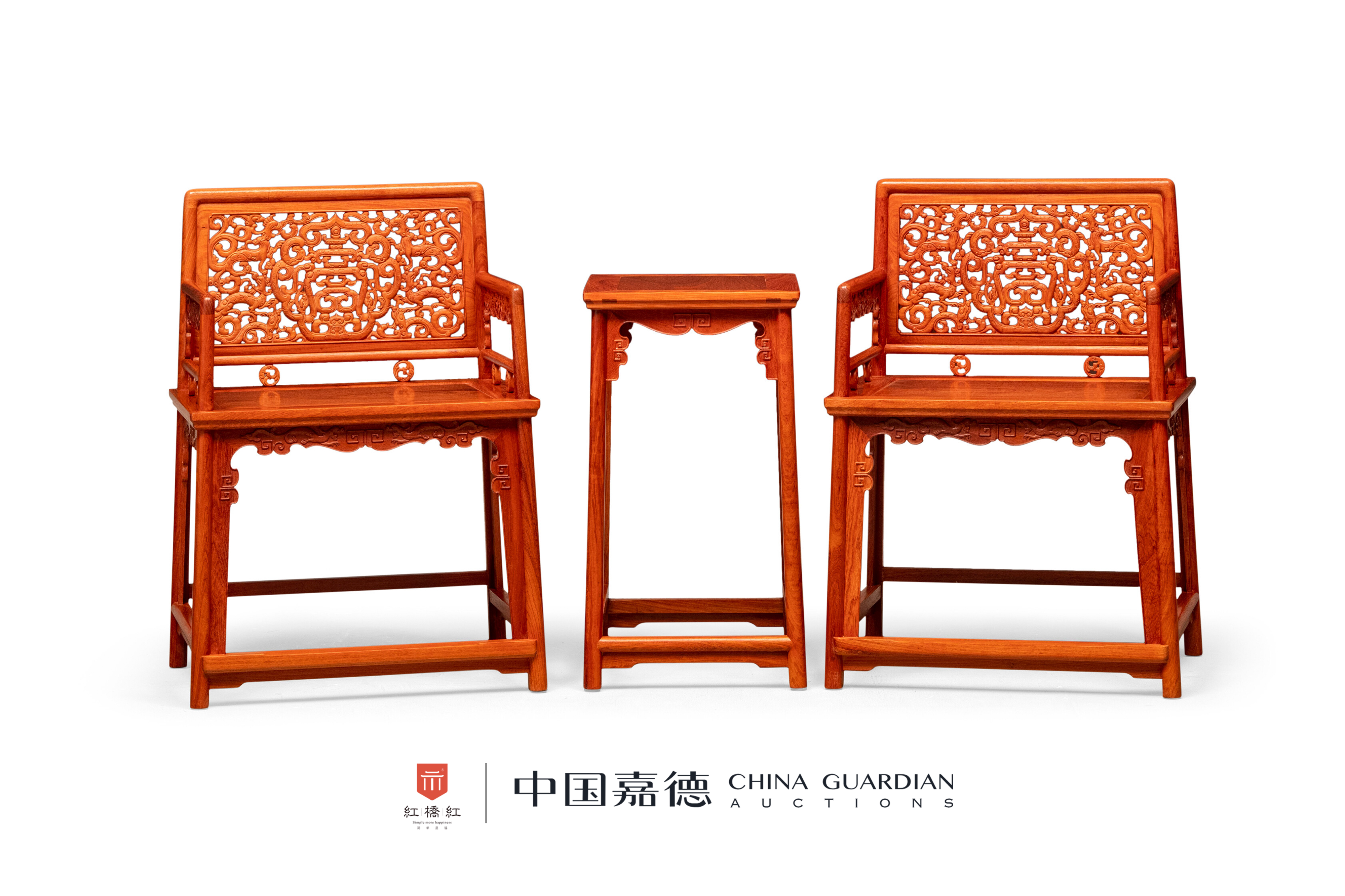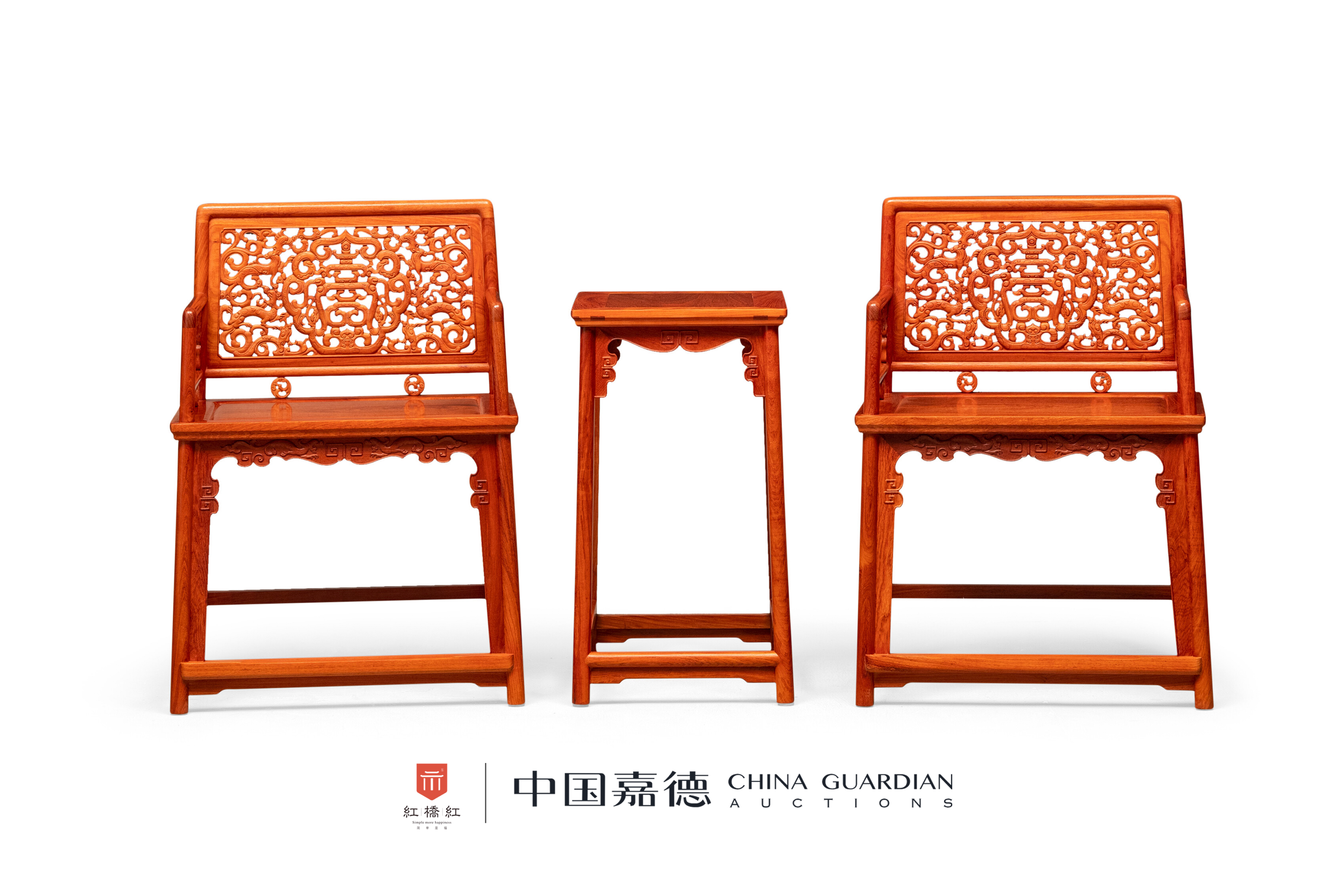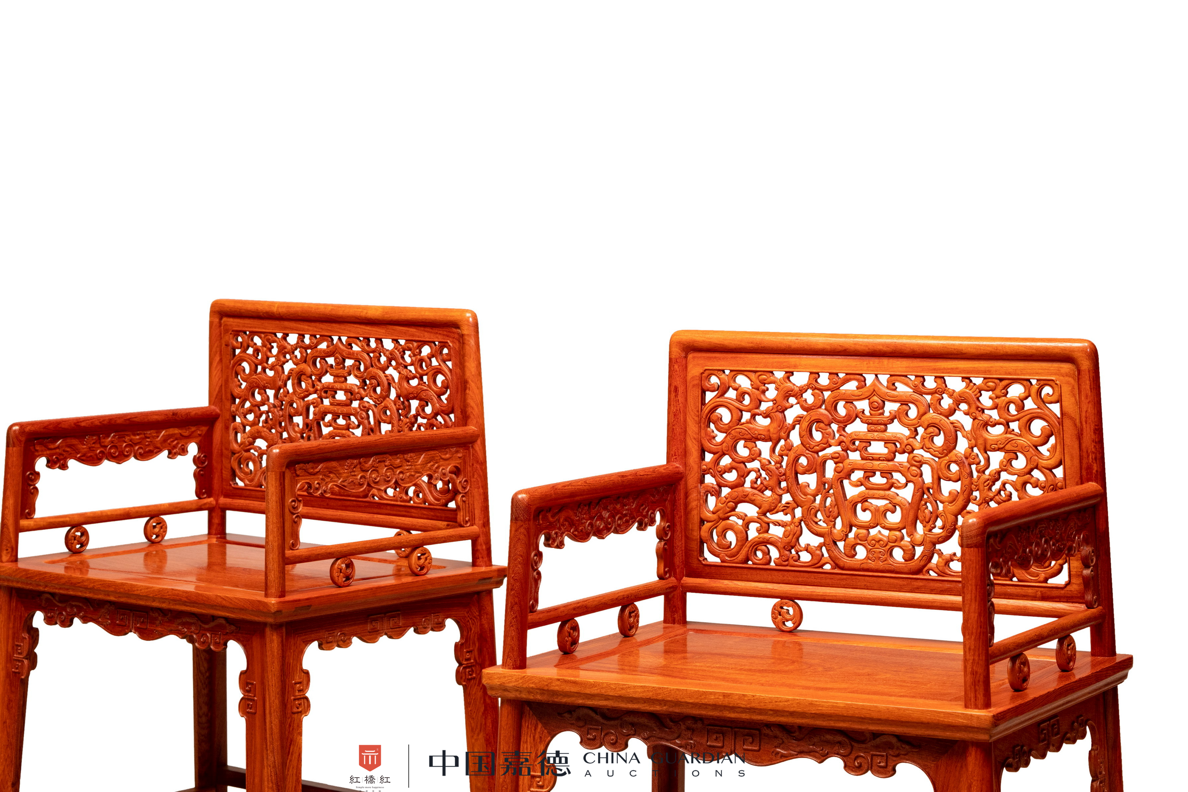玫瑰椅成对,以缅甸花梨木制,搭脑平直,扶手亦平直,以眼袋锅榫与前后腿上部相交,在所形成的方形空间内下方靠近椅面的地方,设横枨,横枨下设卡子花。搭脑与横枨之间的空间内嵌装绦环板,浮雕螭龙捧寿纹。椅面格角攒边框镶嵌板心,落堂起鼓作,冰盘沿线脚。前后腿上部与前后腿一木连作,穿过椅盘向下成为腿足,微有侧脚。腿足间设浮雕回纹的壸门式券口牙子,腿足间底部设步步高赶枨,正面及侧面赶枨下设光素刀牙板。