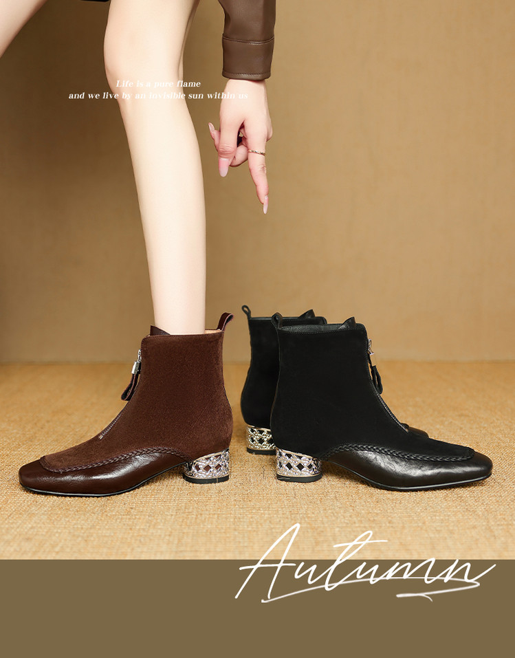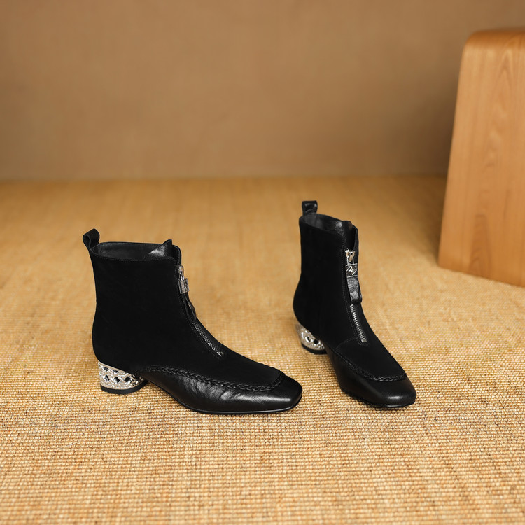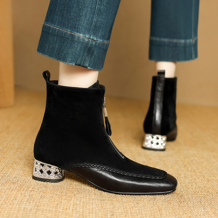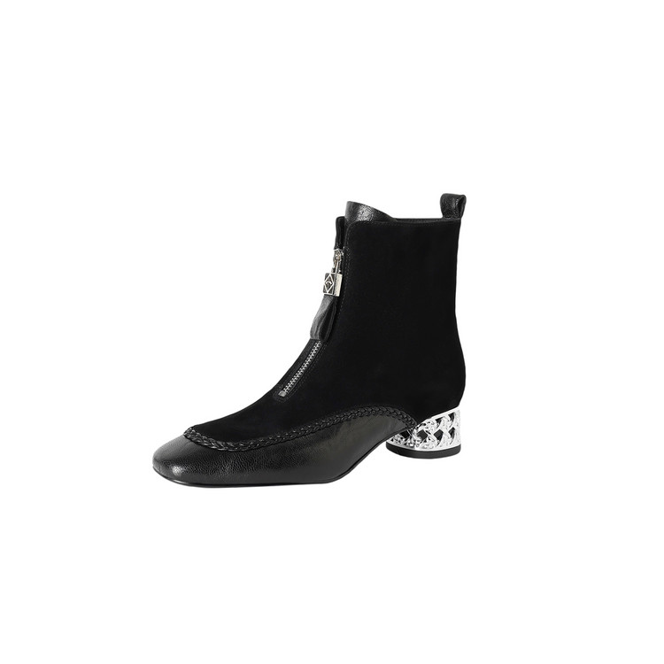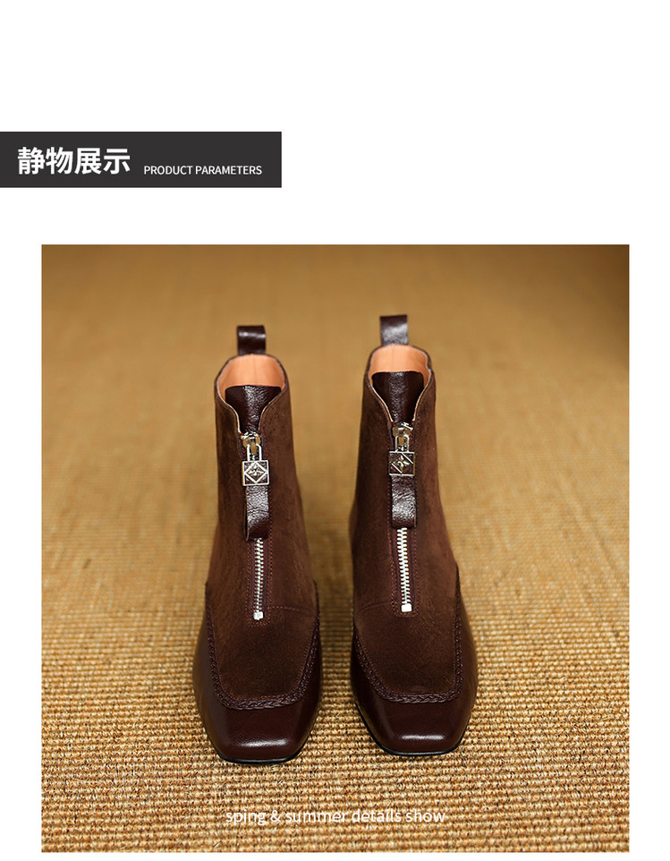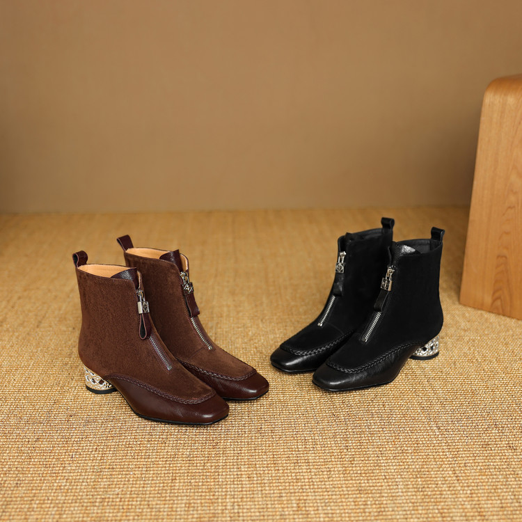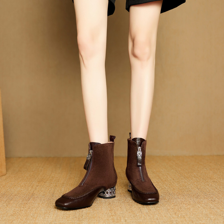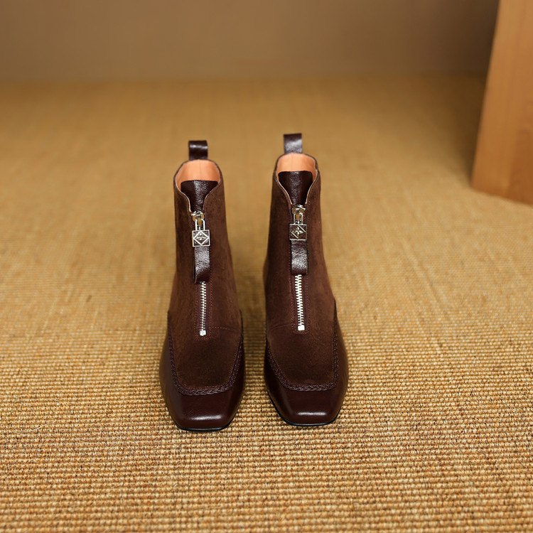 【预售5天】复古方头真皮粗跟短靴女秋冬新款前拉链软底骑士靴百搭单靴中跟靴NJMK&K1763