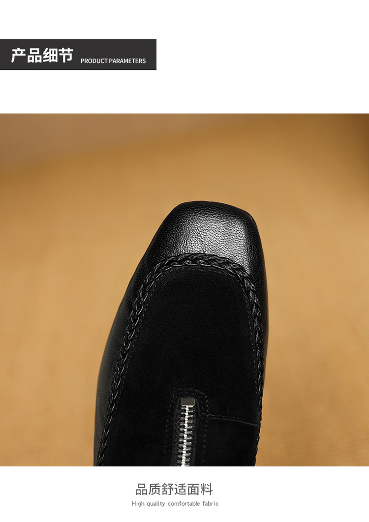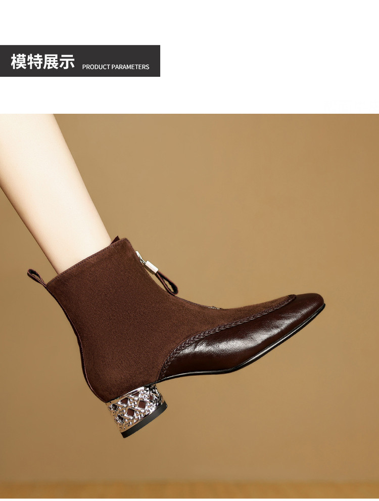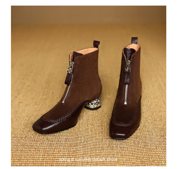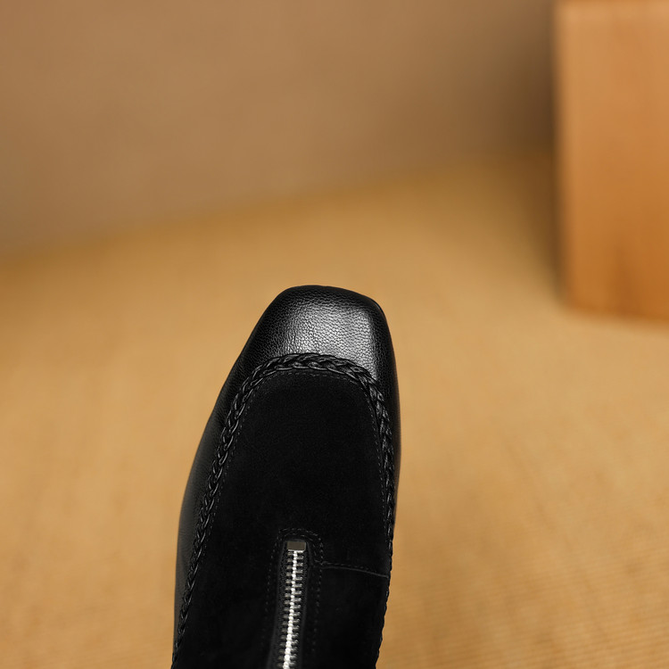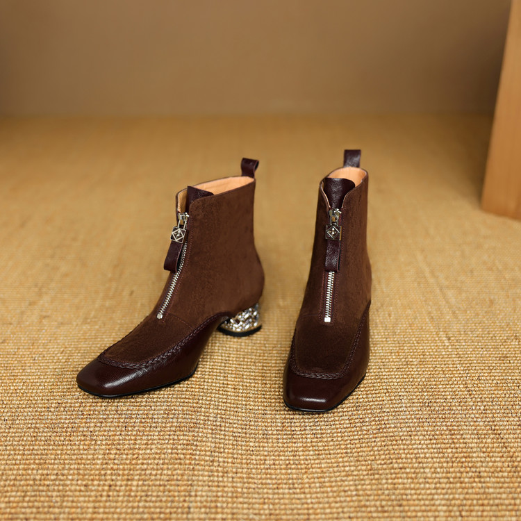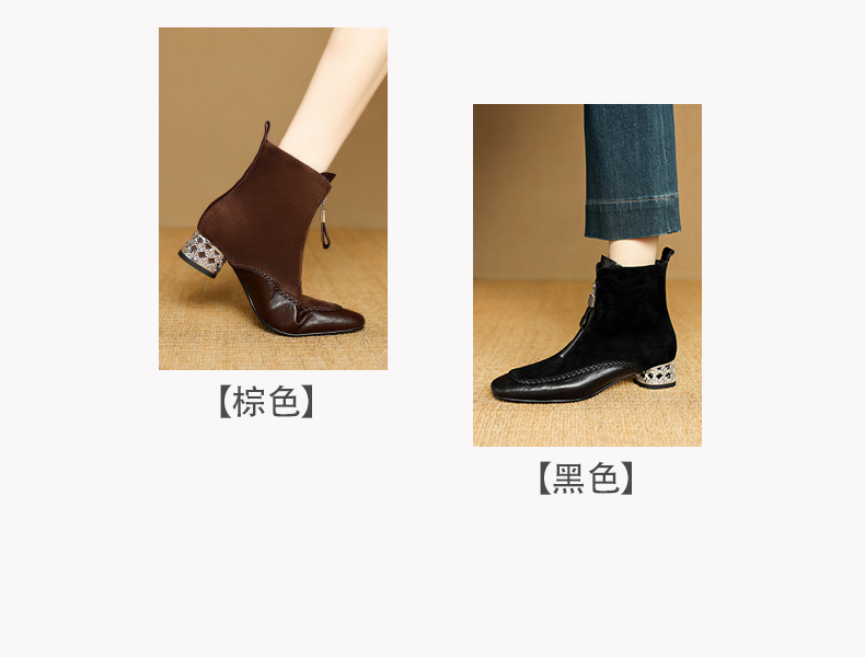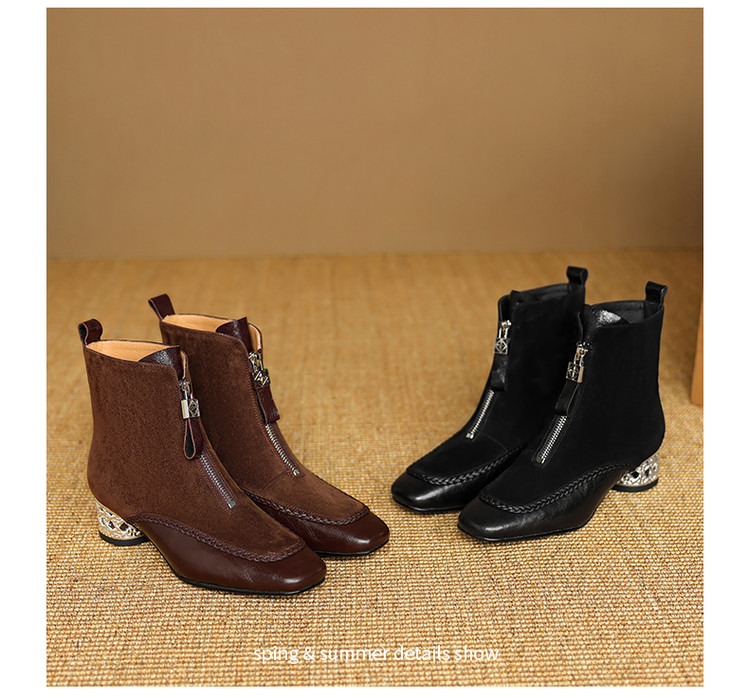 【预售5天】复古方头真皮粗跟短靴女秋冬新款前拉链软底骑士靴百搭单靴中跟靴NJMK&K1763