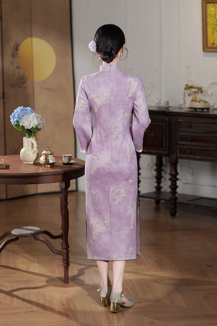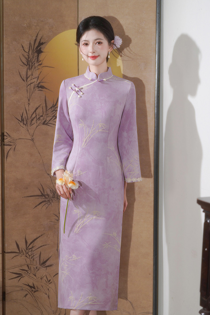 款新款日常通勤长款旗袍 秋冬淑女气质麂皮绒加绒显瘦旗袍 763