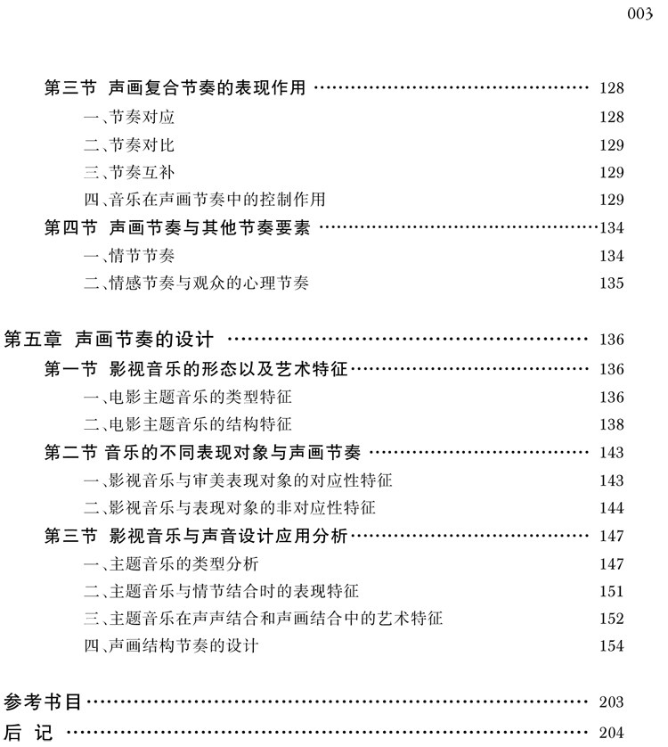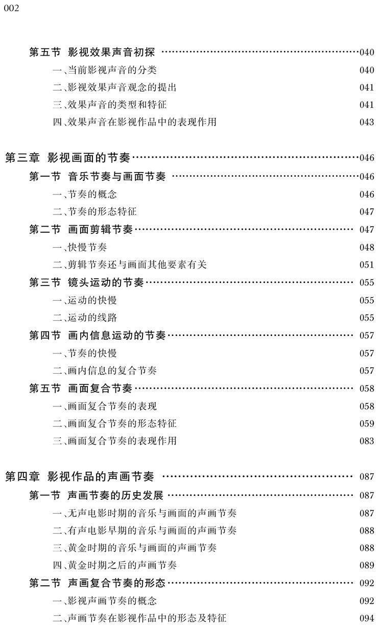 该书系“四川音乐学院电子音乐理论与技术丛书”之一。全书共分五章,分别为:关于节奏,从节奏的概念、艺术的节奏、影视要素的节奏方面进行了详细的阐述;影视声音的节奏,对音乐的节奏、人声的节奏、自然声的节奏、声音复合节奏、影视效果声音初探进行了全面地剖析;影视画面的节奏,把音乐节奏与画面节奏、剪辑节奏、镜头运动的节奏、画内信息运动的节奏、画面复合节奏结合不同影片镜头的画面剪辑从纵向发展的手段进行了全面解析;影视作品的声画节奏,更是将一部部影视作品中的镜头运动从声画节奏的历史发展、形态特征和表现作用方面进行了详细介绍;声画节奏的设计,将从影视音乐的形态以及艺术特征、音乐的不同表现对象与声画节奏、影视音乐与声音设计应用分析方面入手对影视作品中的主题音乐类型、结构特征做了深入且对比性的研究。