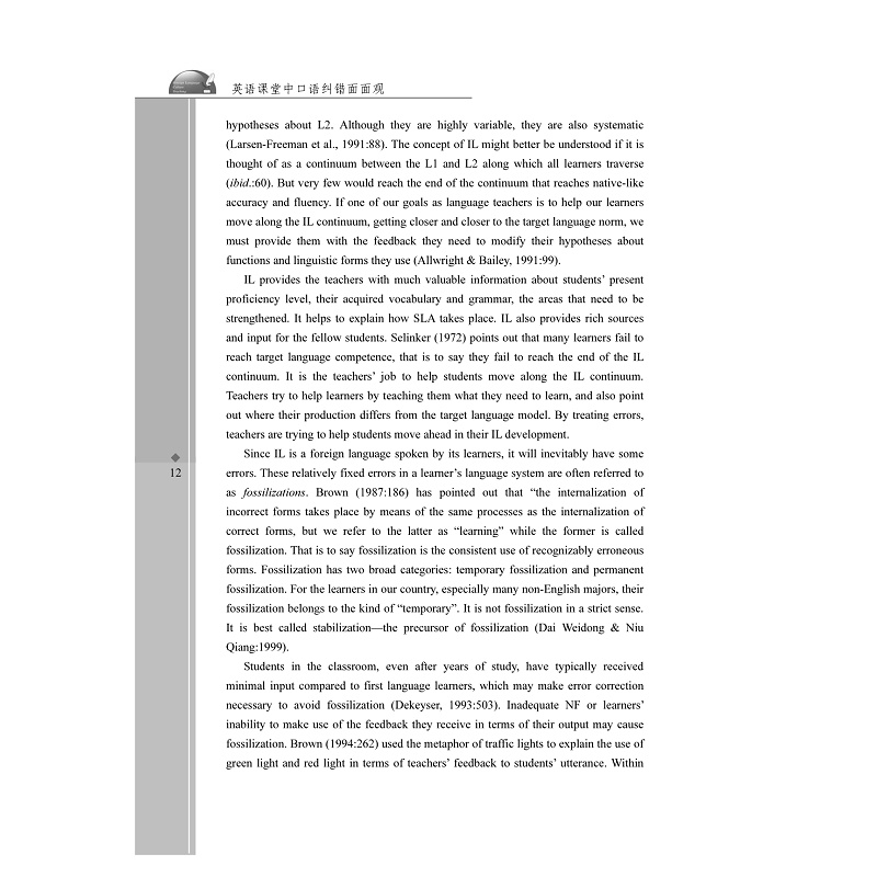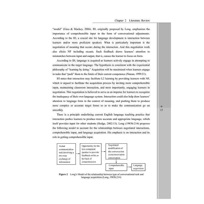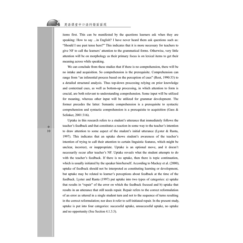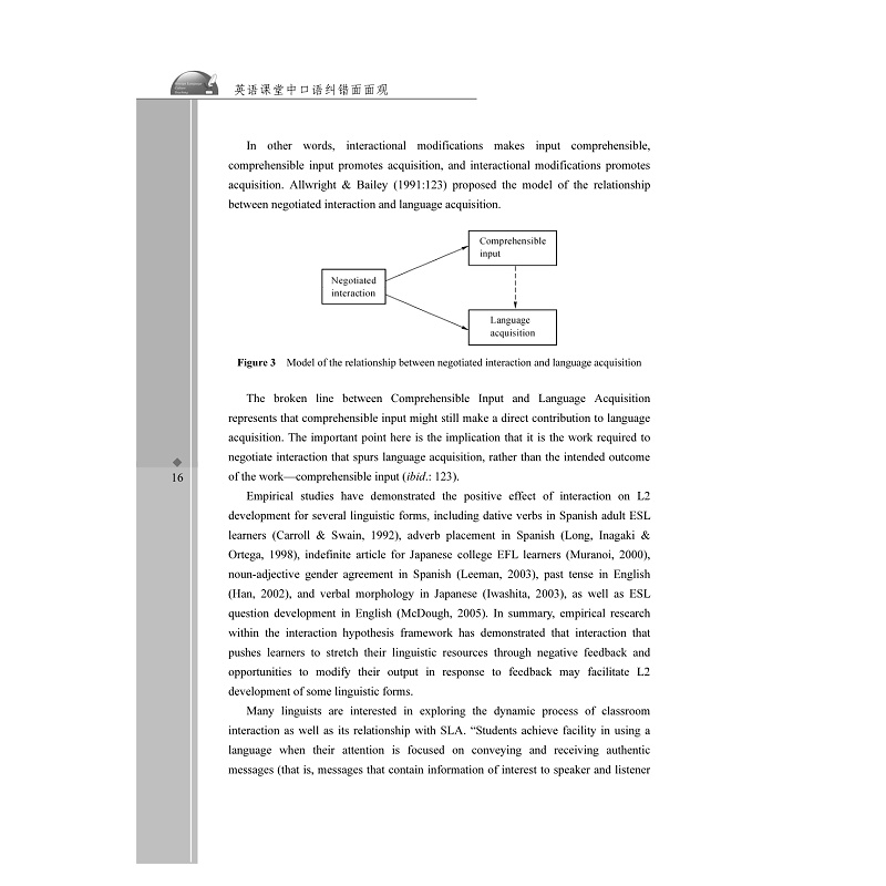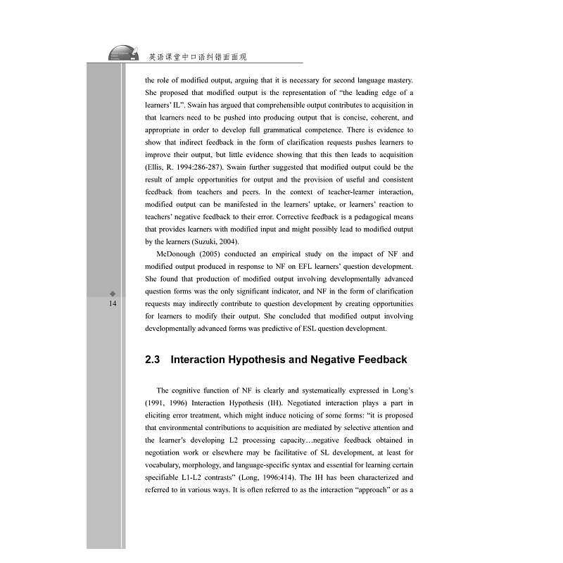 本书主要研究了英语作为外语的教学课堂(EFL)中负反馈(negative feedback)在二语习得中的作用。负反馈的作用一直受到争议。但是,多数的学者认为负反馈对于语言习得,尤其是精确度的提高是有作用的。但是,由于缺乏对负反馈的实质和作用方面的实证研究,它的作用一直也被怀疑。从教学法的角度,许多教师因为害怕负反馈会挫伤学生发言的积极性,也不愿意使用负反馈,而是听之任之。 该研究通过课堂口语的录音资料,通过比较控制班和实验班的口试成绩和语法成绩,揭示了非刻意负反馈在以意义为重点的口语活动中的表现形式、特点和有效性。