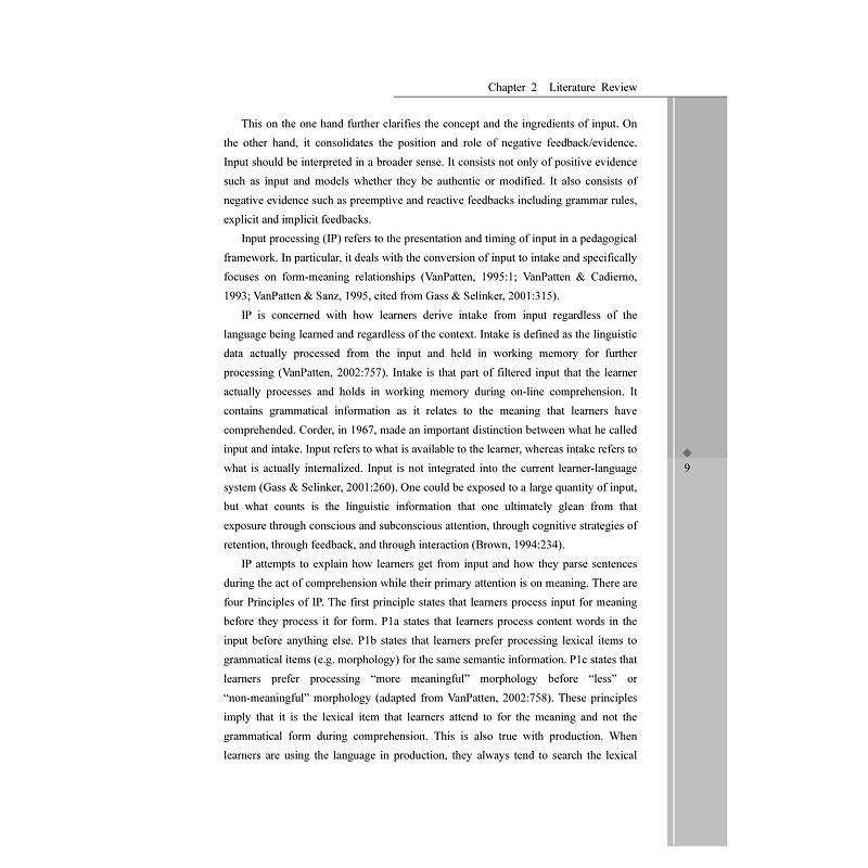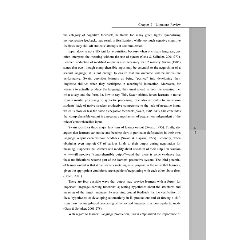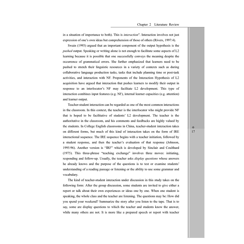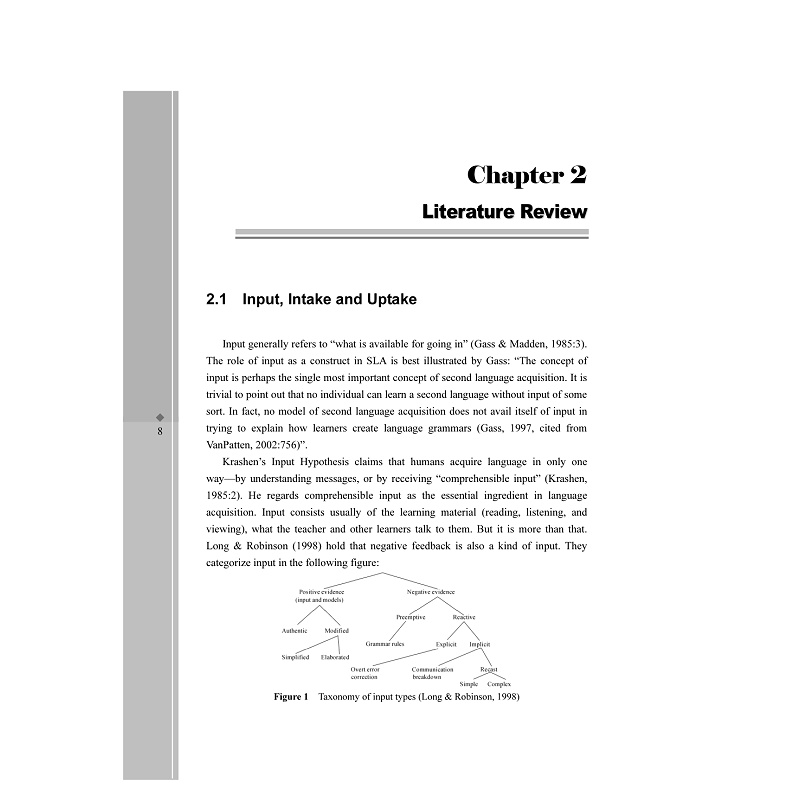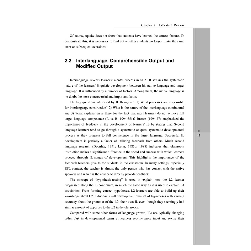 本书主要研究了英语作为外语的教学课堂(EFL)中负反馈(negative feedback)在二语习得中的作用。负反馈的作用一直受到争议。但是,多数的学者认为负反馈对于语言习得,尤其是精确度的提高是有作用的。但是,由于缺乏对负反馈的实质和作用方面的实证研究,它的作用一直也被怀疑。从教学法的角度,许多教师因为害怕负反馈会挫伤学生发言的积极性,也不愿意使用负反馈,而是听之任之。 该研究通过课堂口语的录音资料,通过比较控制班和实验班的口试成绩和语法成绩,揭示了非刻意负反馈在以意义为重点的口语活动中的表现形式、特点和有效性。