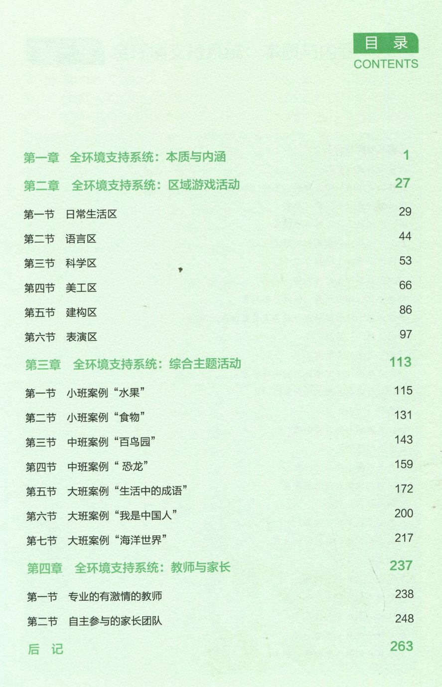 本套丛书是北京师范大学教育学部、深圳市投资控股有限公司幼教管理中心和市属公办幼儿园“三位一体”,尝试“高校、举办者、幼儿园”伙伴合作,共同打造具有中国实践特色的本土化幼教课程模式的一次积极尝试,在深圳优秀市属公办幼儿园二十余年办园沉淀基础上,融合中西方先进幼教理念和教学方法,立足本土文化和中国城市儿童特点,探索构建具有中国本土化特色的幼儿园课程。 《幼儿园全环境支持系统课程:探索与成长》立足于深圳市梅林一村幼儿园园本课程《全环境教育》的构建与教育实践,介绍园本课程构建中对全环境支持系统与儿童学习与发展的认识与理解,分享园本课程教育实践特色即实施途径有序的一日生活、有准备的学习环境、有激情的专业教师、自主参与的家长。全书分为四章:第一章对全环境支持系统进行了全面介绍。第二章介绍全环境支持系统在区域游戏活动中的运用。第三章分享了全环境支持系统下综合主题活动案例。第四章是对全环境支持系统下教师与家长角色及其发展的一个总结。总体而言,全书理论与实践结合,图文并茂,具有一定的实践参考价值。