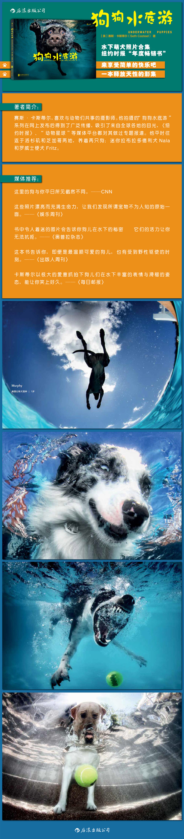 这是一本定格爱宠天真童年的影集。《狗宝宝水底游》是赛斯·卡斯蒂尔拍摄的水下幼犬照片的合辑,他以新颖的水下活动与互动形式捕捉到幼犬活泼、天真的一面,照片生动逗趣,会让读者发自内心地微笑。