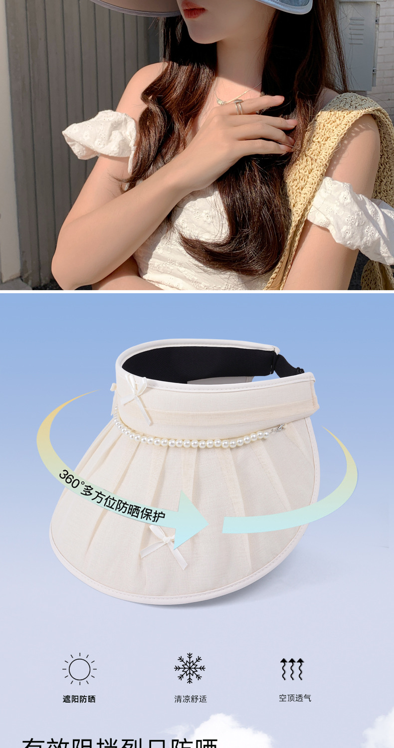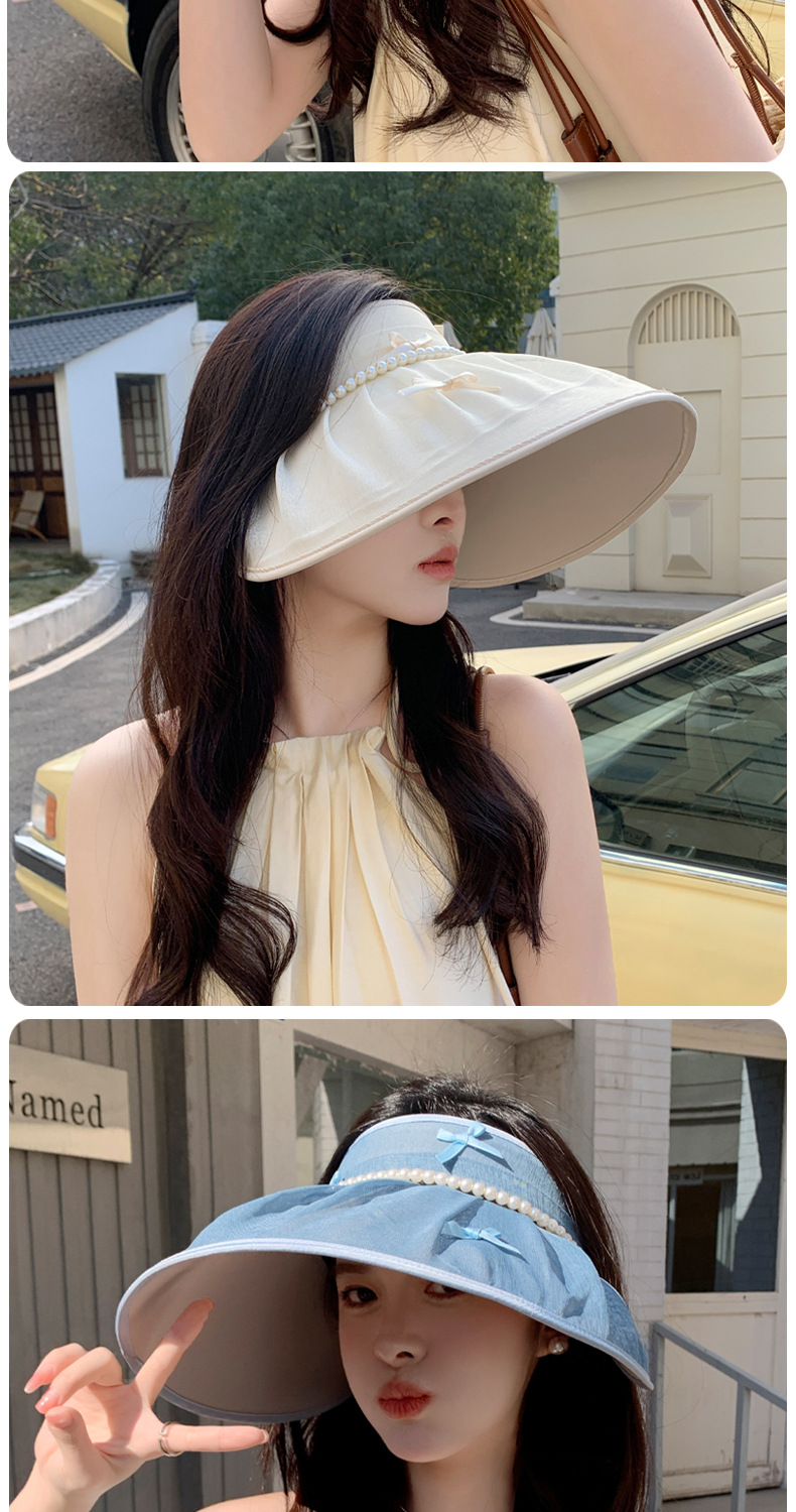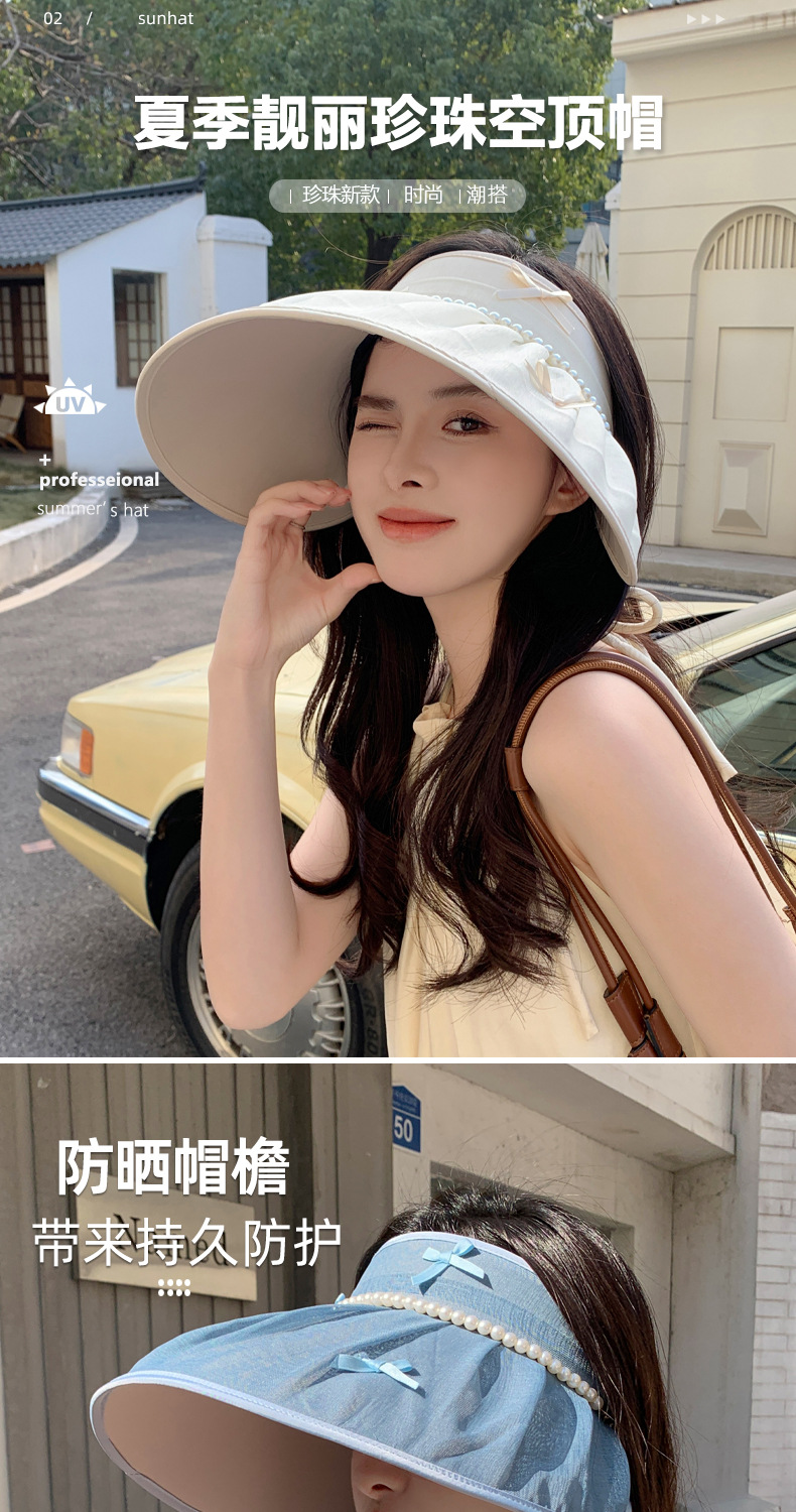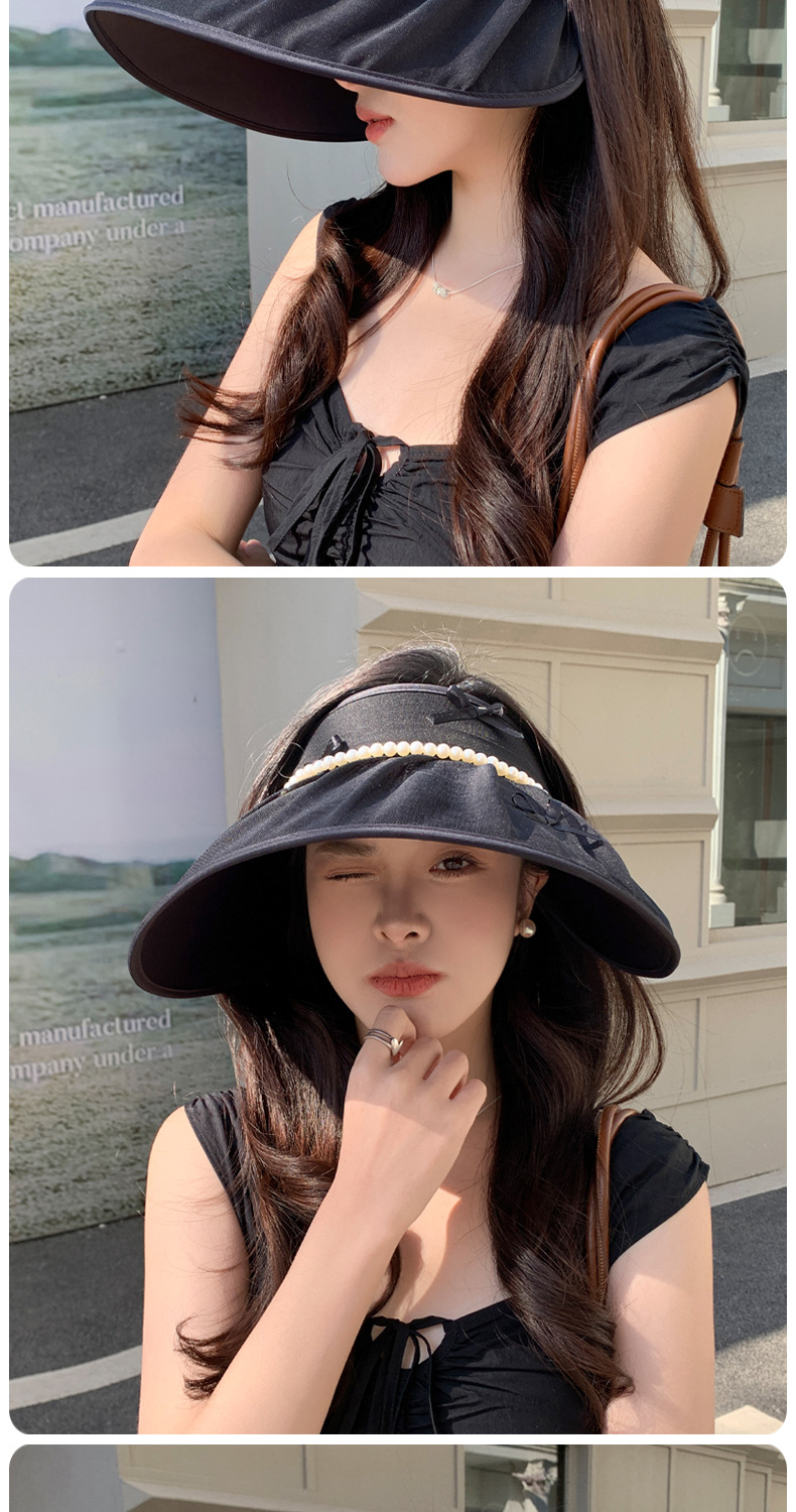 雀说夏季防晒帽子女珍珠蝴蝶结大帽檐遮阳帽韩版时尚小香风空顶太阳帽AL8785