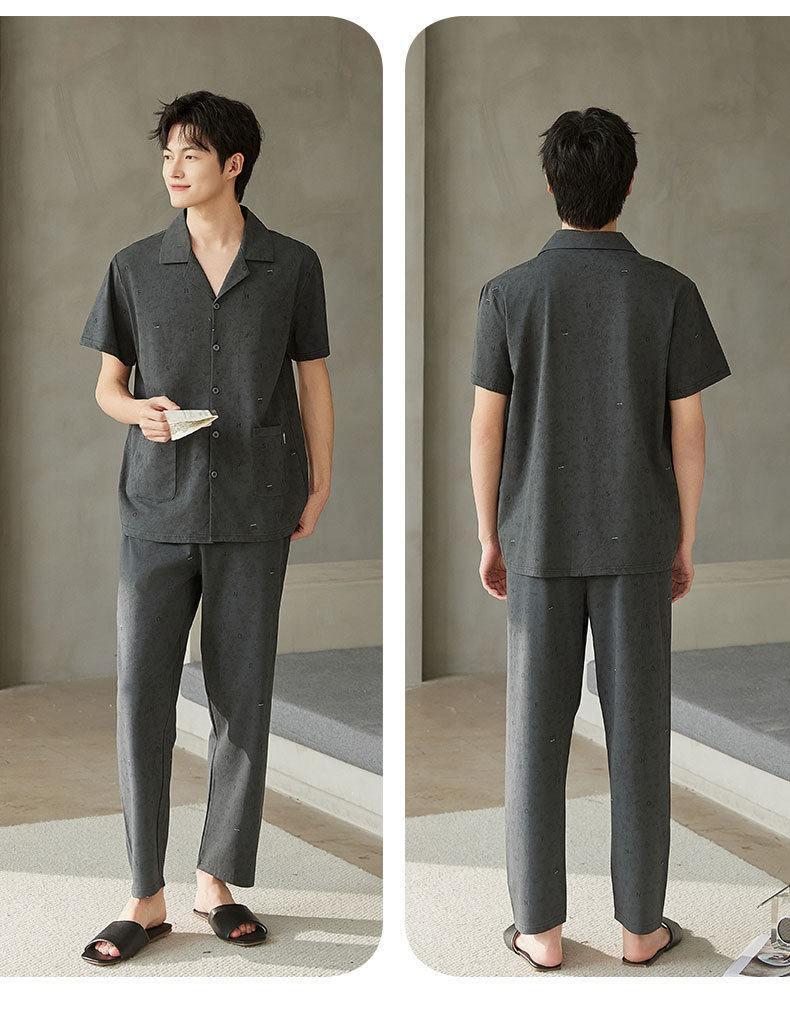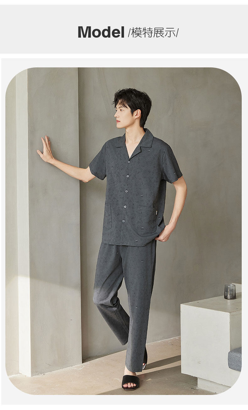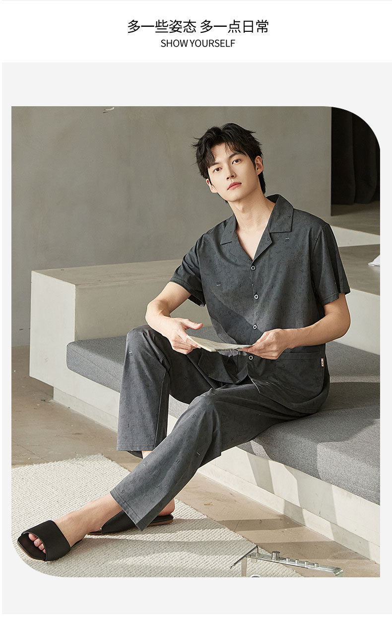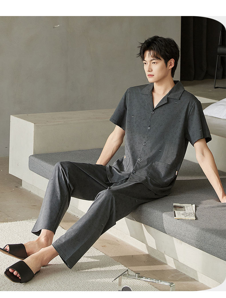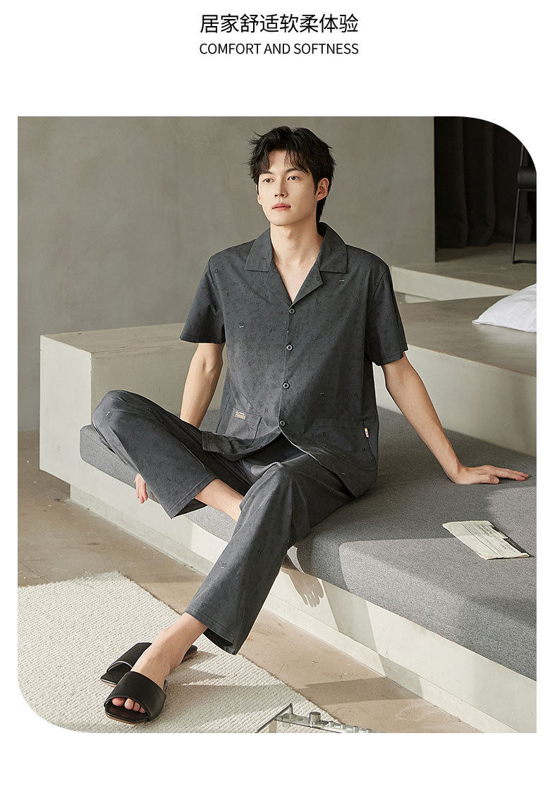 夏季男士睡衣纯棉短袖长裤可外穿爽棉中年翻领家居服开衫套装新款   JL-TMZ5523 商品图1