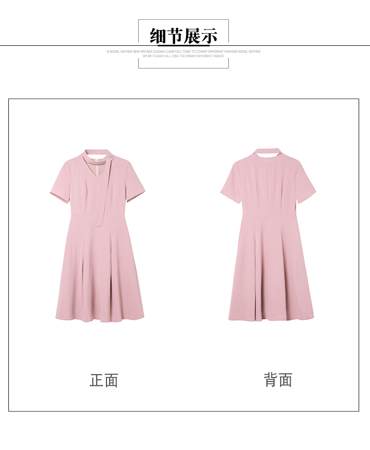 洛诗琳 新款女装胸针装饰飘带领短袖连衣裙子
