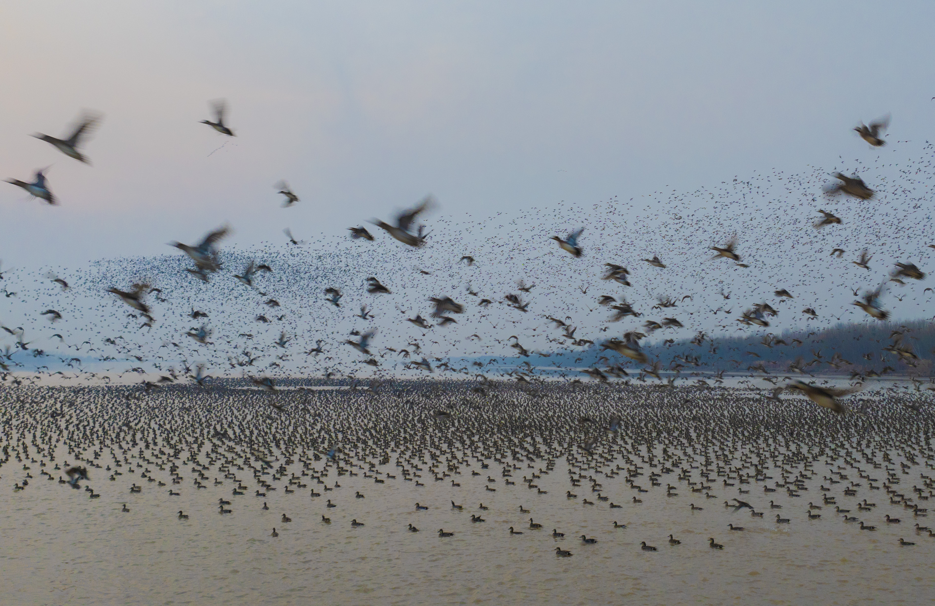 每年春末,冰雪消融,春回大地,丹东鸭绿江口湿地都有数以万计的候鸟从遥远的南方飞来。黑翅长脚鹬、砺鹬、滨鹬、环颈鸻、金眶鸻、翻石鹬等鸻鹬类涉禽的前锋队伍,还有大天鹅和翘鼻麻鸭等候鸟飞抵,掀起阵阵鸟浪。