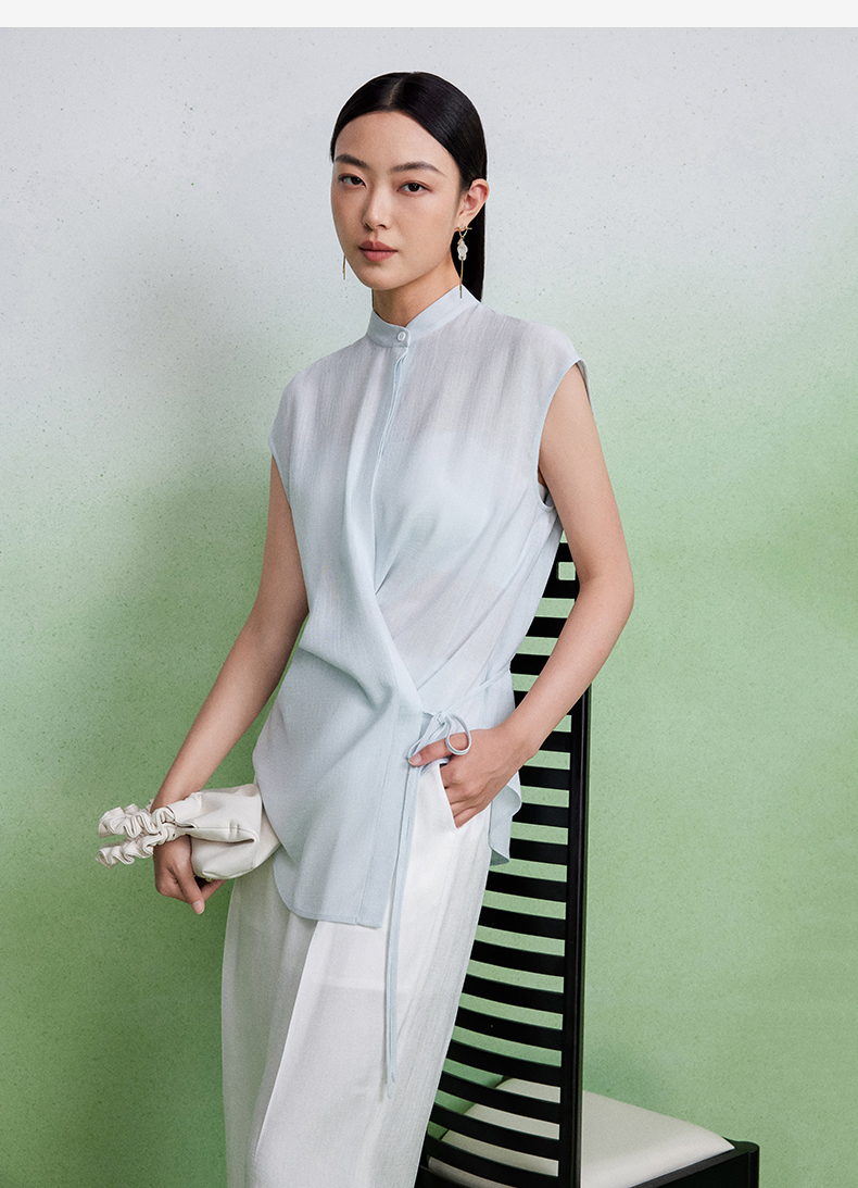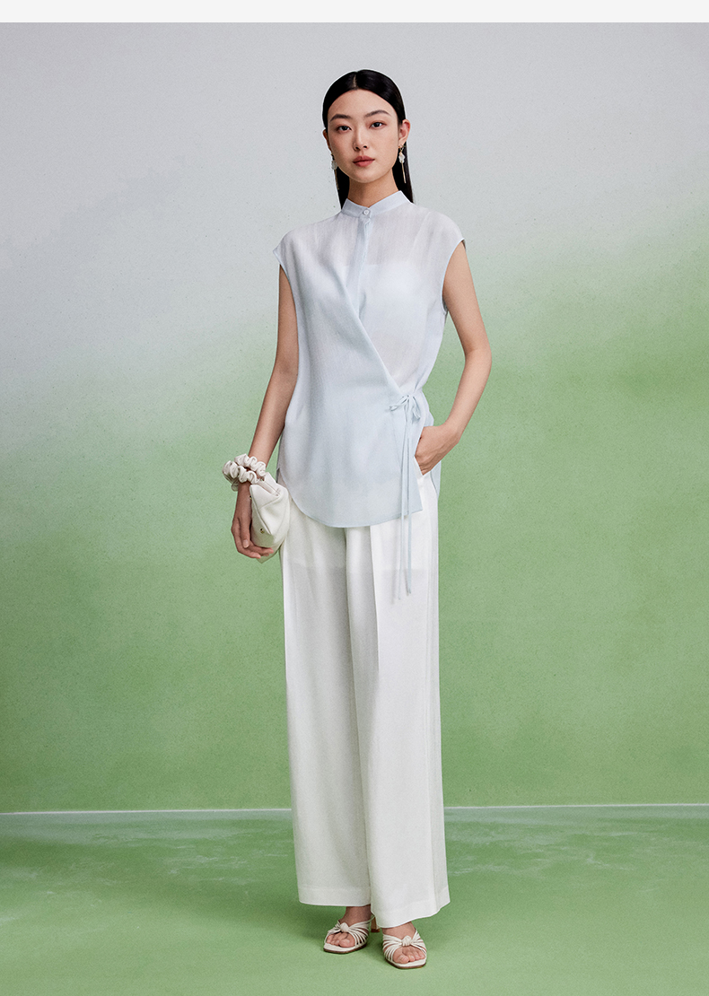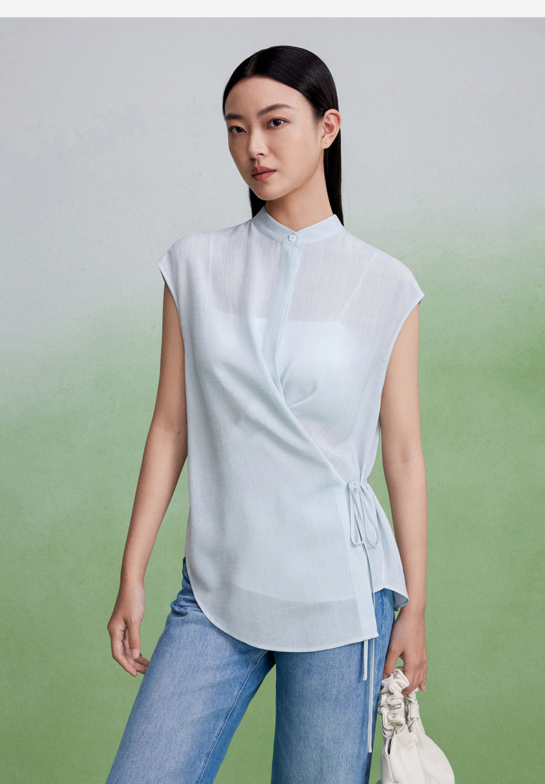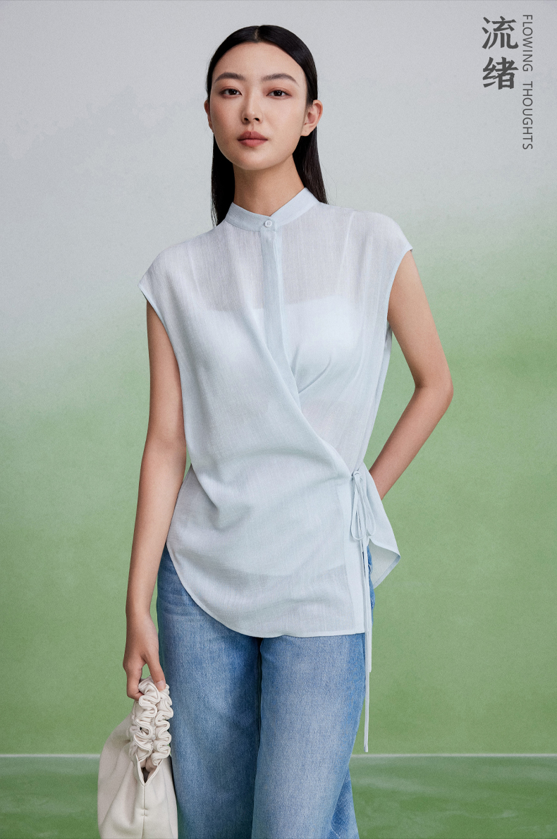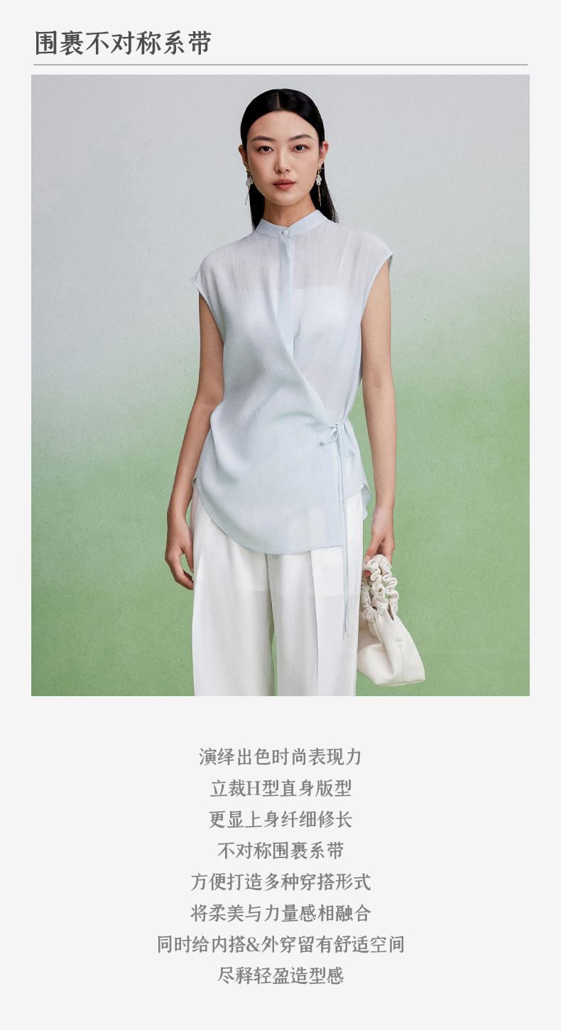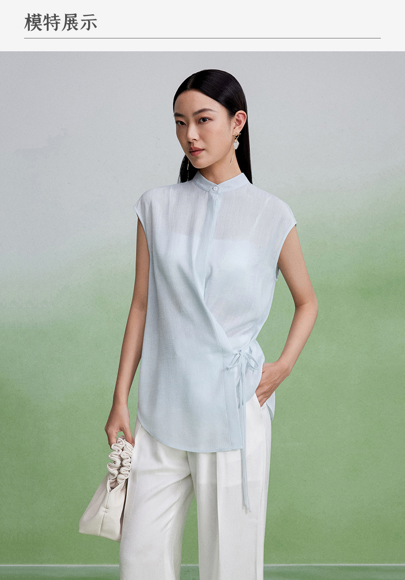 西嘉CS2402065C+IMPRESS/西嘉肌理感醋酸衬衫女夏围裹式小飞袖绑带立领气质上衣