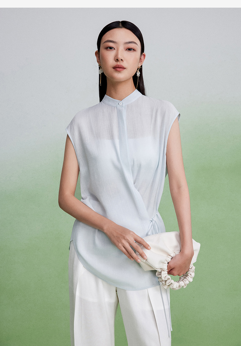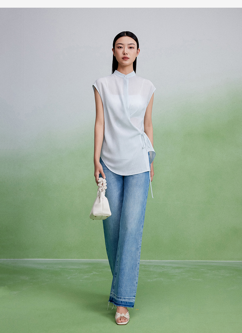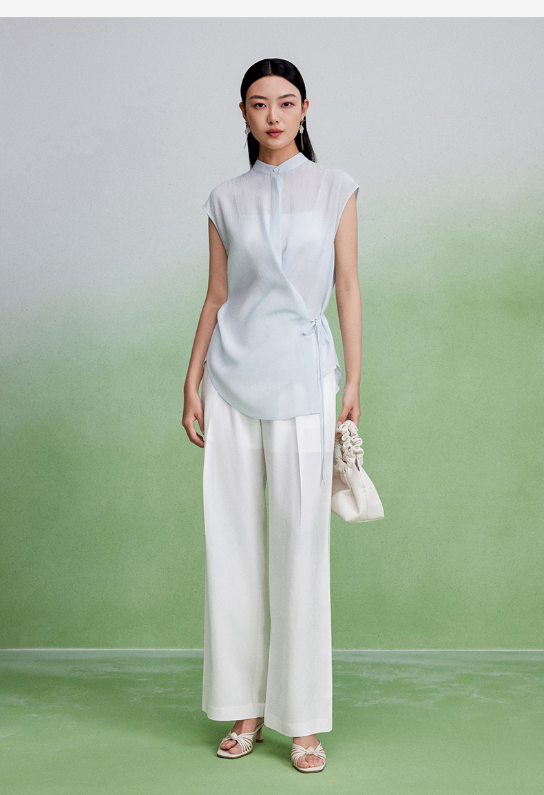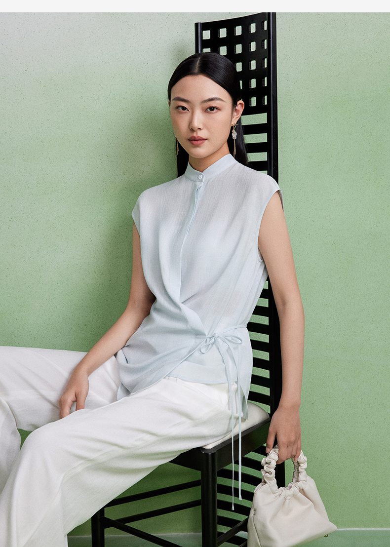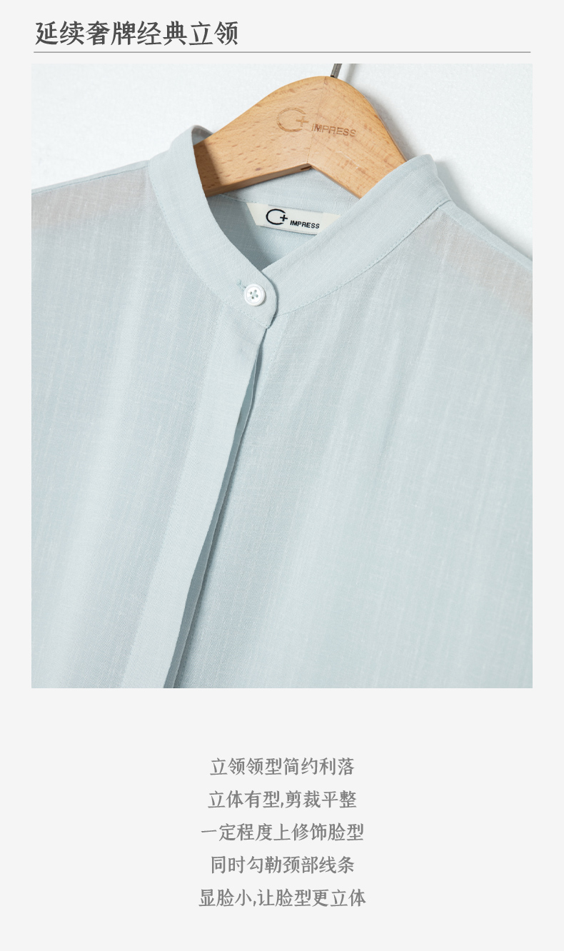 西嘉CS2402065C+IMPRESS/西嘉肌理感醋酸衬衫女夏围裹式小飞袖绑带立领气质上衣
