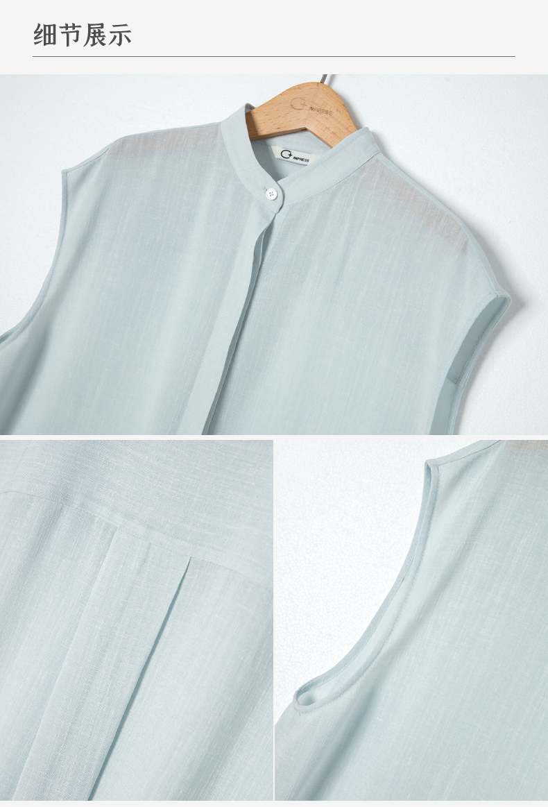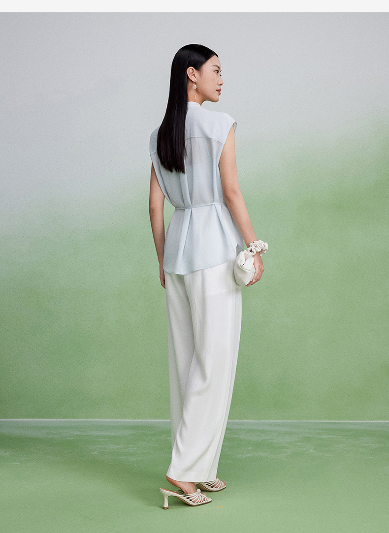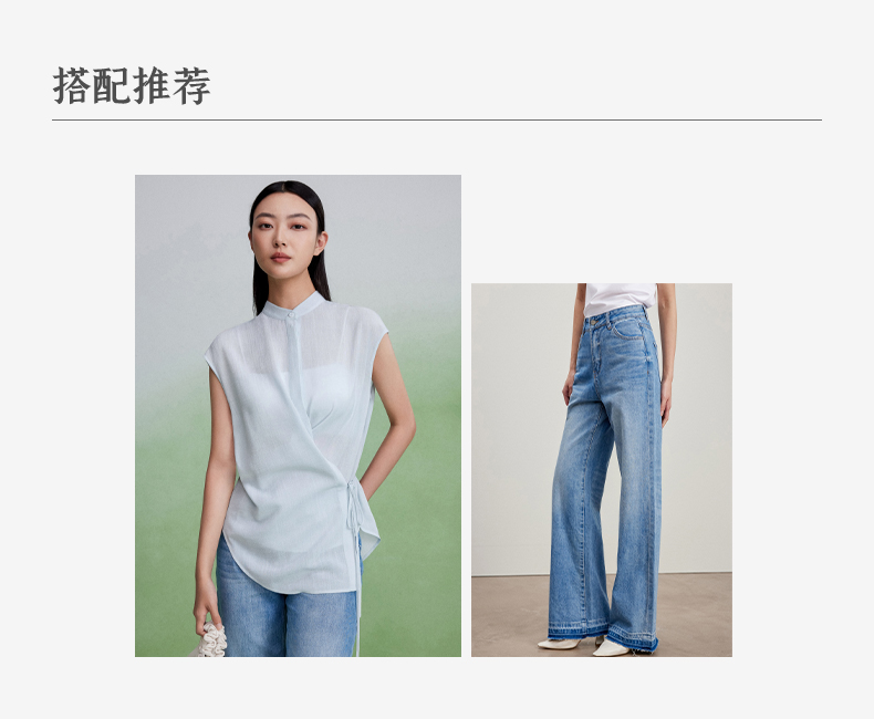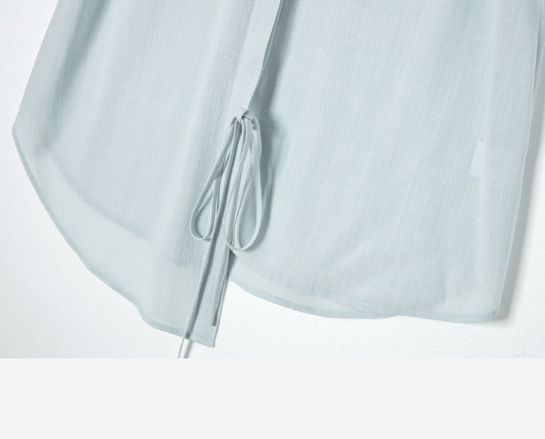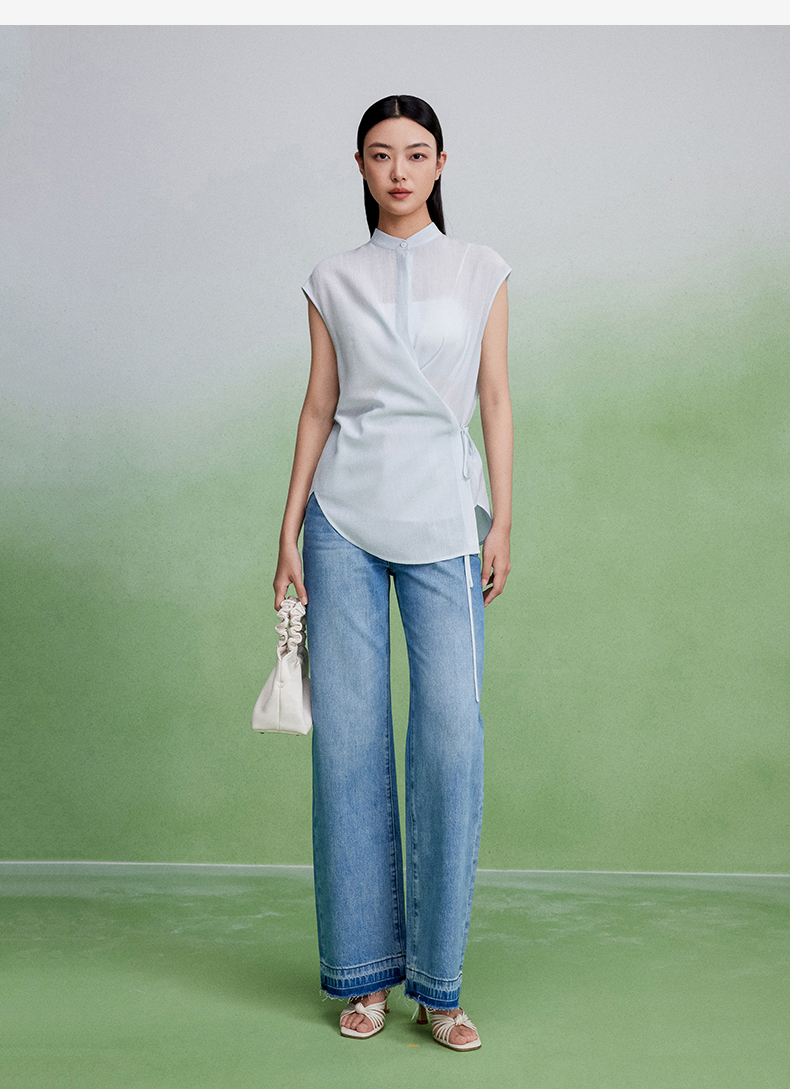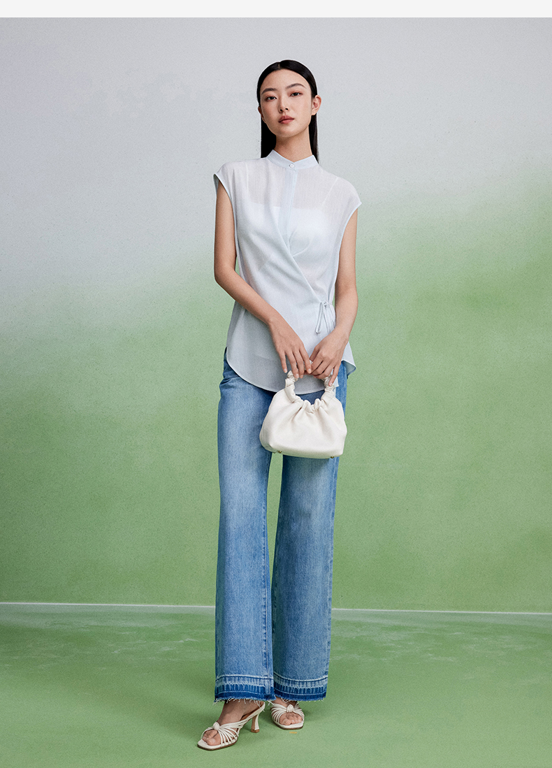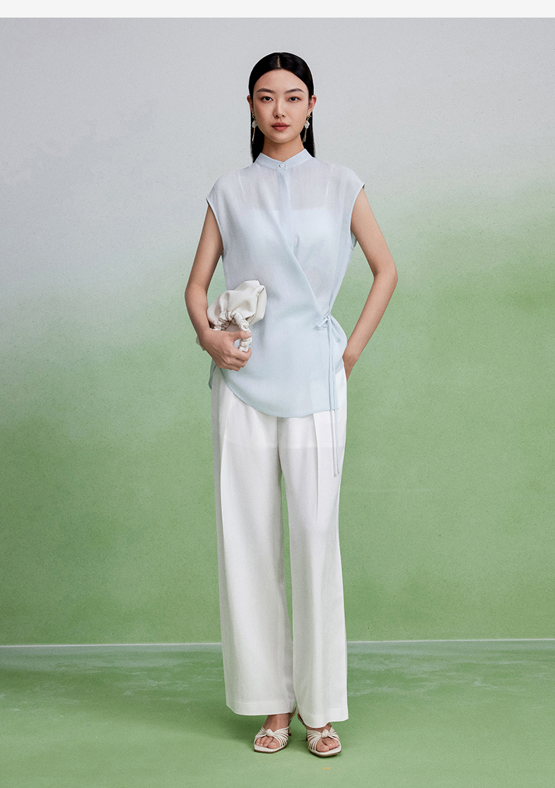 西嘉CS2402065C+IMPRESS/西嘉肌理感醋酸衬衫女夏围裹式小飞袖绑带立领气质上衣