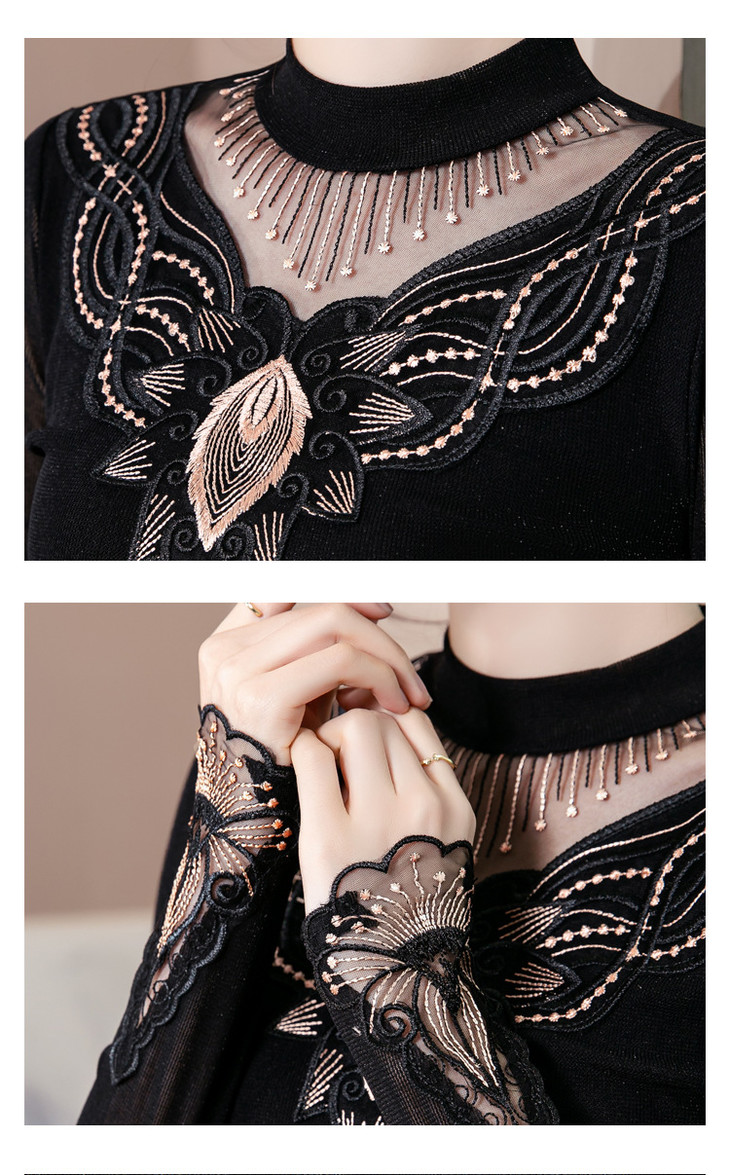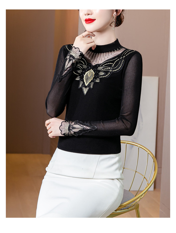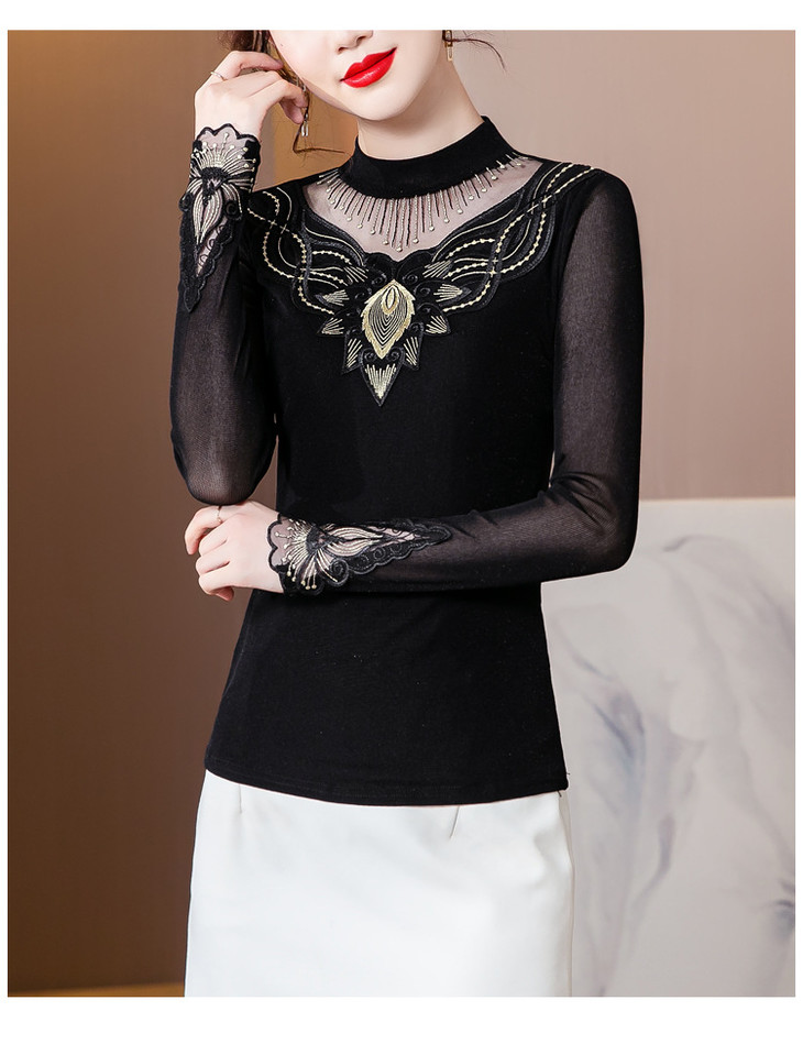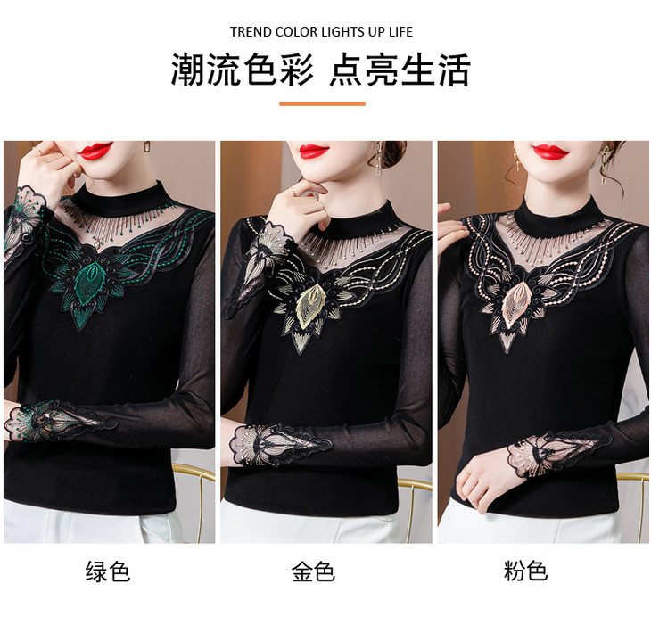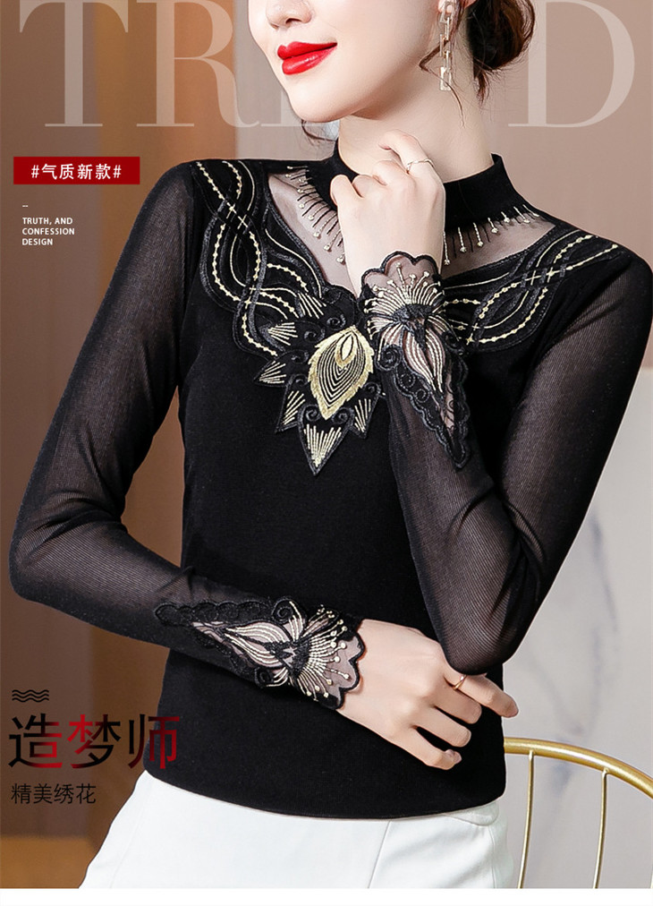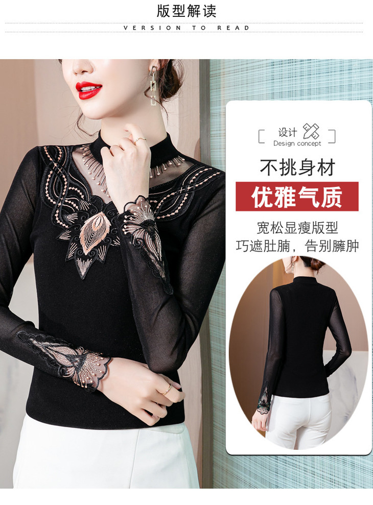 MZ115989新款亮丝网纱蕾丝半高领刺绣小衫上衣