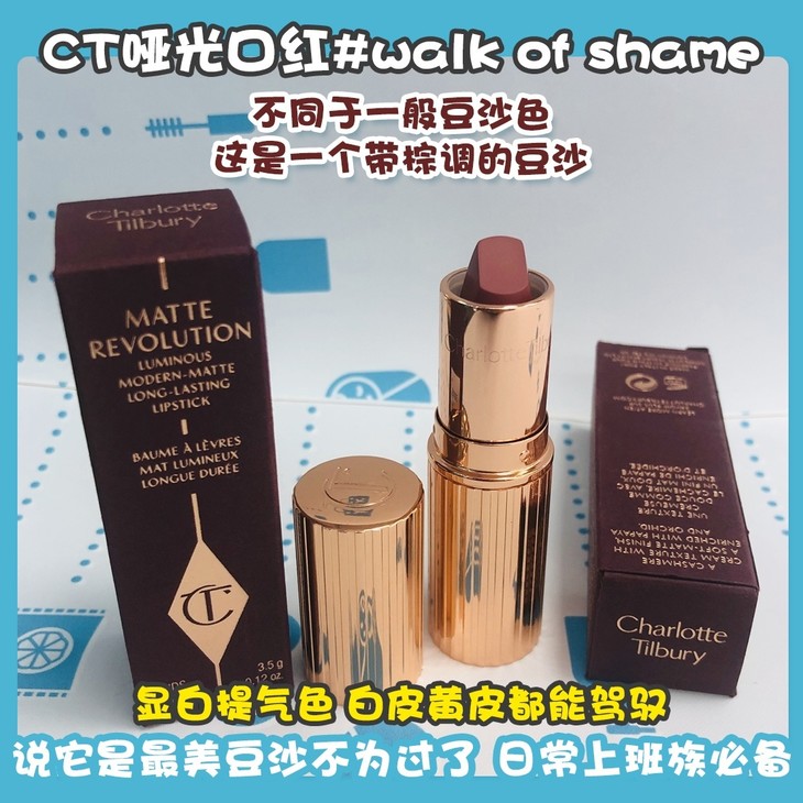 CT哑光口红#walk of shame👍这只玫瑰豆沙也太好看了吧😍,不同于一般豆沙色,这是一个带棕调的豆沙,显白提气色✨,白皮黄皮都能驾驭✔。上嘴真的是又温柔又气质👄,爆炸好看❗说它是最美豆沙不为过了,日常上班族必备,搭配职业妆容超适合👛!