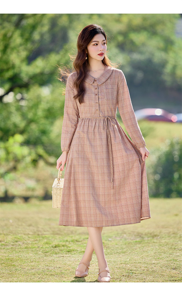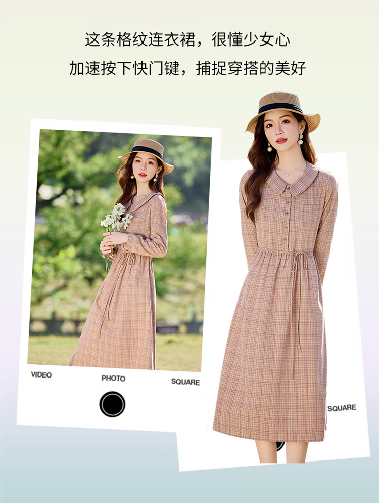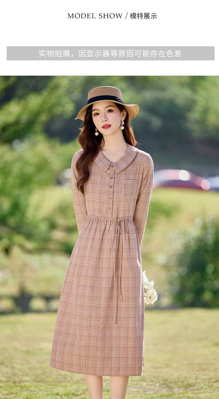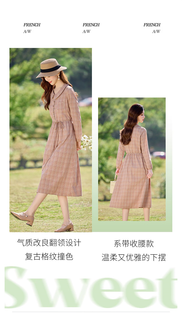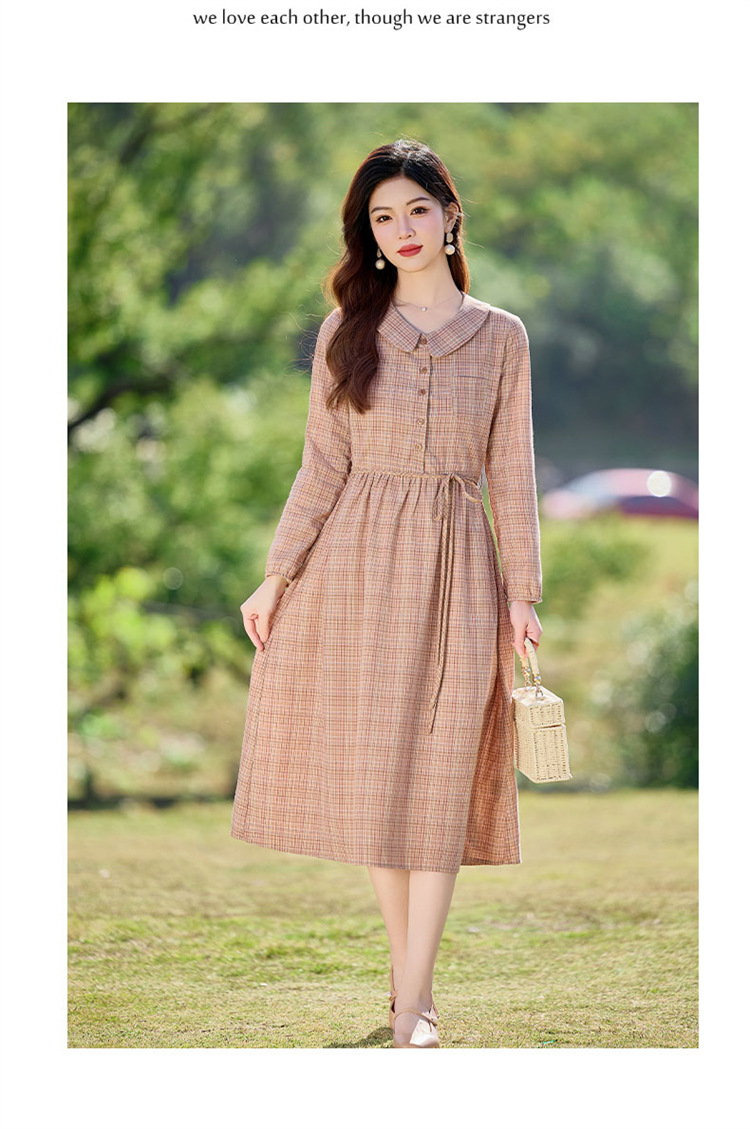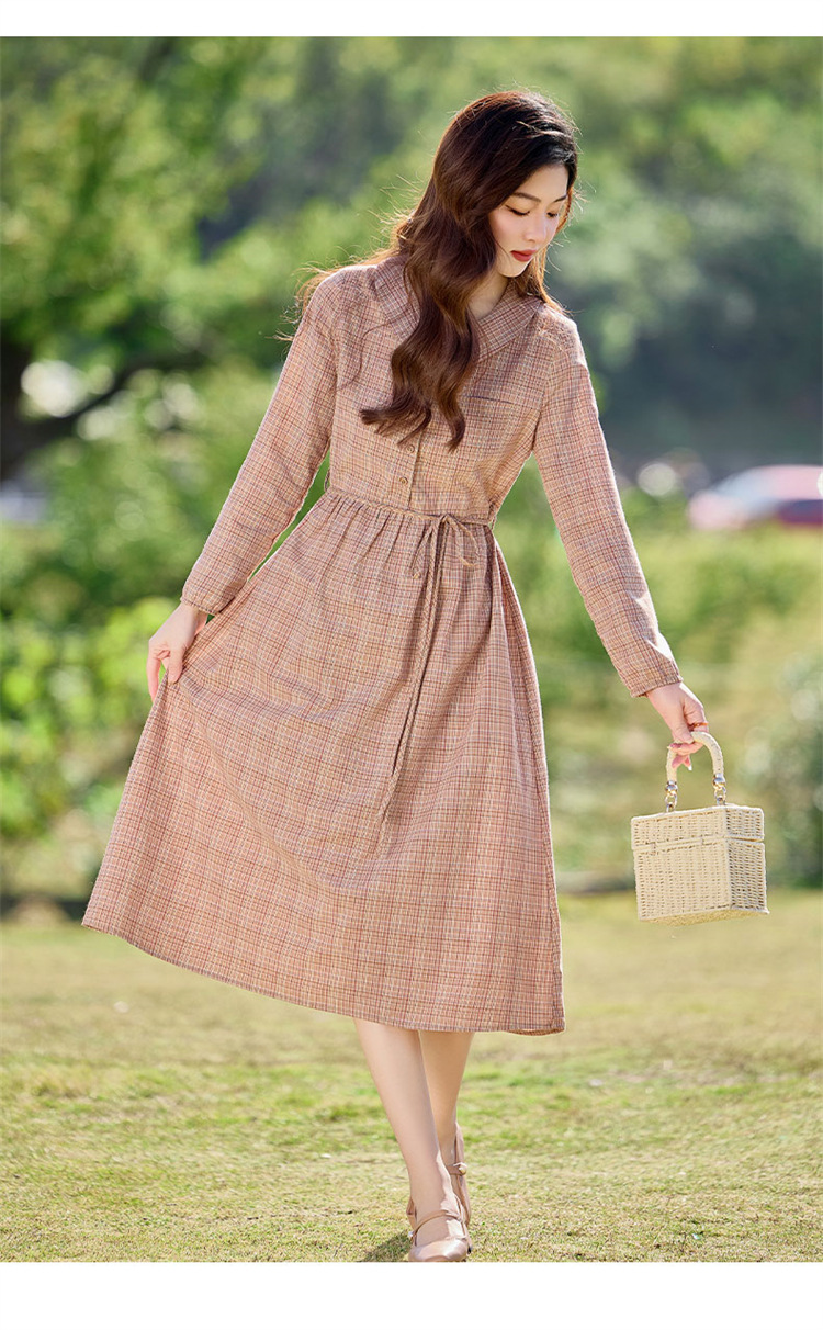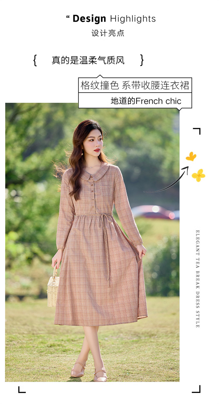 HR-SYY2676文艺格子中长裙春季2025优雅收腰复古系带长袖格纹气质显瘦连衣裙